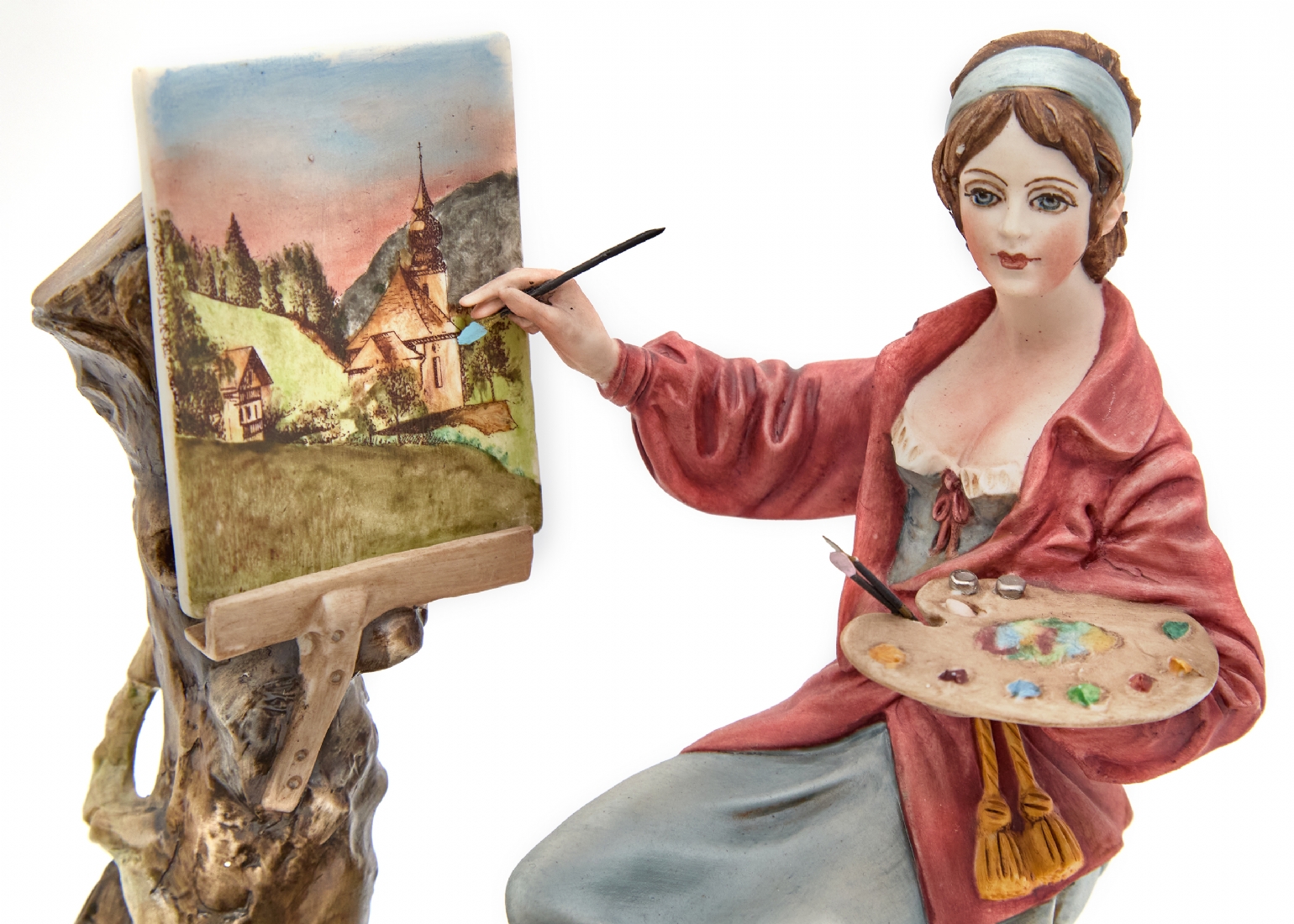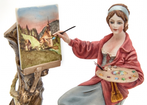 פסל פורצלן של אמנית מול כן ציור, חתום בבסיס