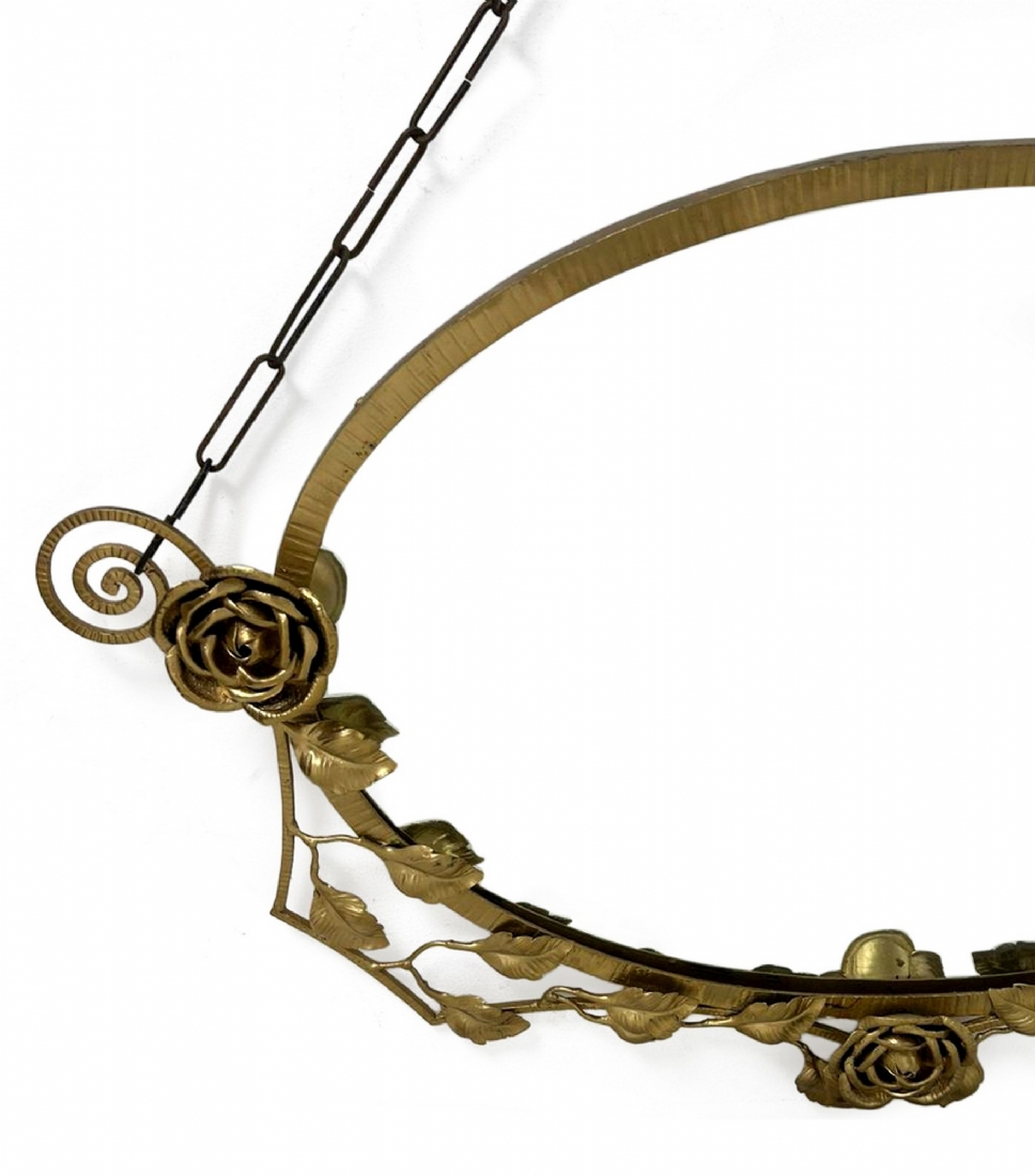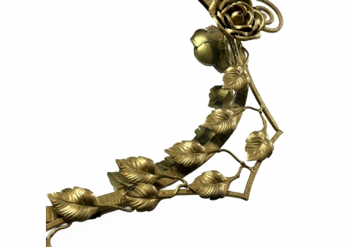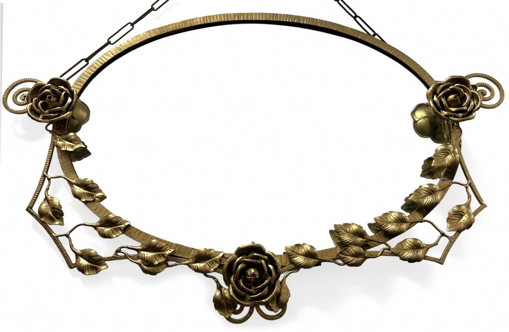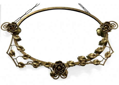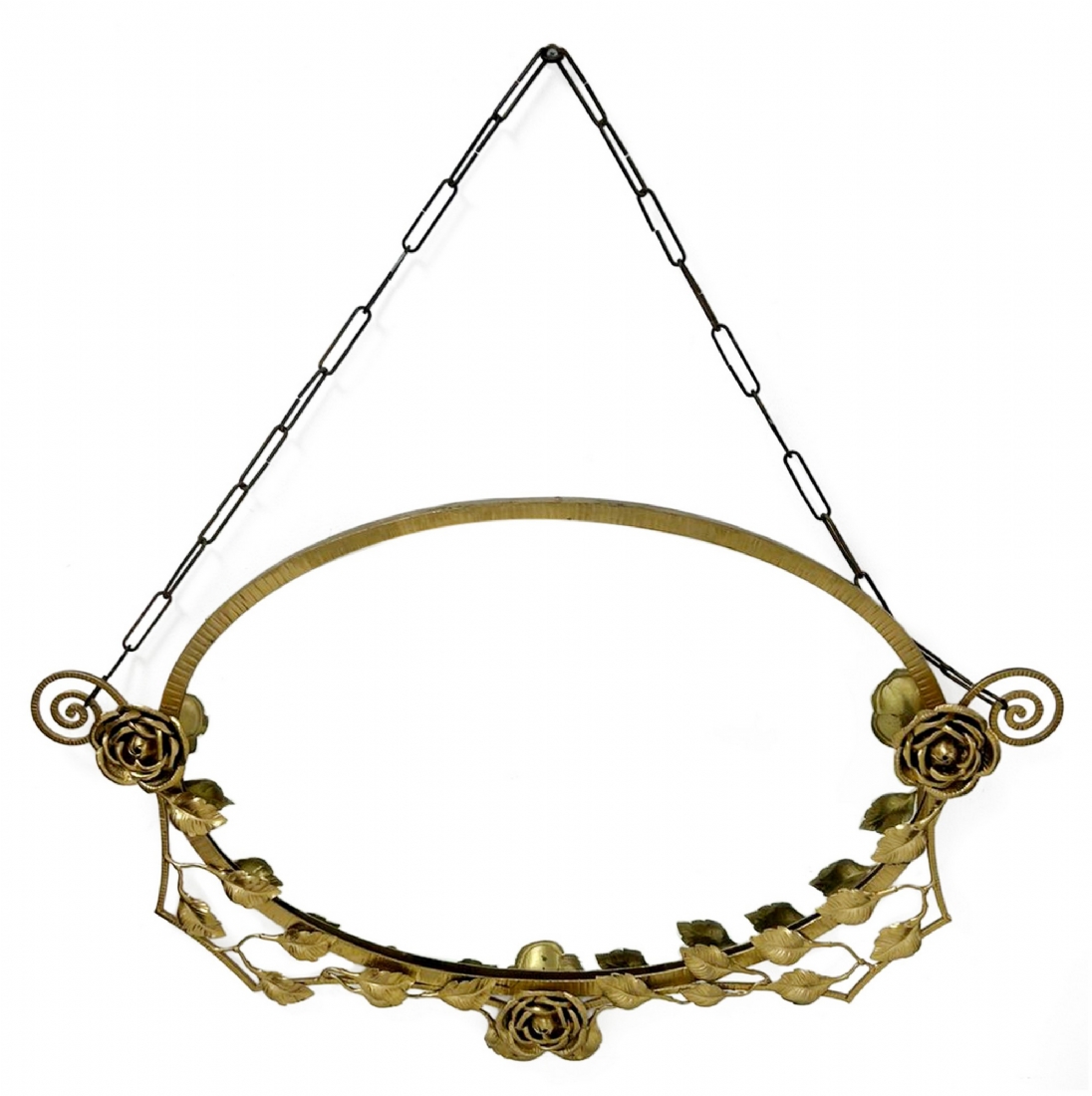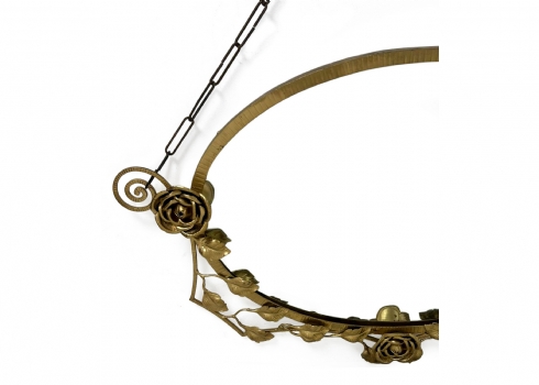 שרשרת תלייה מתכתיתפגם בחיבור של עטרת העלים המתכתית למסגרת, צריך להלחים או להדביק.רוחב: 95 ס"מגובה: 51 ס"מ