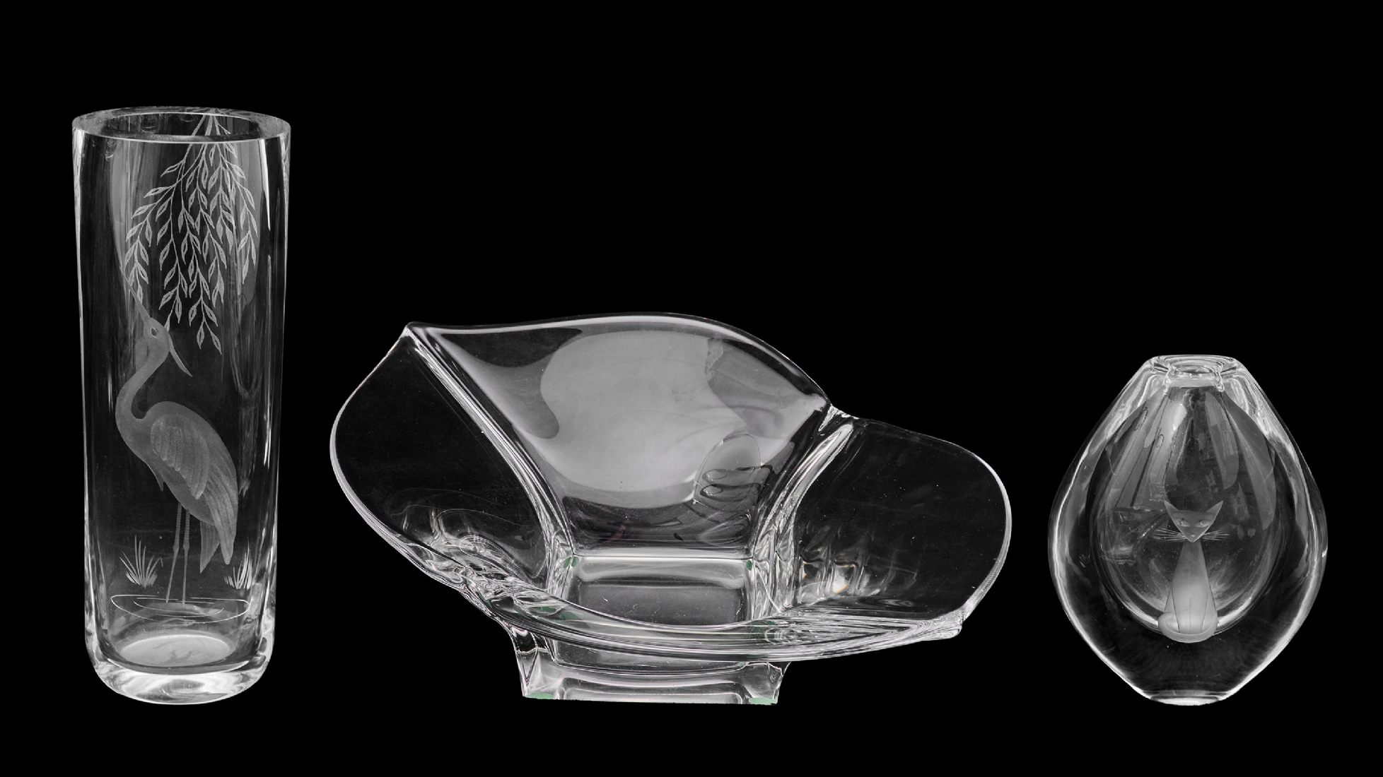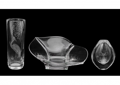 שלושה פריטי קריסטל אגרטל Stuart Strathearn אגרטל Orrefors, וקערת קריסטל