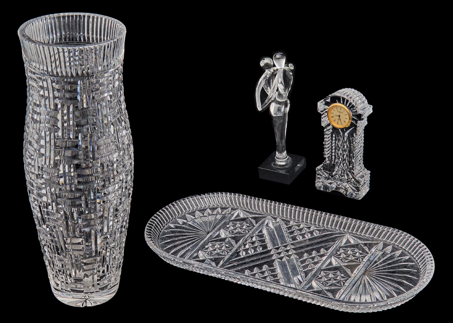 ארבעה פריטי זכוכית וקריסטל - מגש חתוך, פסל מודרני, אגרטל קריסטל ושעון Waterford
