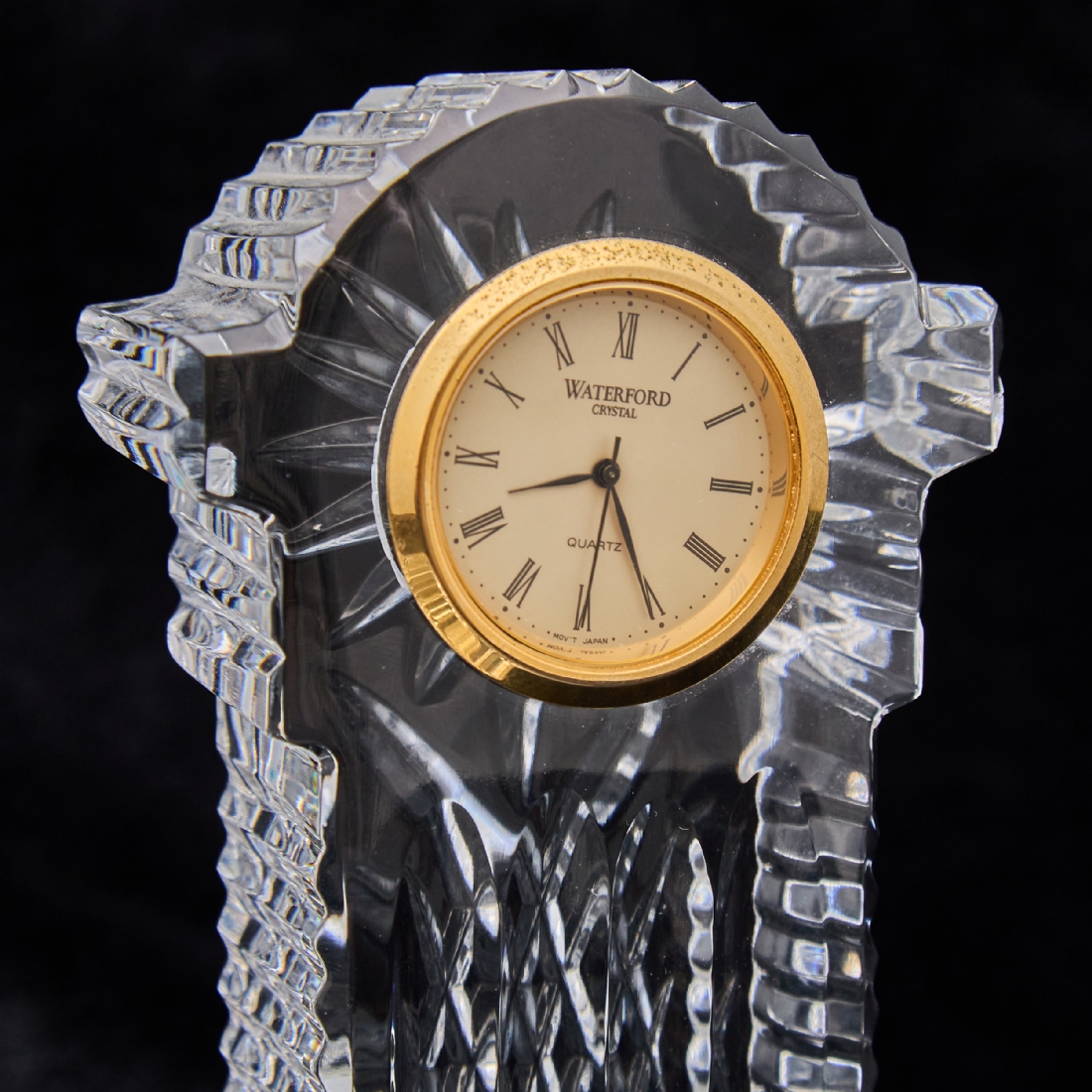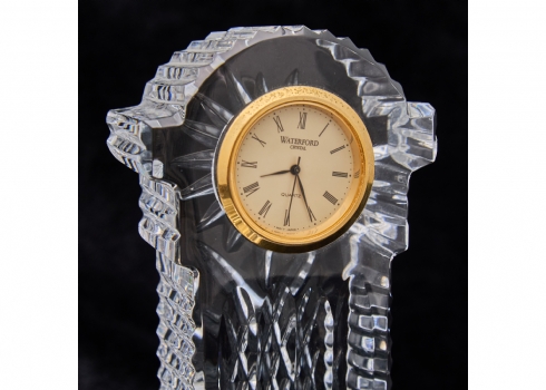 שעון שולחני מעוצב מקריסטל מלוטש של Waterford, עם חזית זהובה ומנגנון קוורץ