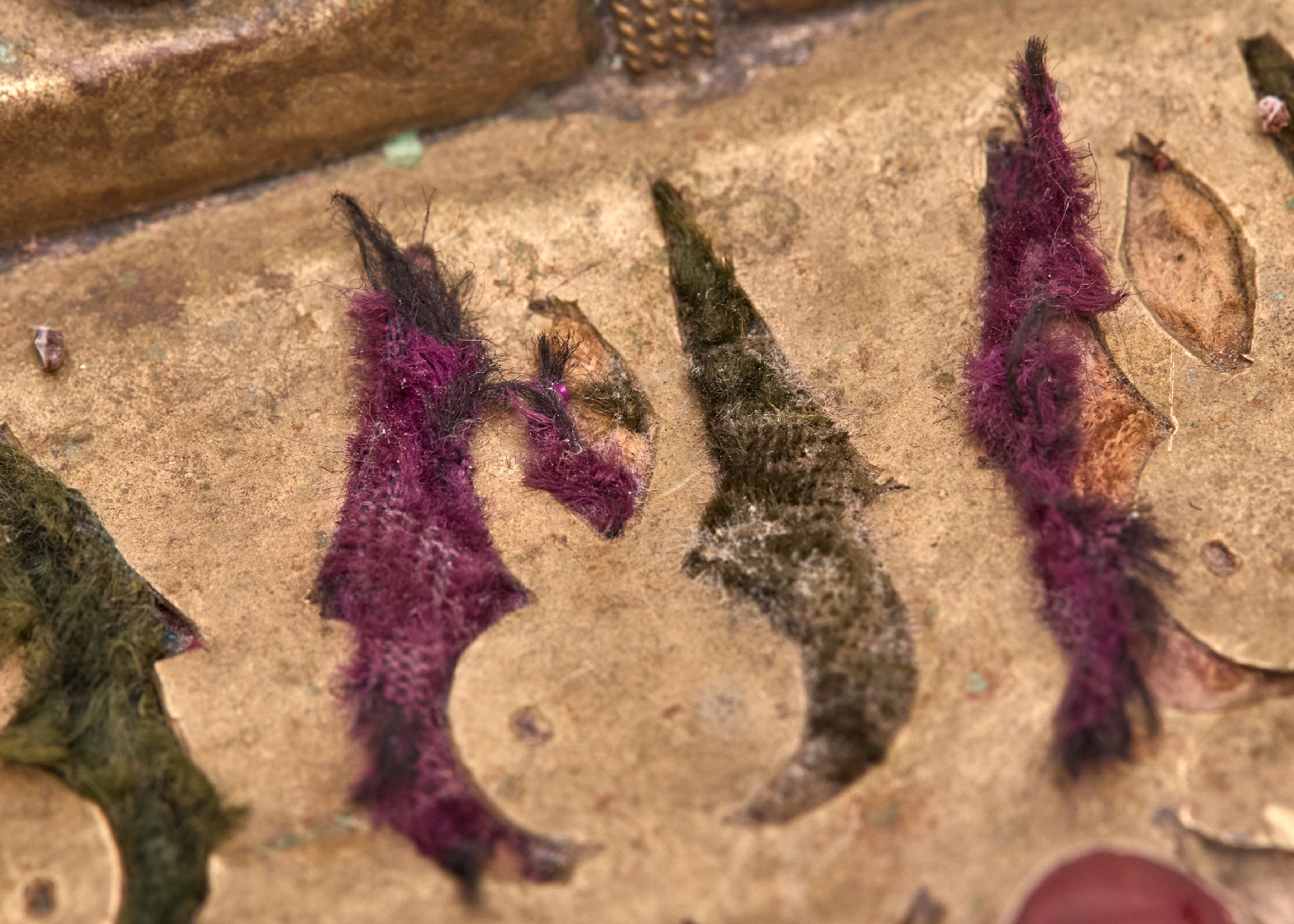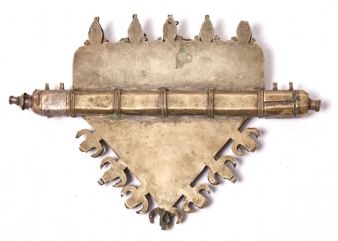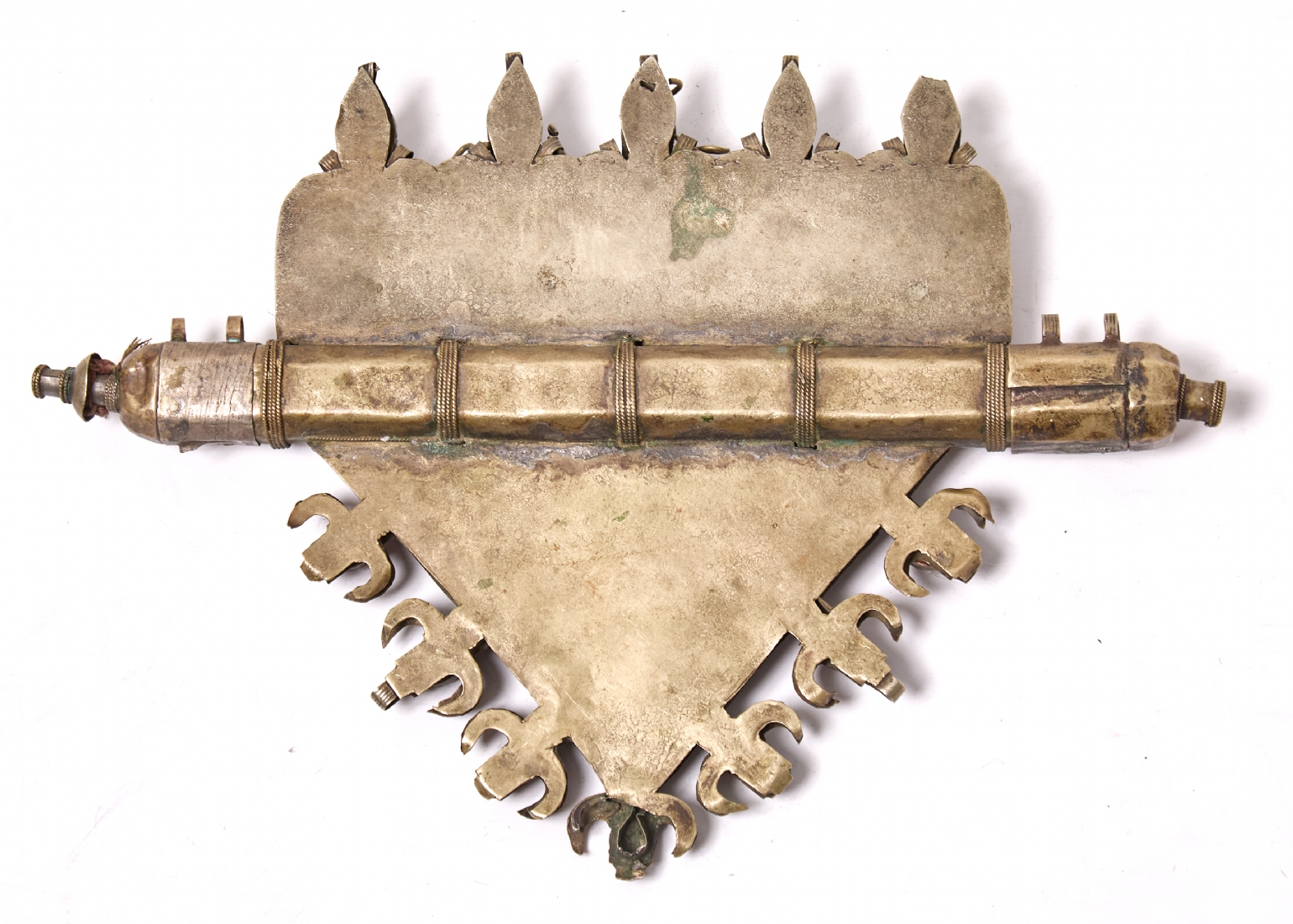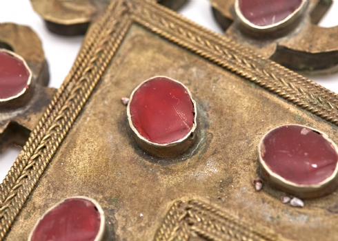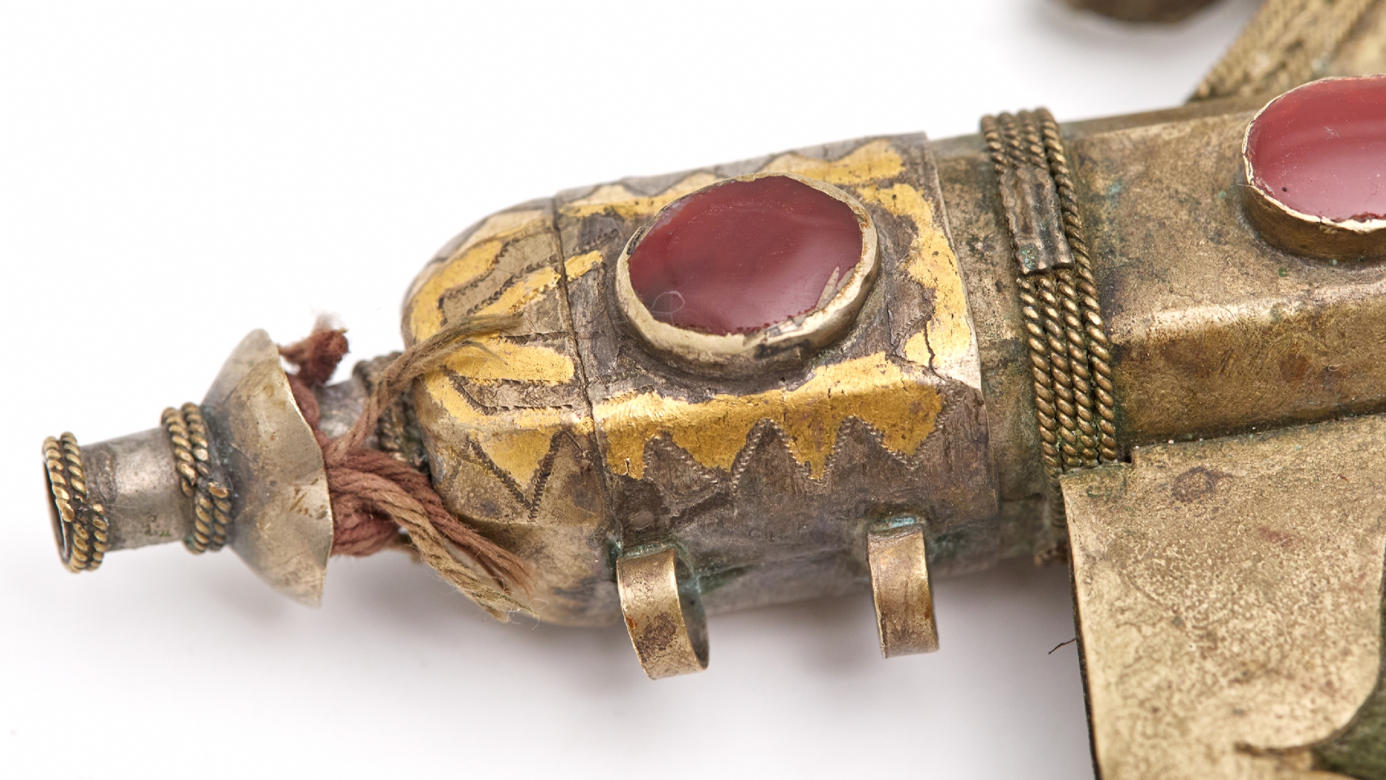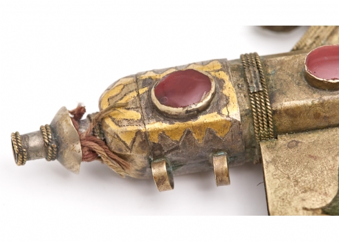 תכשיט בית קמע גדול ומרשים בסגנון טורקמני עשוי מתכת ומשובץ אבנים ופיסות בד