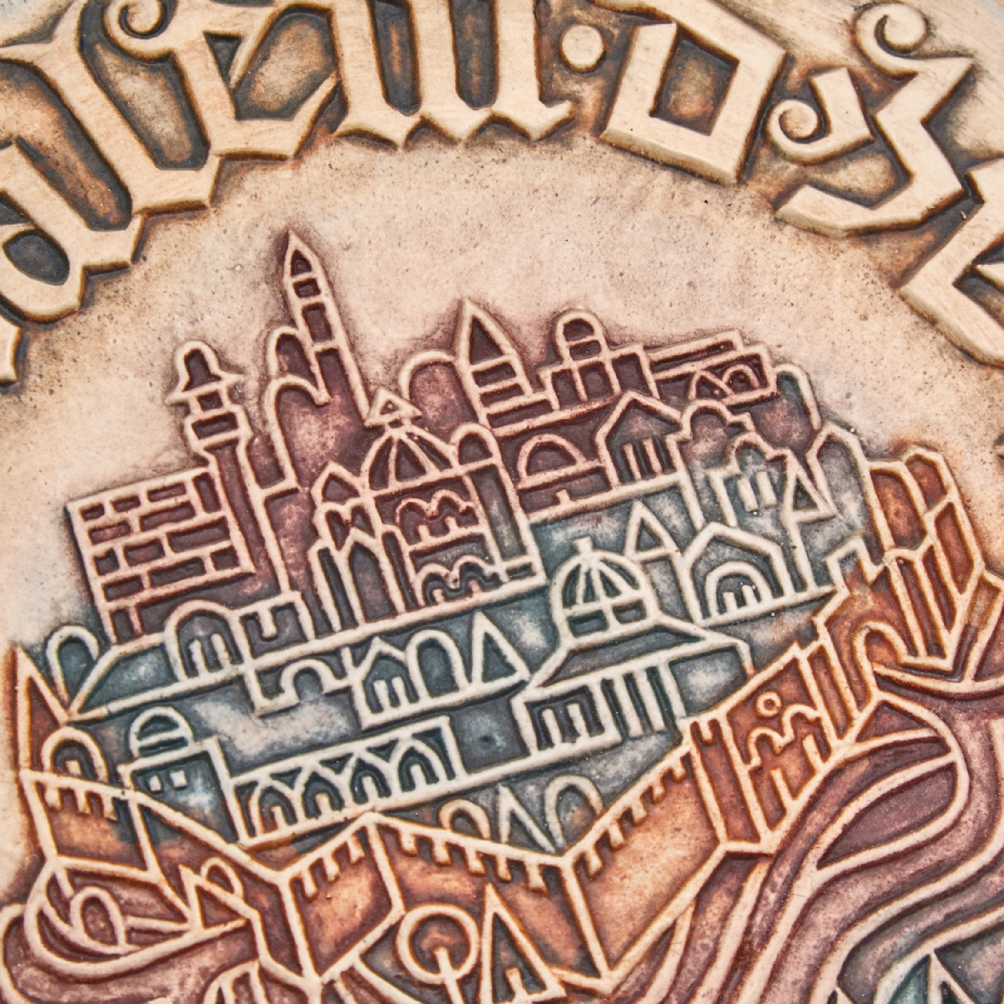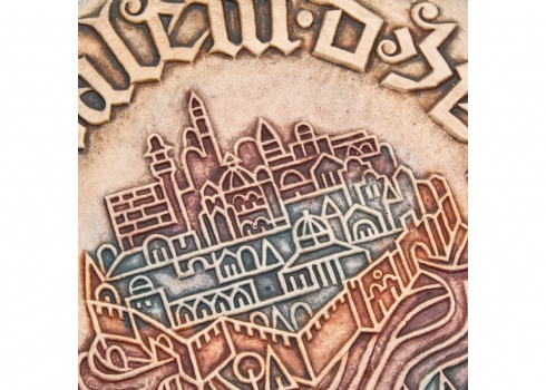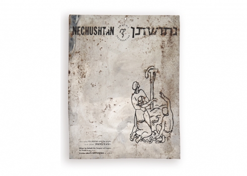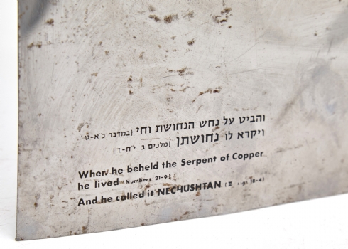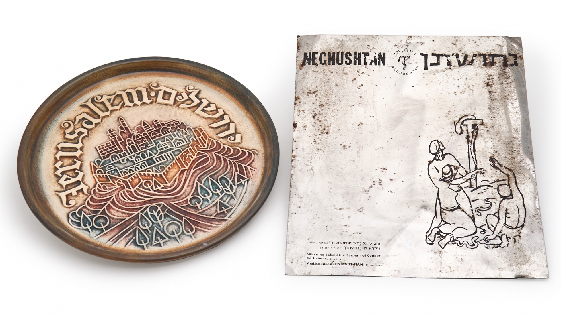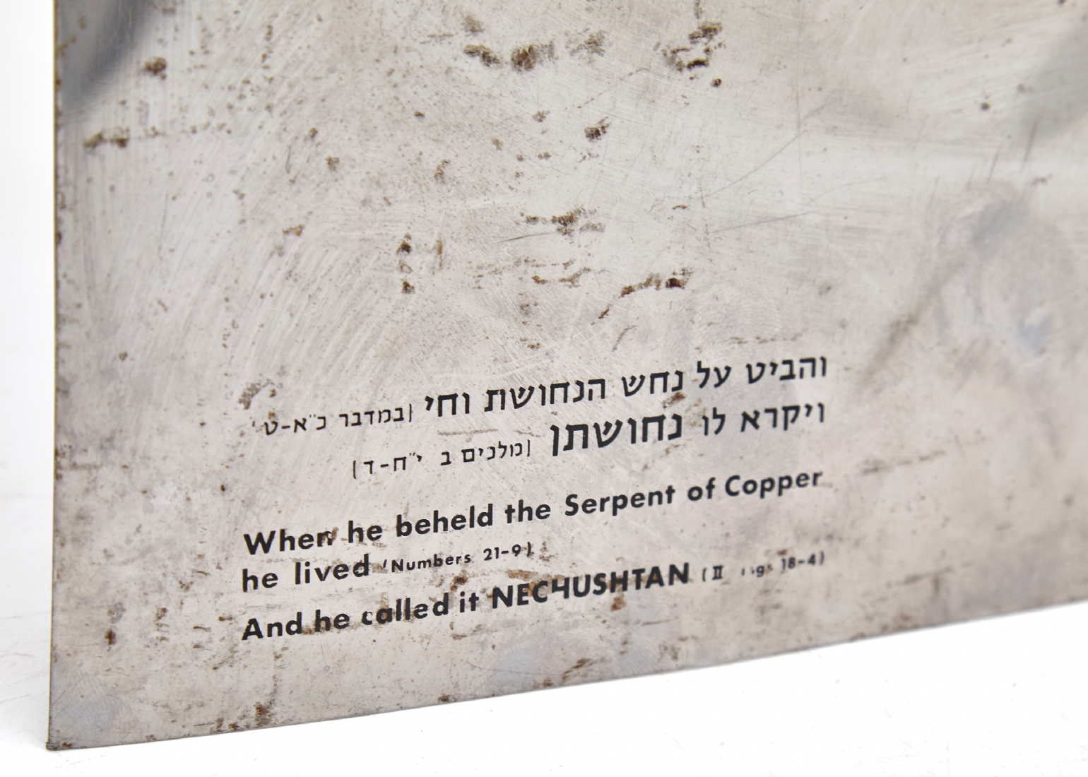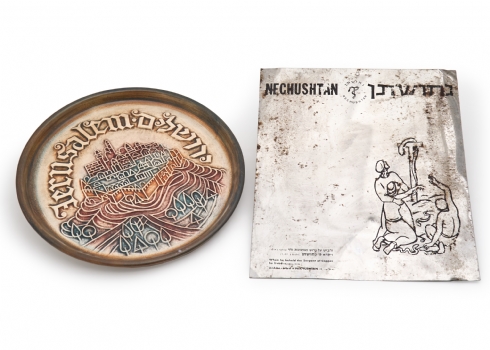 צלחת קיר וינטג' מתוצרת בית היוצר, עיטור תבליט צבעוני של ירושליםלוח מתכת – “נחש הנחושת” (Nechushtan)