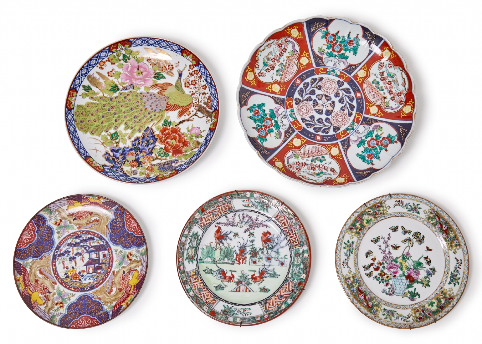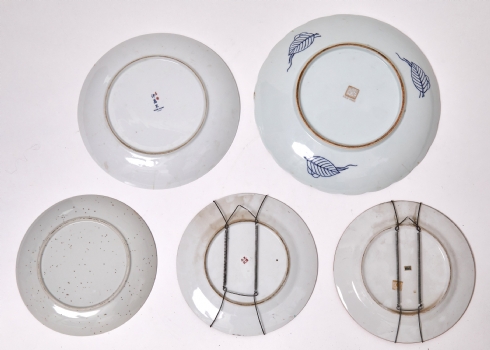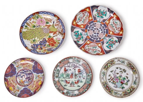 חמש צלחות גדולות פורצלן יפניות וסיניות מעוטרות, חלקן חתומות