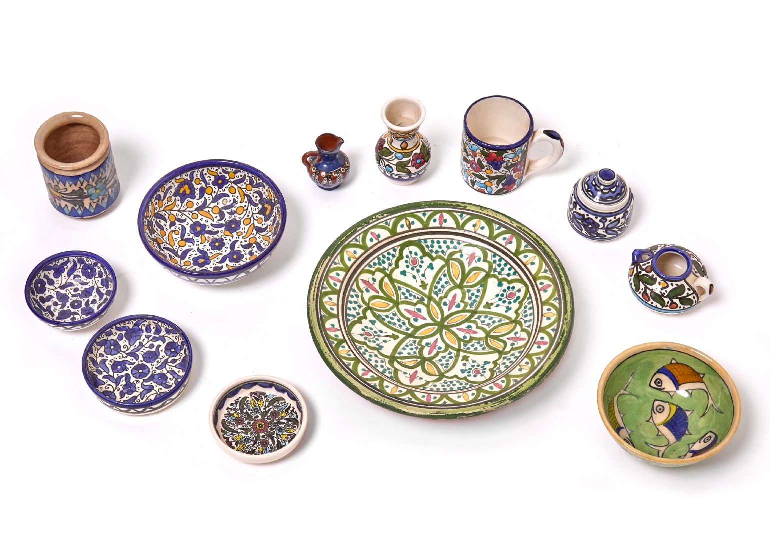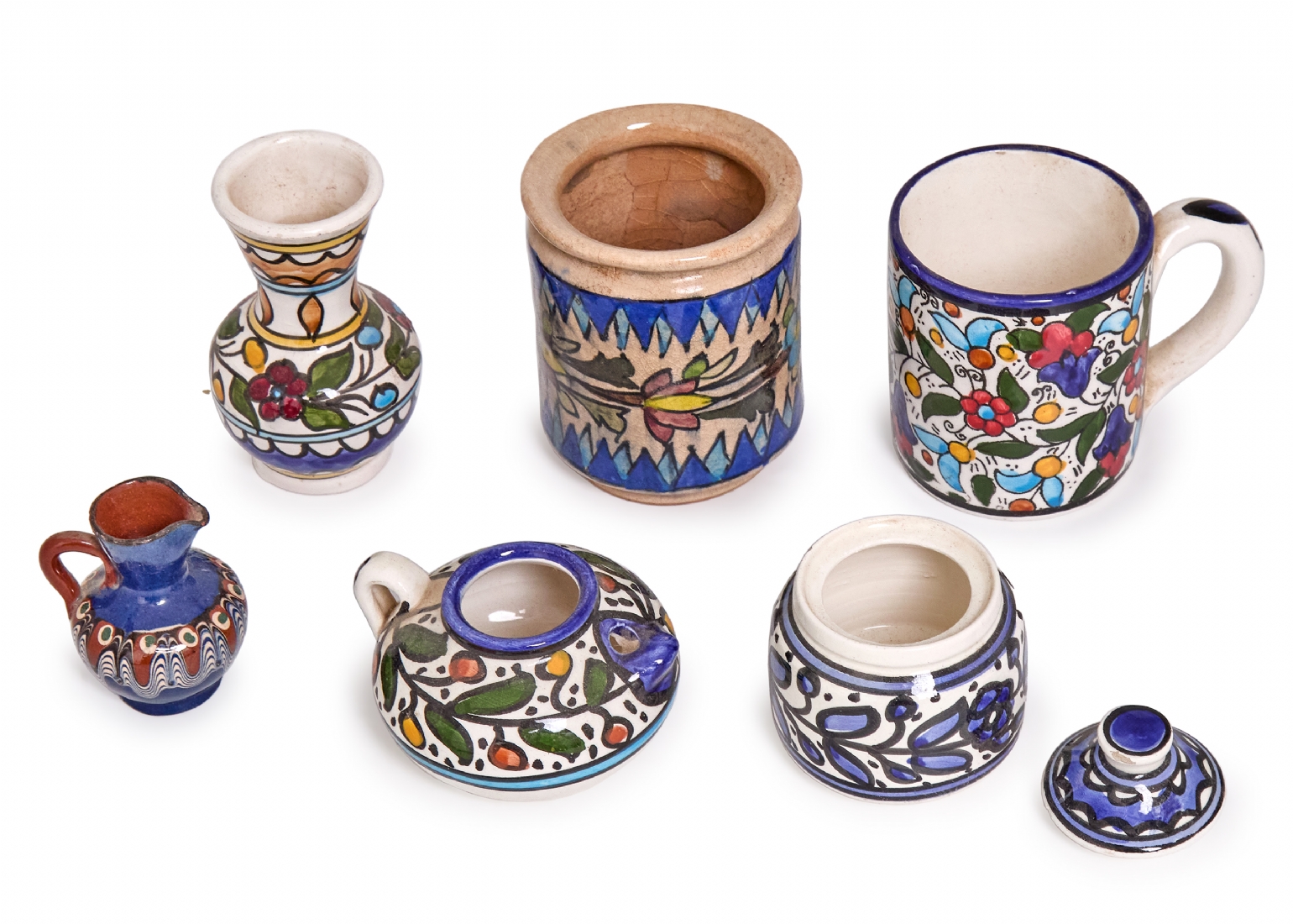 לוט חפצים שונים עשויים חרס חלק מקרמיקה ארמנית וחלקם מרוקו ופרס, מעוטרים עבודת יד