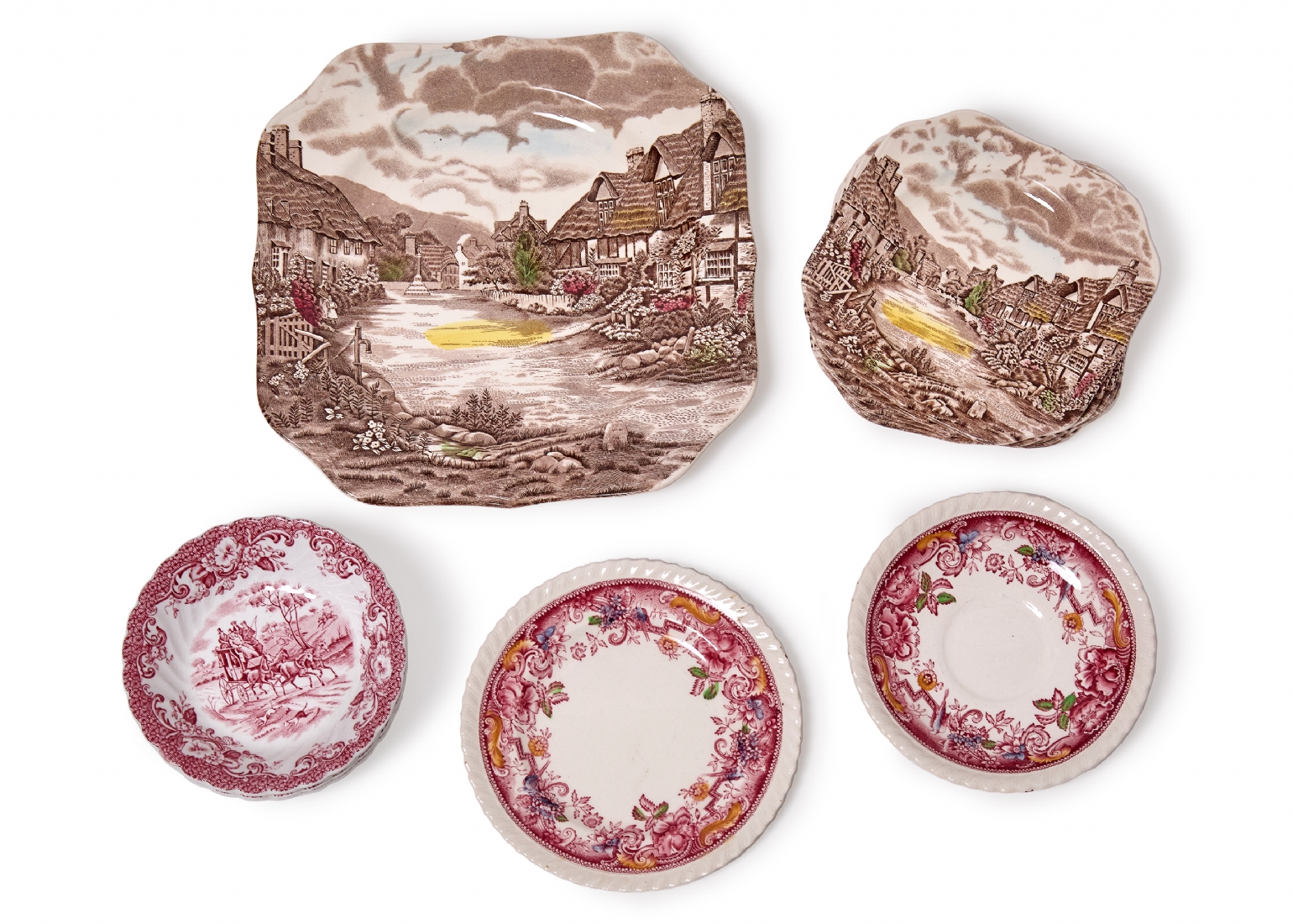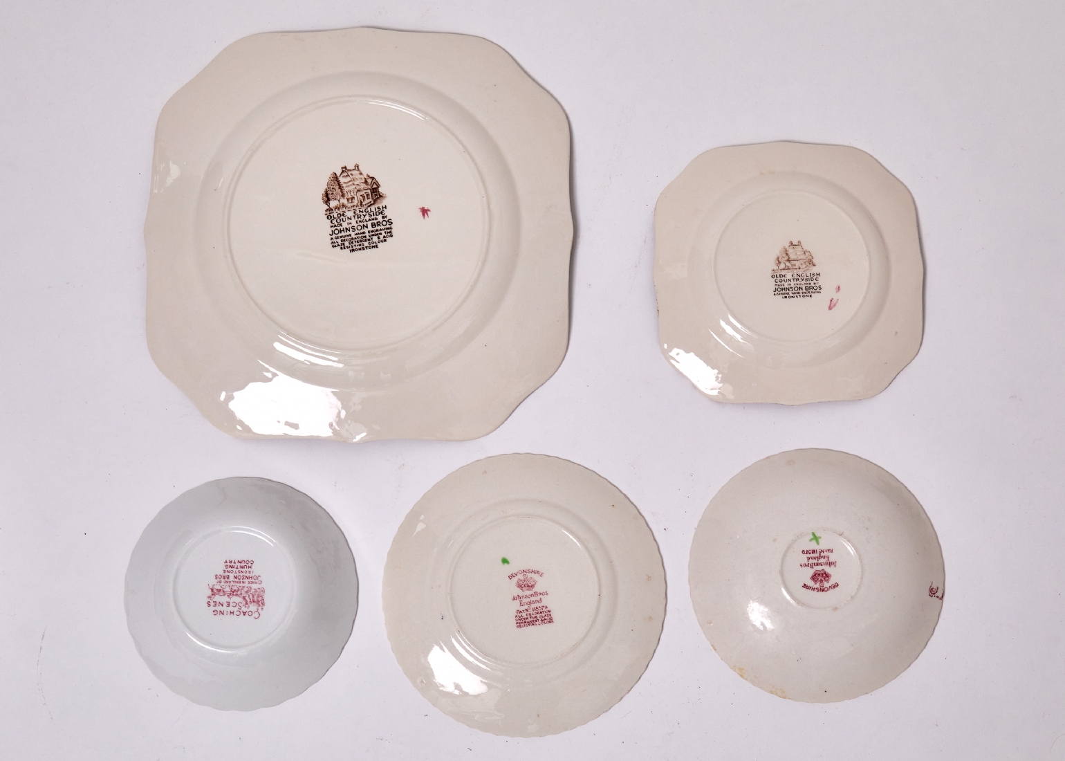 שלוש עשרה צלחות חרס אנגליות תוצרת ג'ונסון ברדרס, מעוטרות בהדפס מועבר