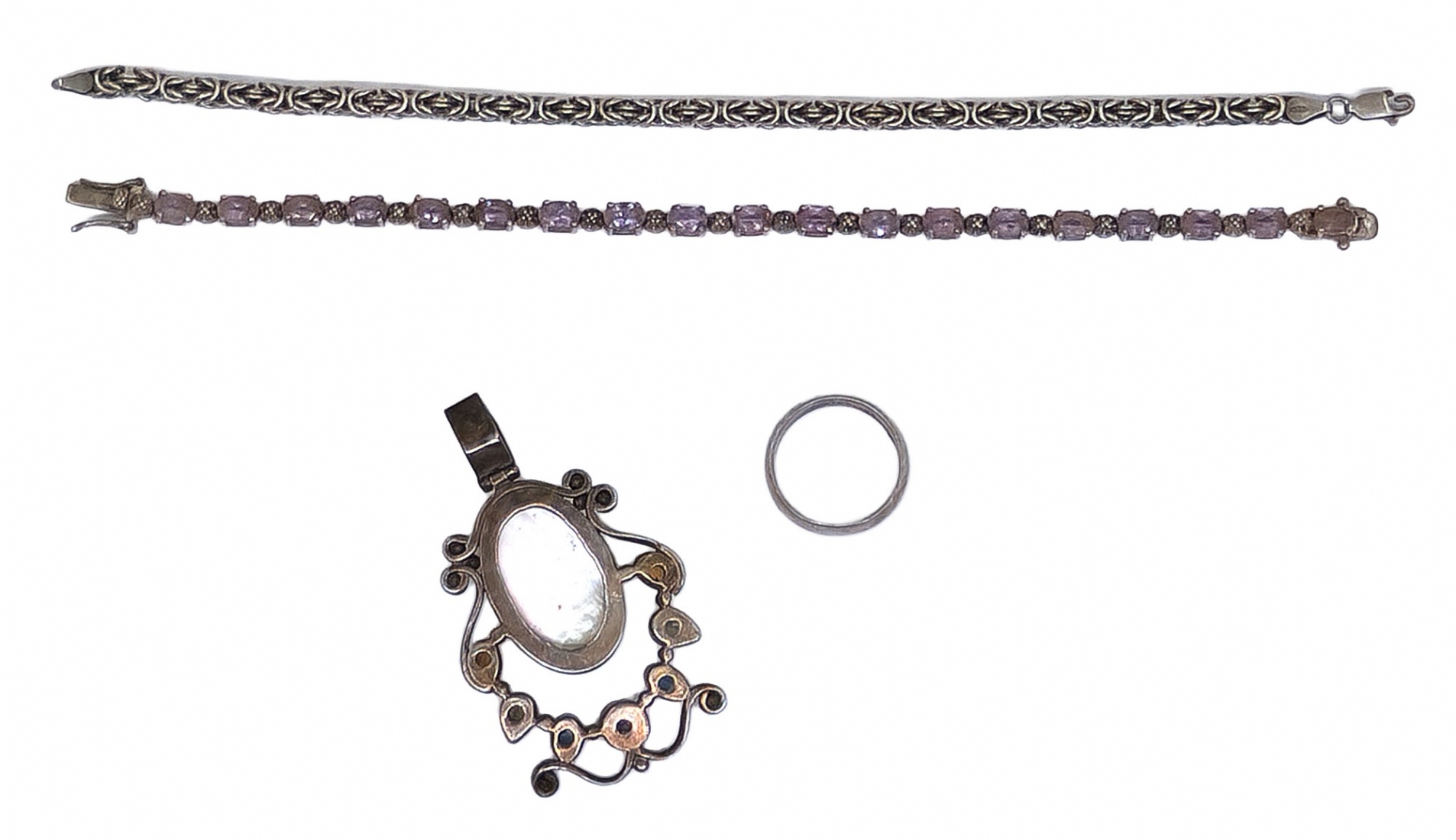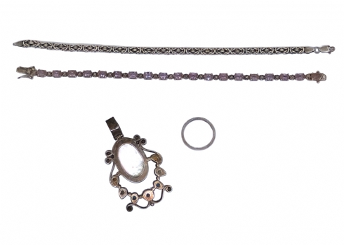 הכולל שני צמידים, טבעת ותליון משובץ