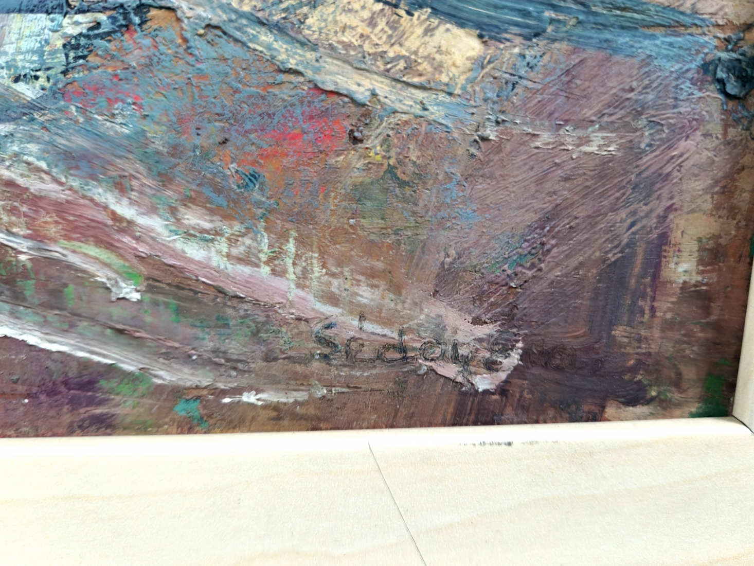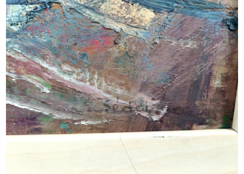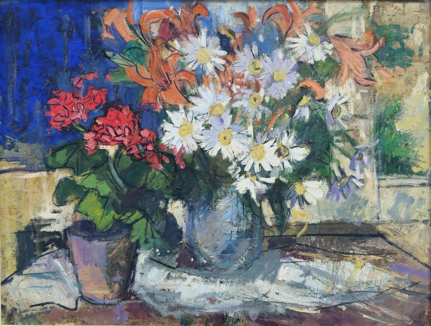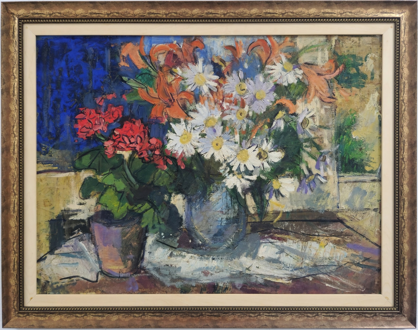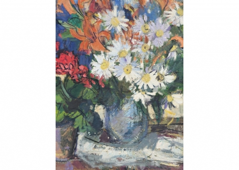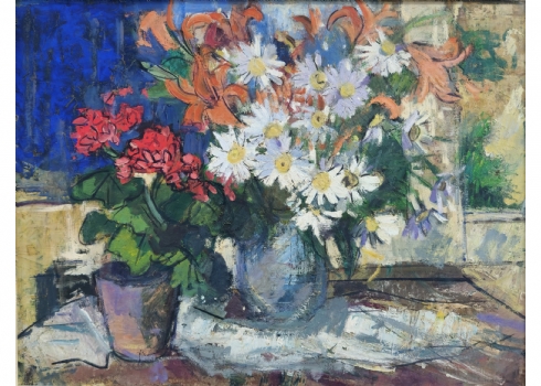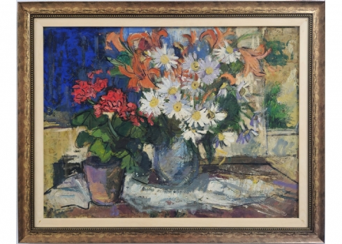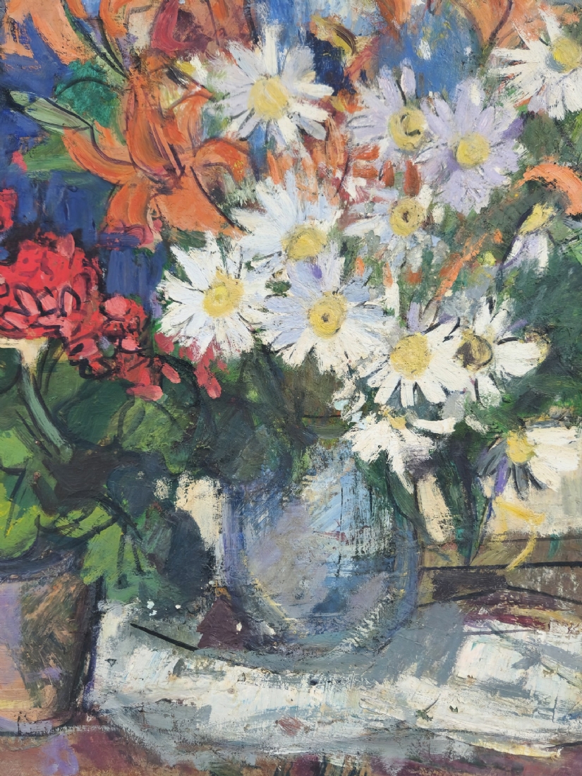 'פרחים באגרטל ועציץ', ציור גדול ויפה, שמן על לוח חתום, אמן לא מזוהה