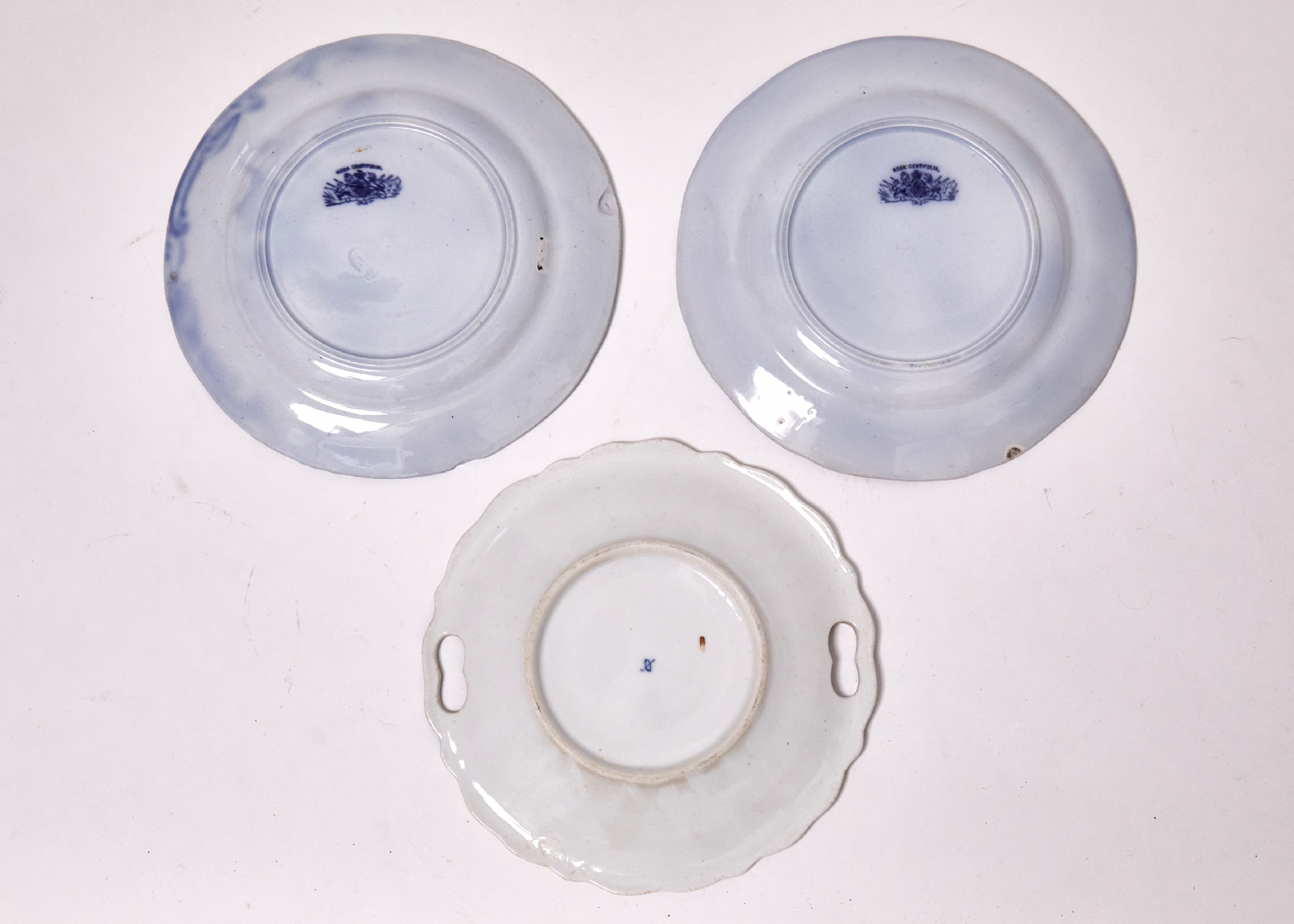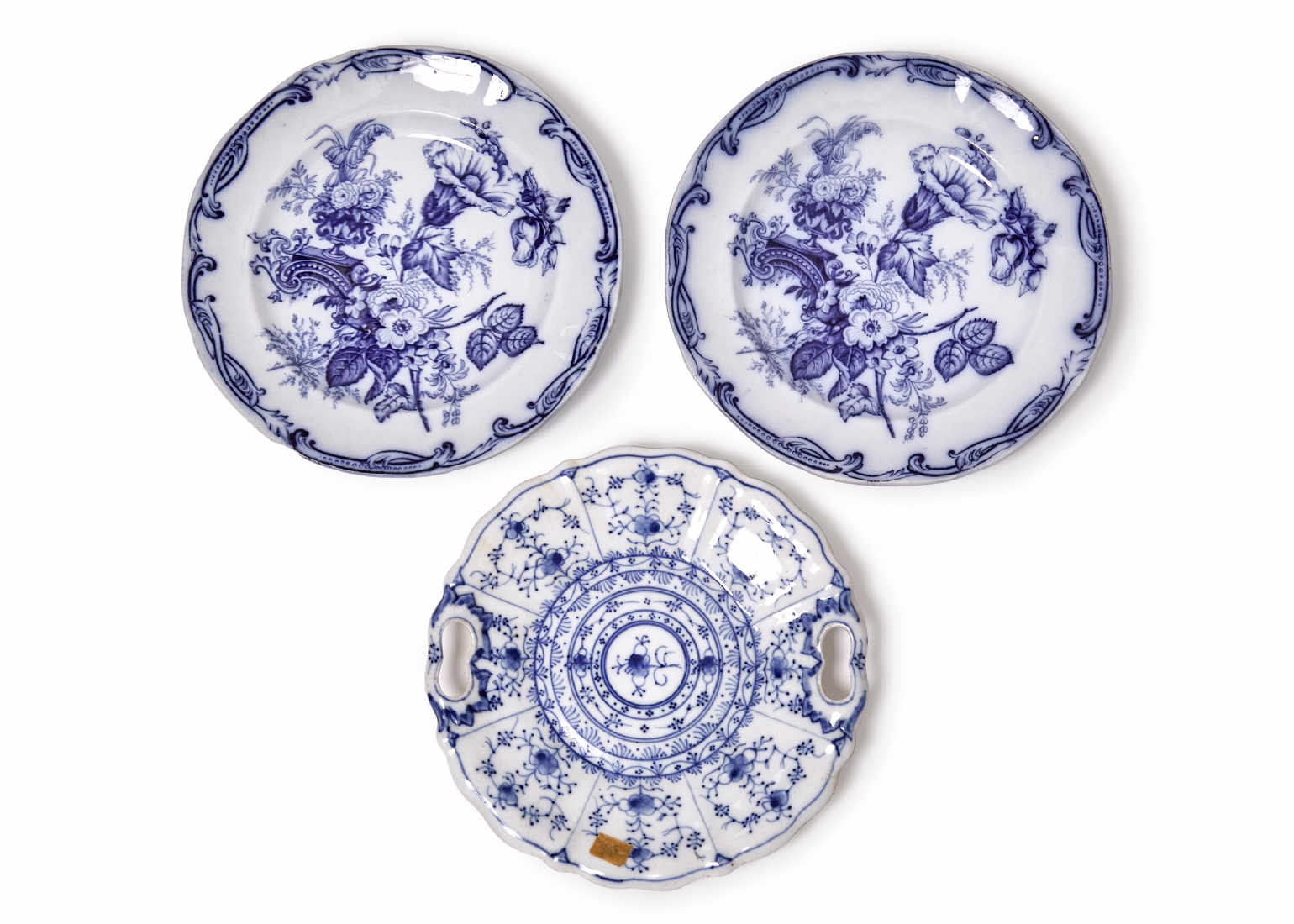 שלוש צלחות חרס ופורצלן שני דגמים שונים, מעוטרות וחתומות