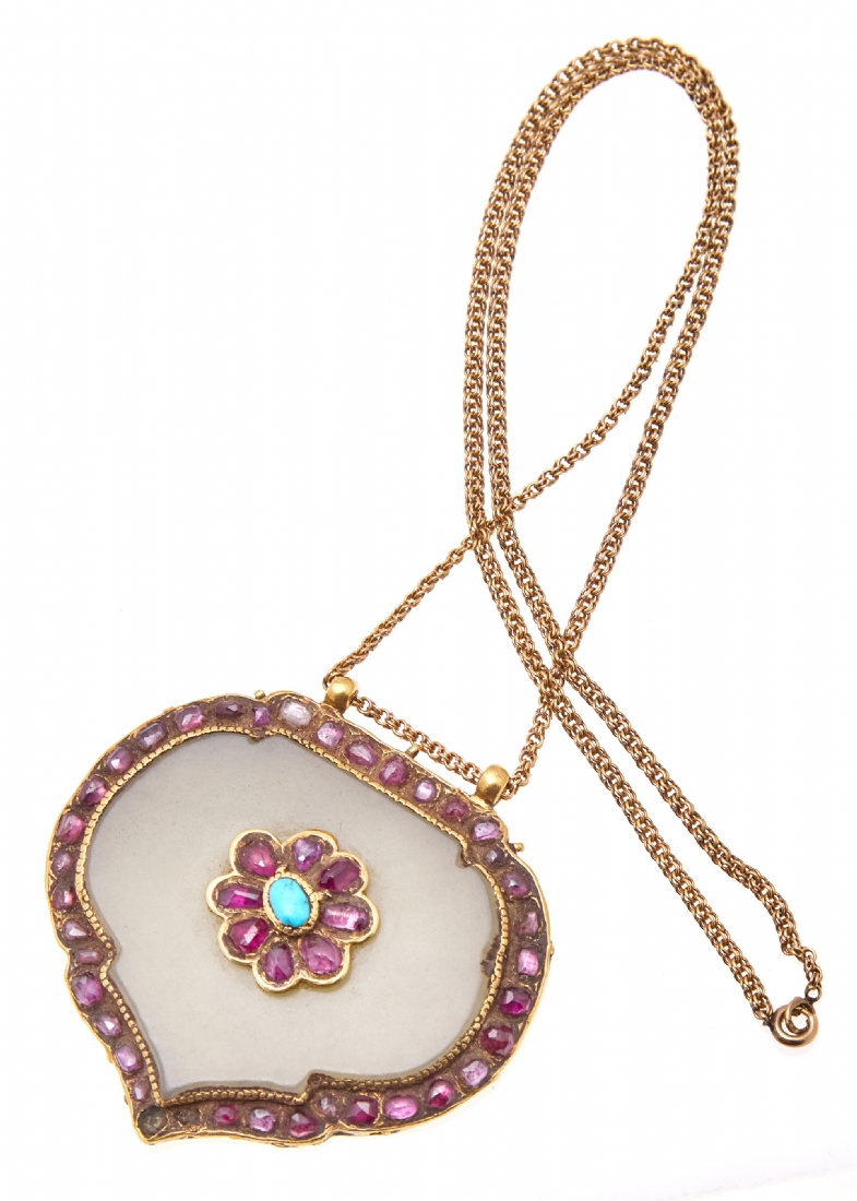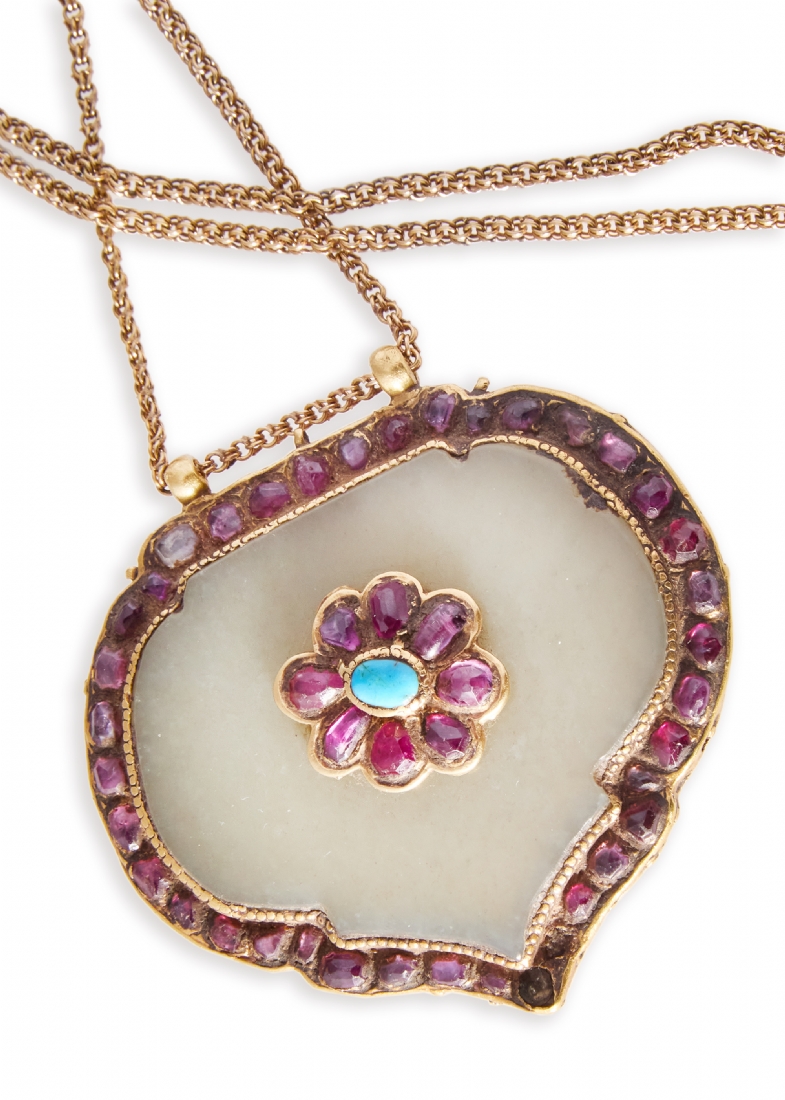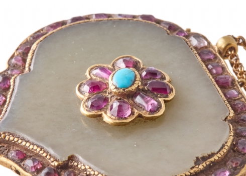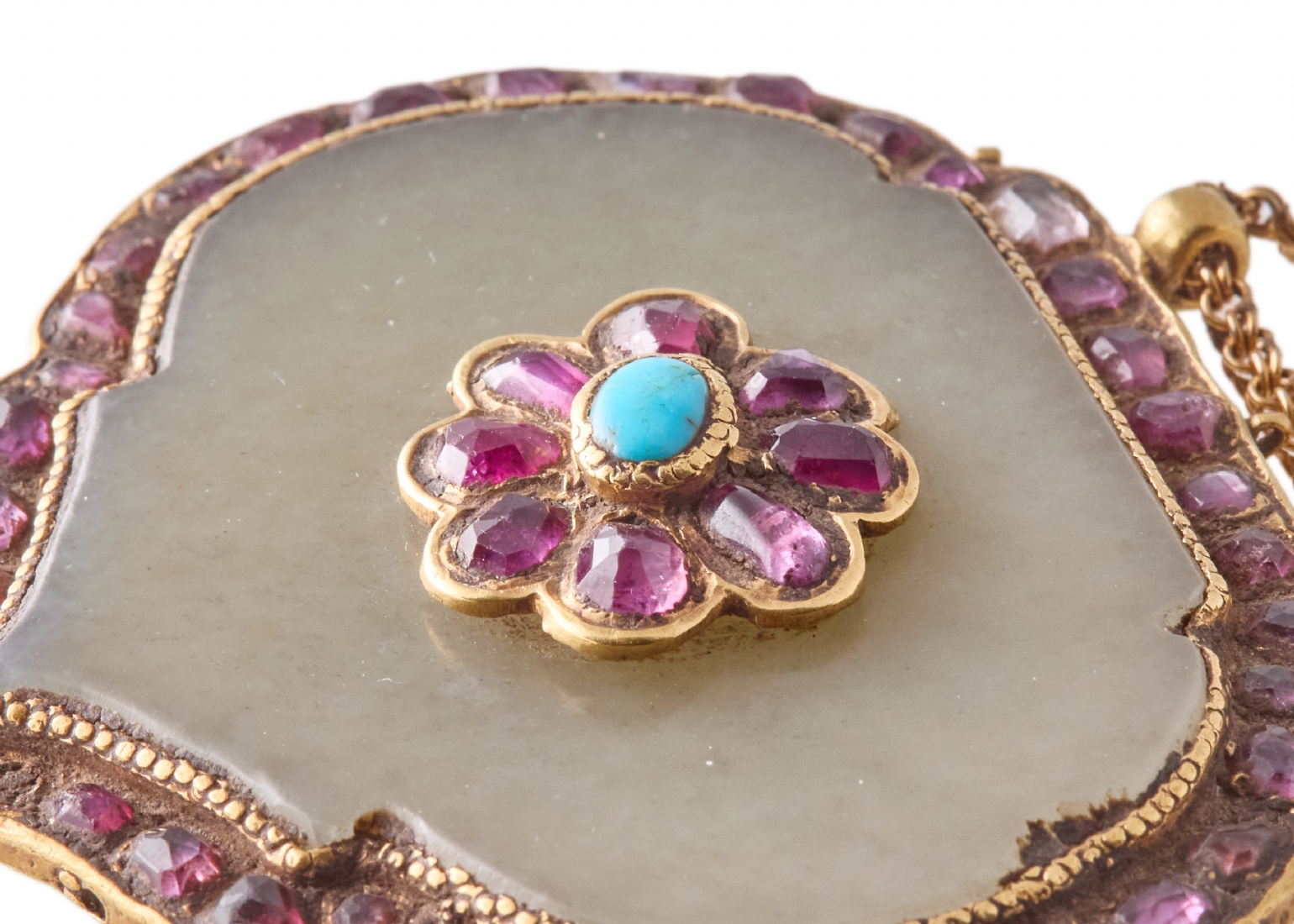 משובץ לוח ג'ייד, אבו טורקיז אובאלית בליטוש קאבושון ואבני רובי (שתיים חסרות ואחת הוחלפה בספיר לבן)