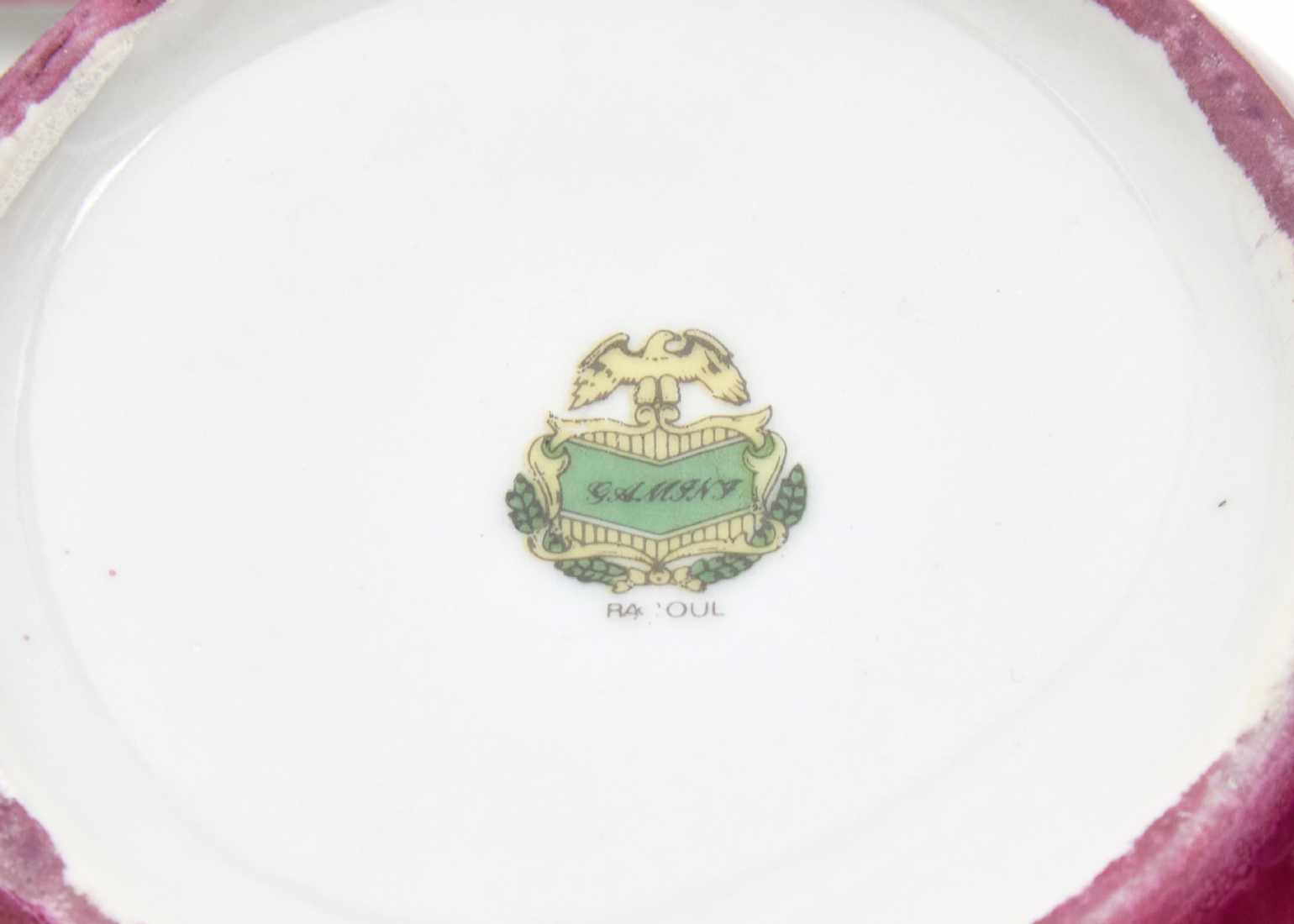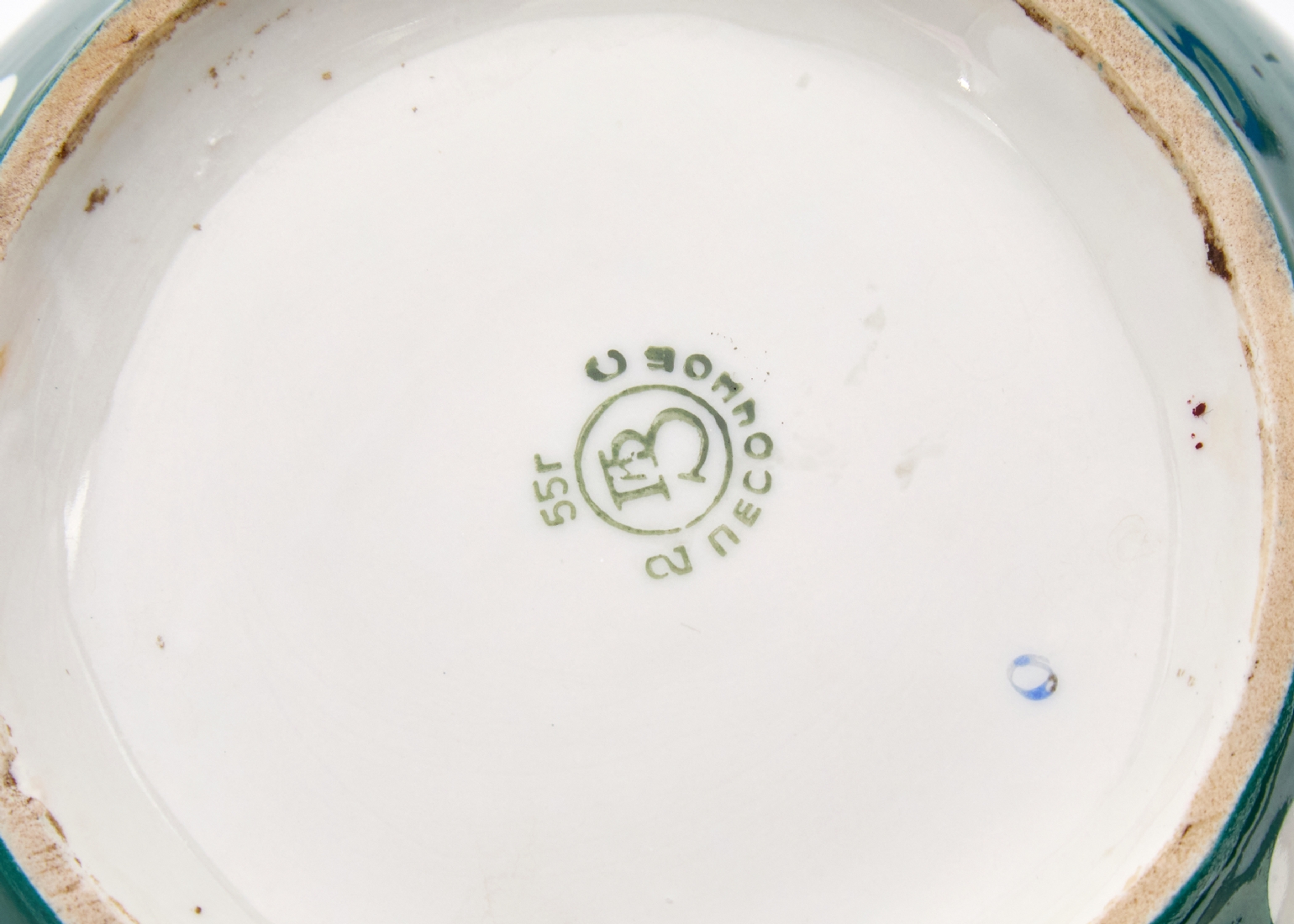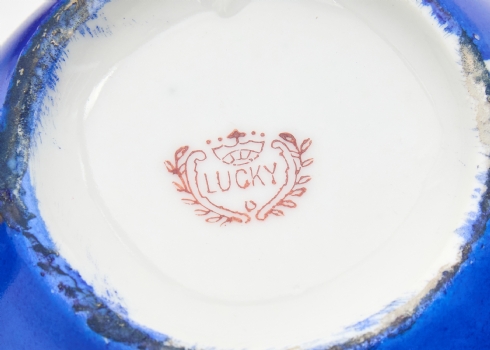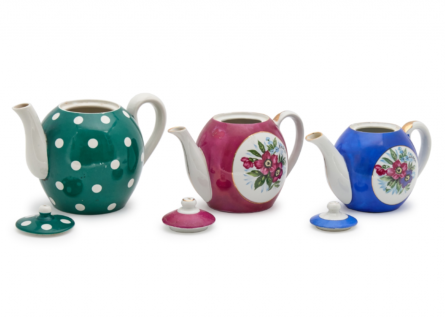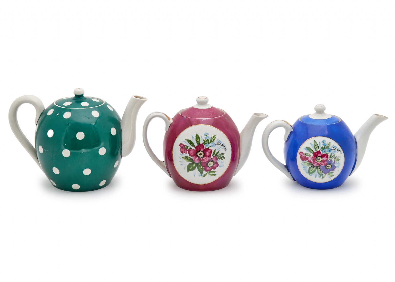 שלושה קומקומי פורצלן שונים, יצרנים ודגמים שונים, מעוטרים וחתומים
