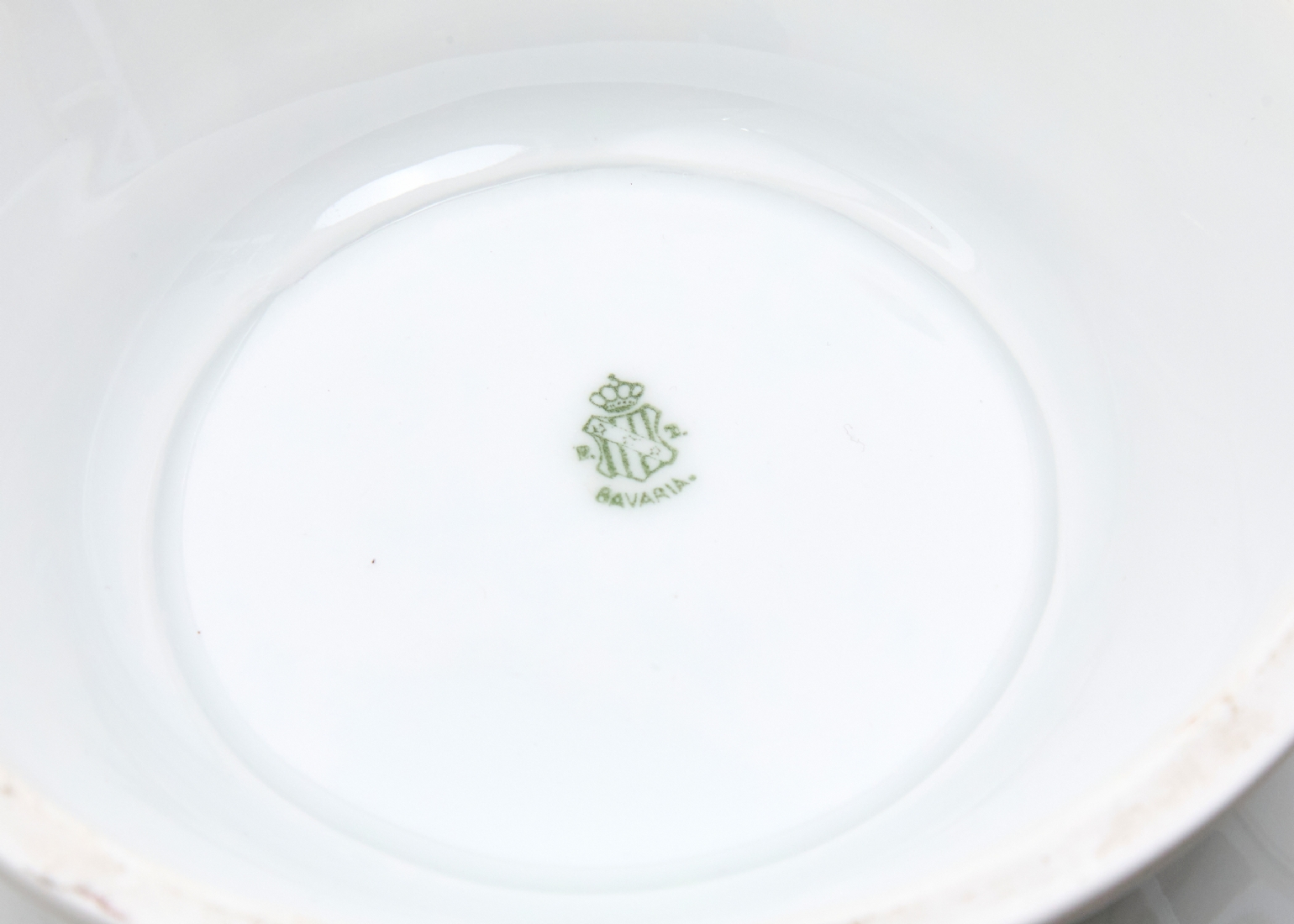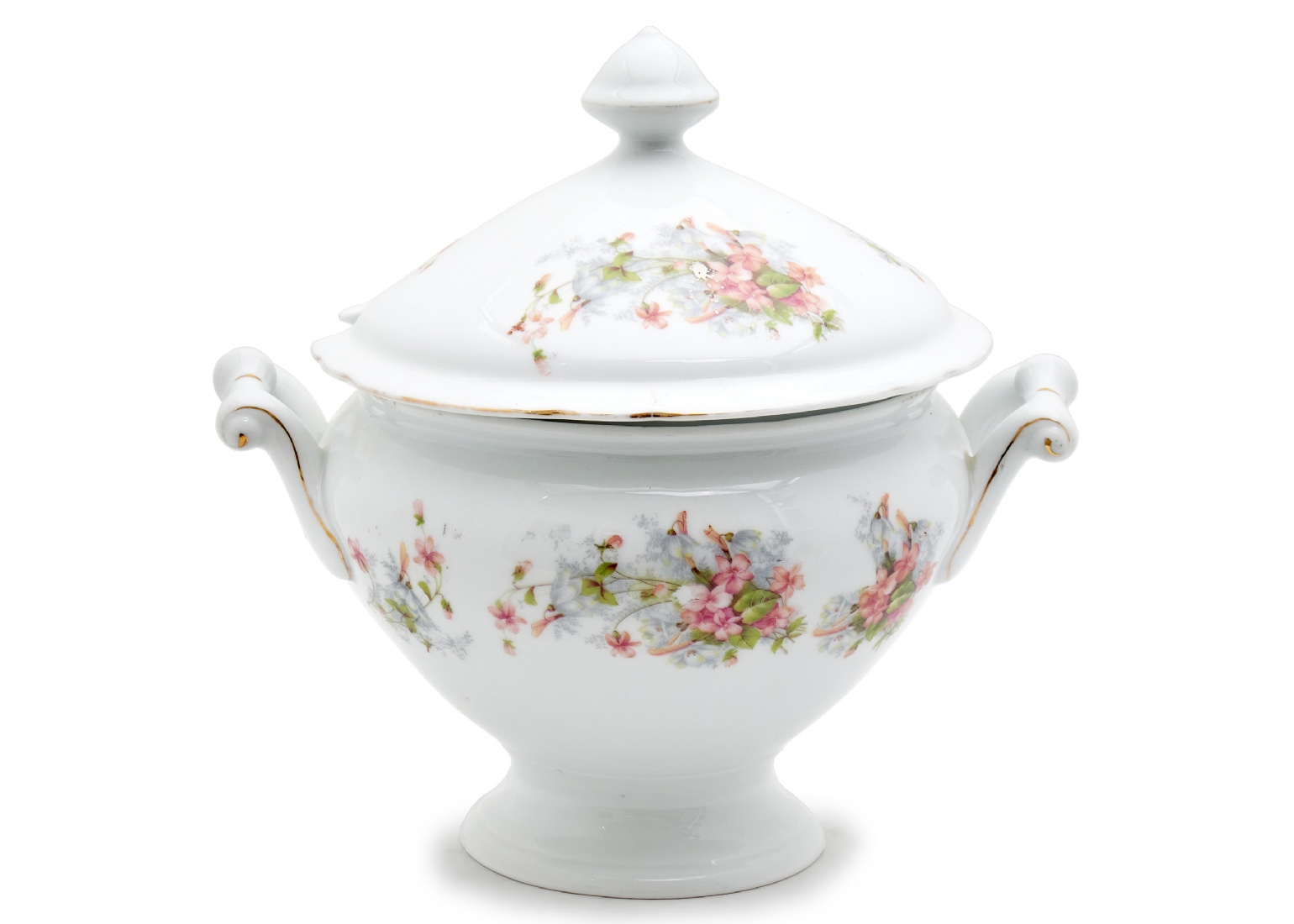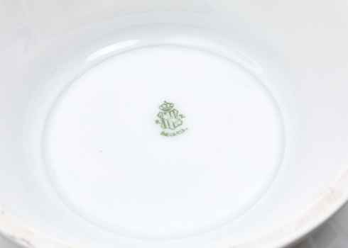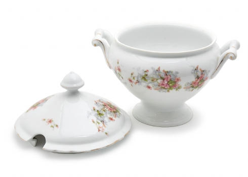 כלי פורצלן גרמני (בווארי) עתיק למרק ומכסה תואם מעוטר בהדפס פרחוני וחתום