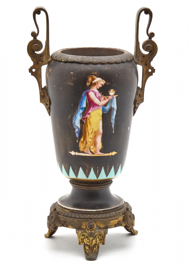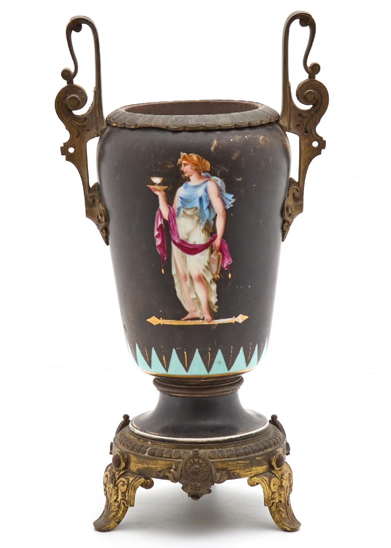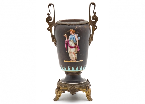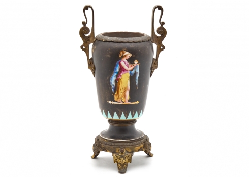 אגרטל צרפתי עתיק, עשוי ברונזה שפלטר ופורצלן מעוטר ציורי יד באמייל על רקע שחור