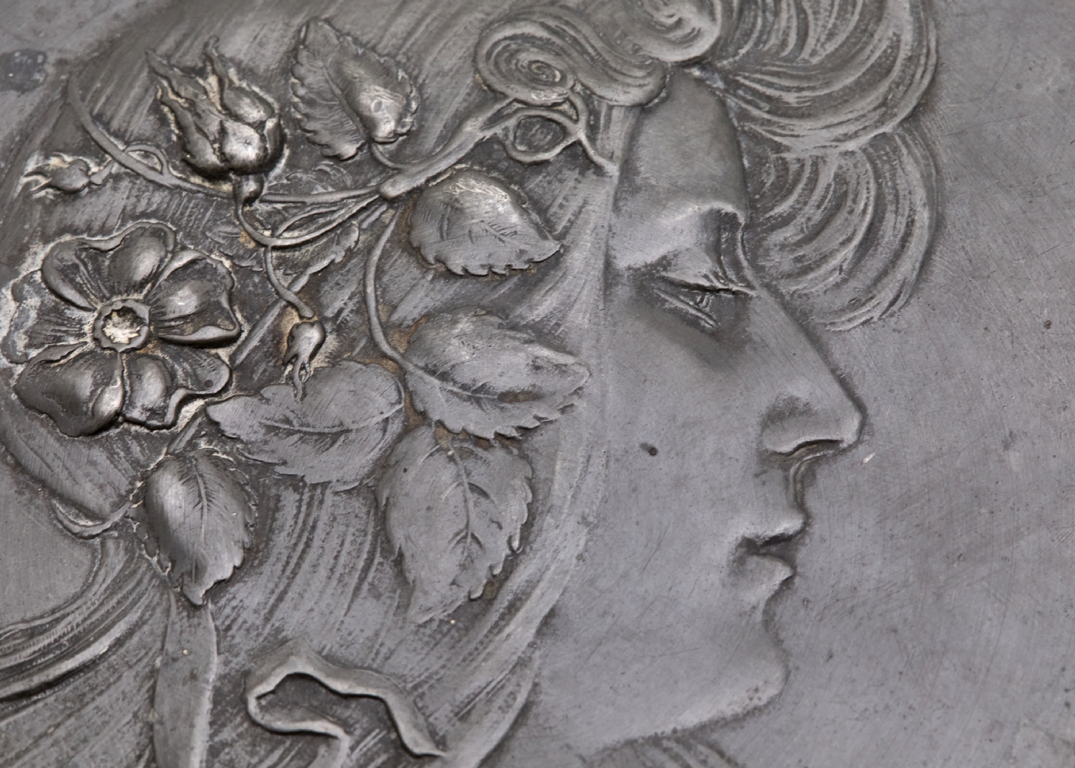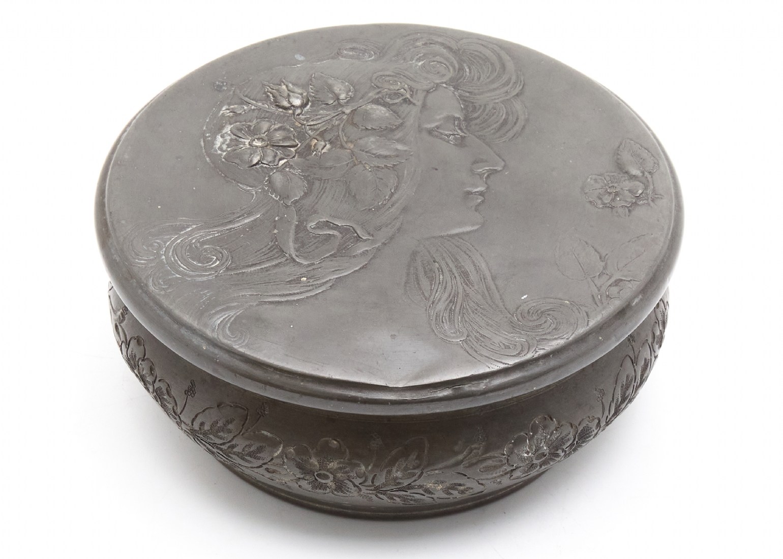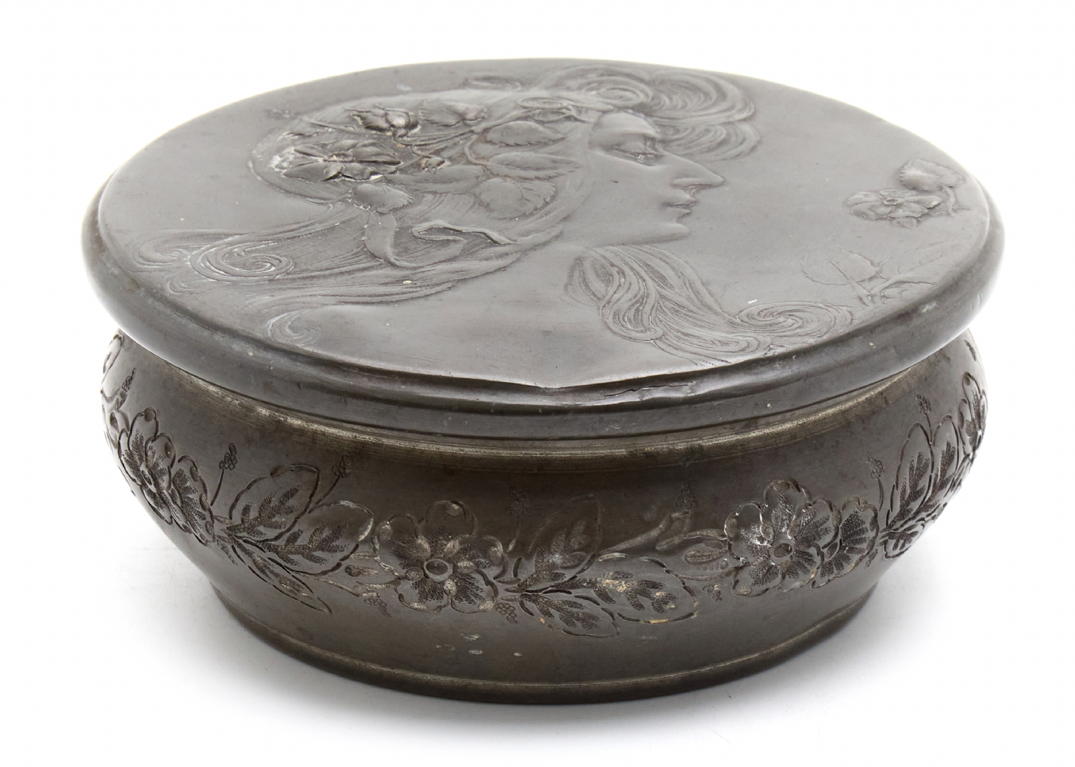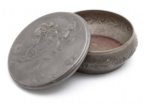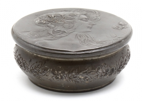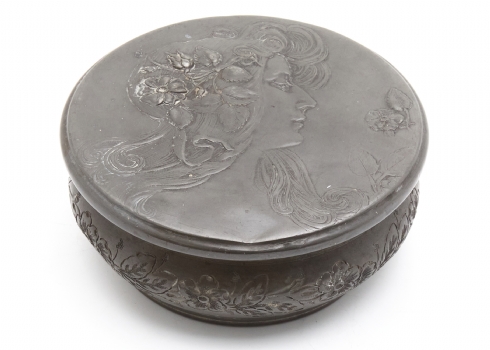 קופסא שולחנית עתיקה ויפה מפיוטר, מתקופת הארט נובו, בדמות אישה ופרחים בשערה