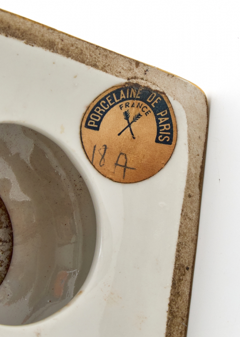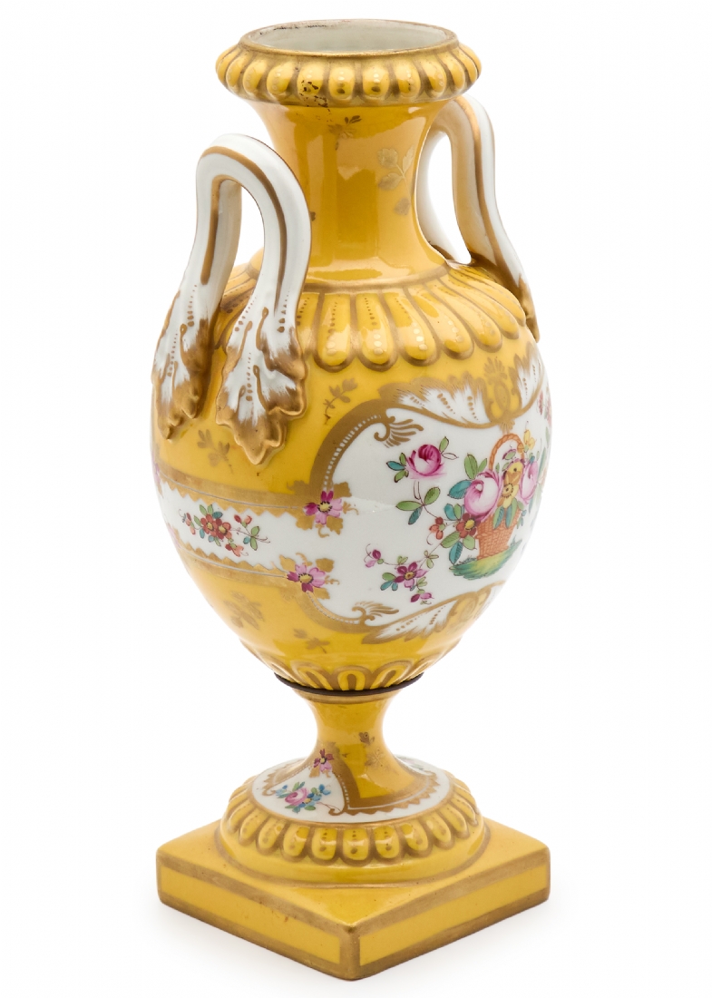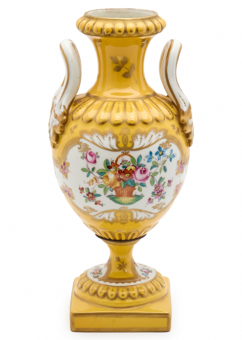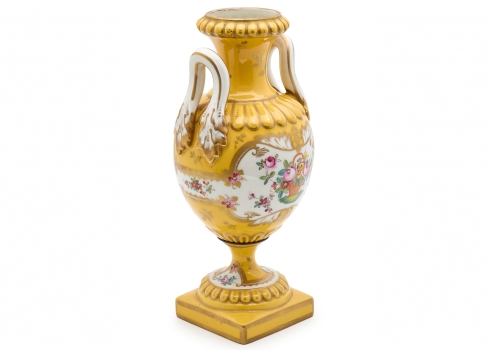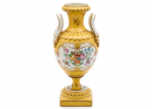 מעוטר ציורי יד באמייל ובזהב על רקע צהוב חרדל, נושא מדבקת יצרןגובה 32.5 ס"מרוחב 16 ס"מ
