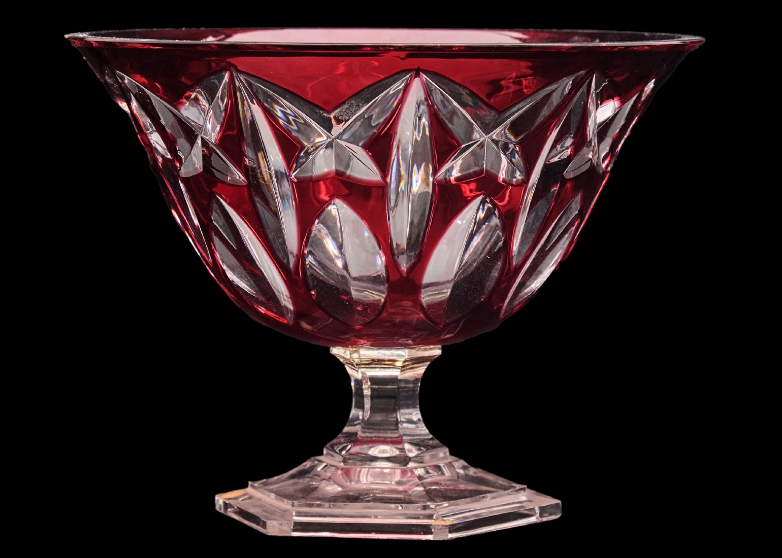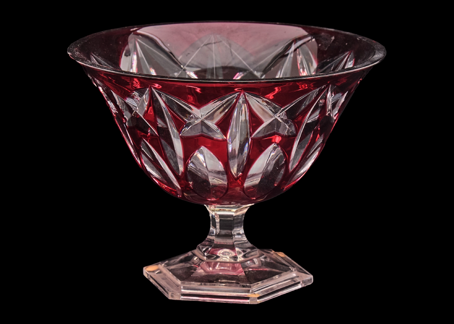 עשוי קריסטל מרובד בבורדו על שקוף צ'יפ לשפה העליונה גובה: 17 ס"מ קוטר המפתח העליון: 22 ס"מ