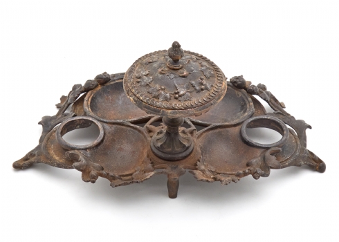 קסת דיו שולחנית כפולה עשויה ברזל יצוק, מתקופת סגנון האר נובו, שנת 1900 בקירוב קסת דיו צרפתית עתיקה ואיכותית מתקופת סגנון הארט נובו, על פי: 'A.M. Paignant' קסת דיו שולחנית כפולה