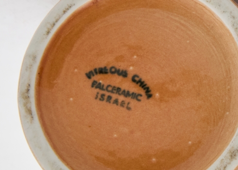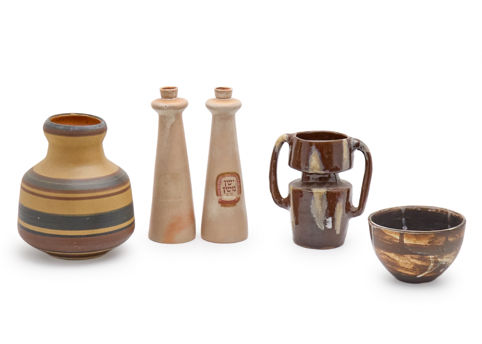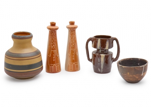חמישה כלי קרמיקה חלקם ישראלים (ישראליאנה), זוג הפמוטים מתוצרת פלקרמיק וחתומים