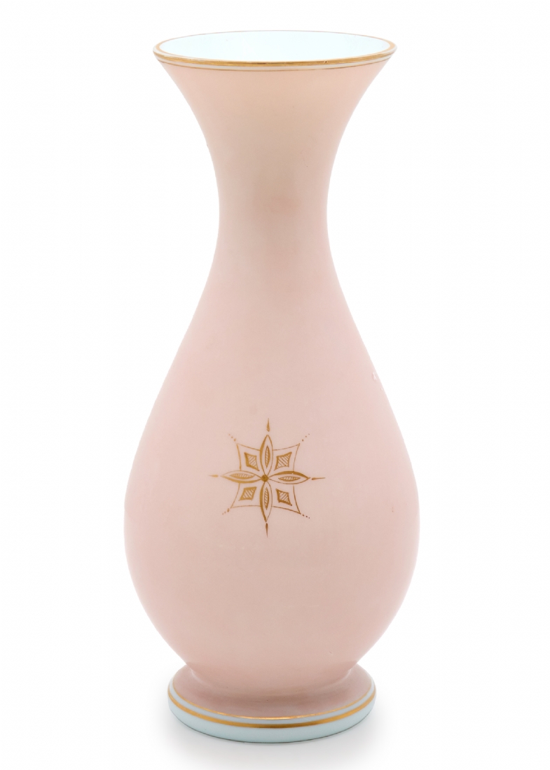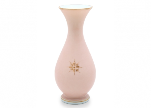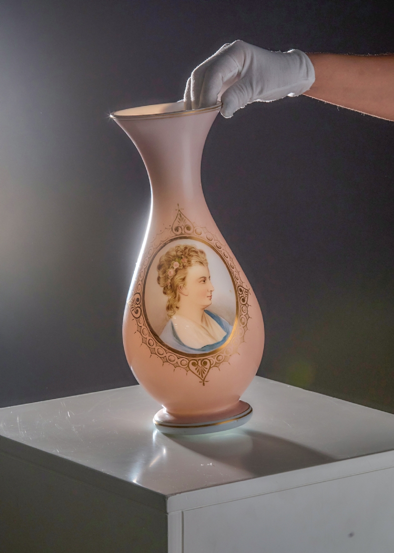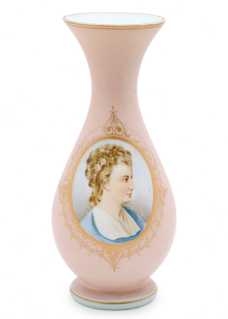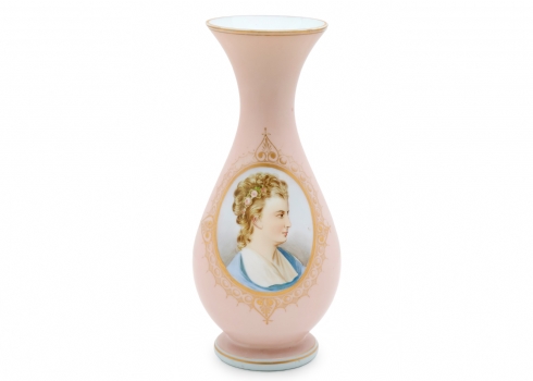 אגרטל זכוכית עתיק, מעוטר ציור יד בדמות אישה ופרחים בשערה על רק בגוון ורוד