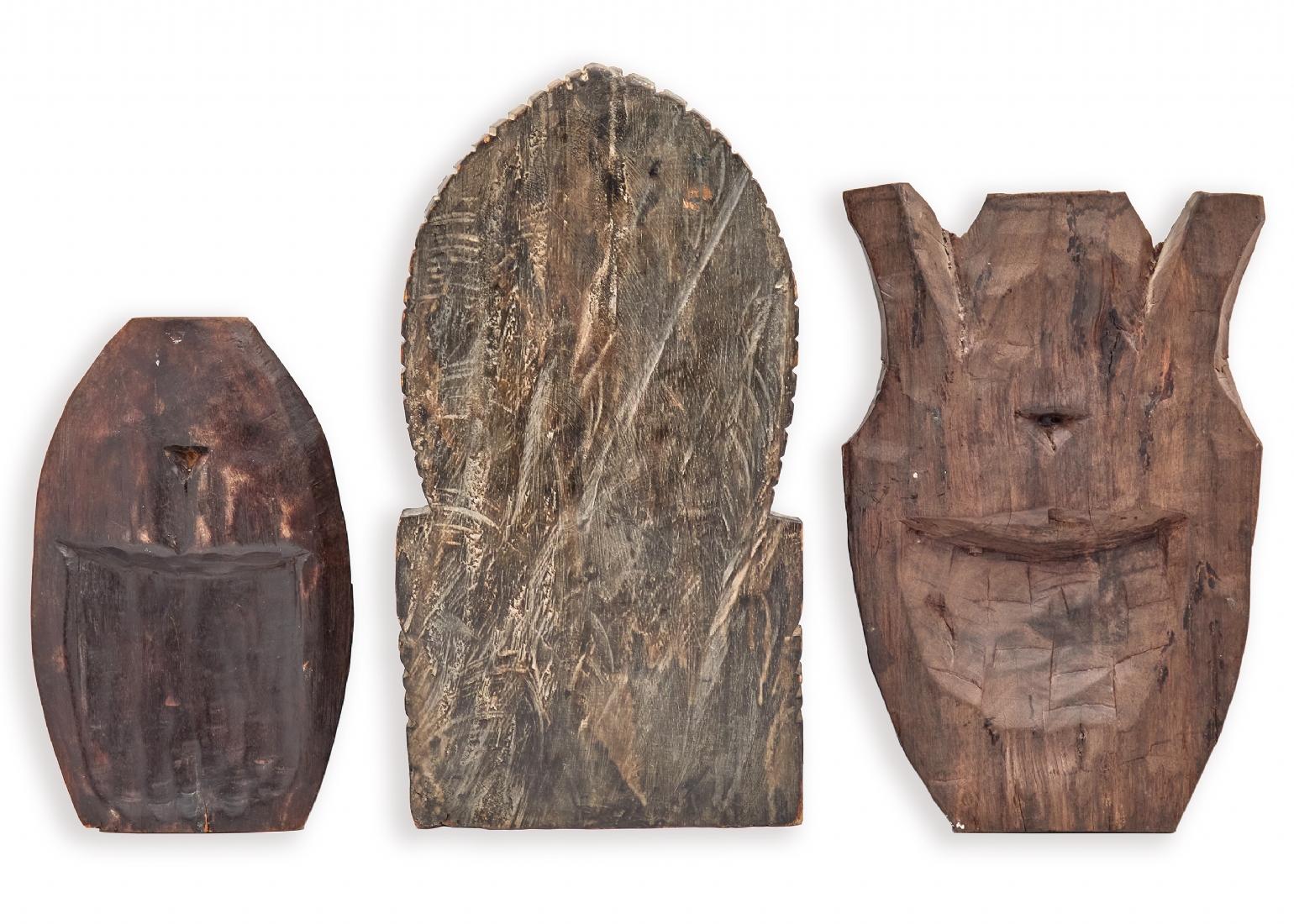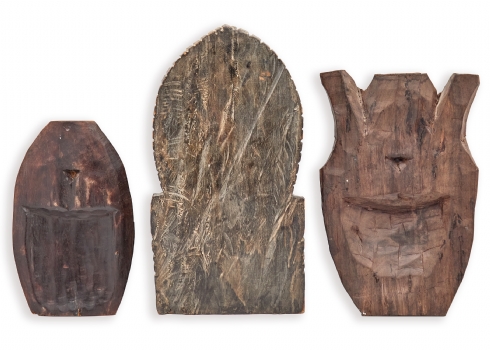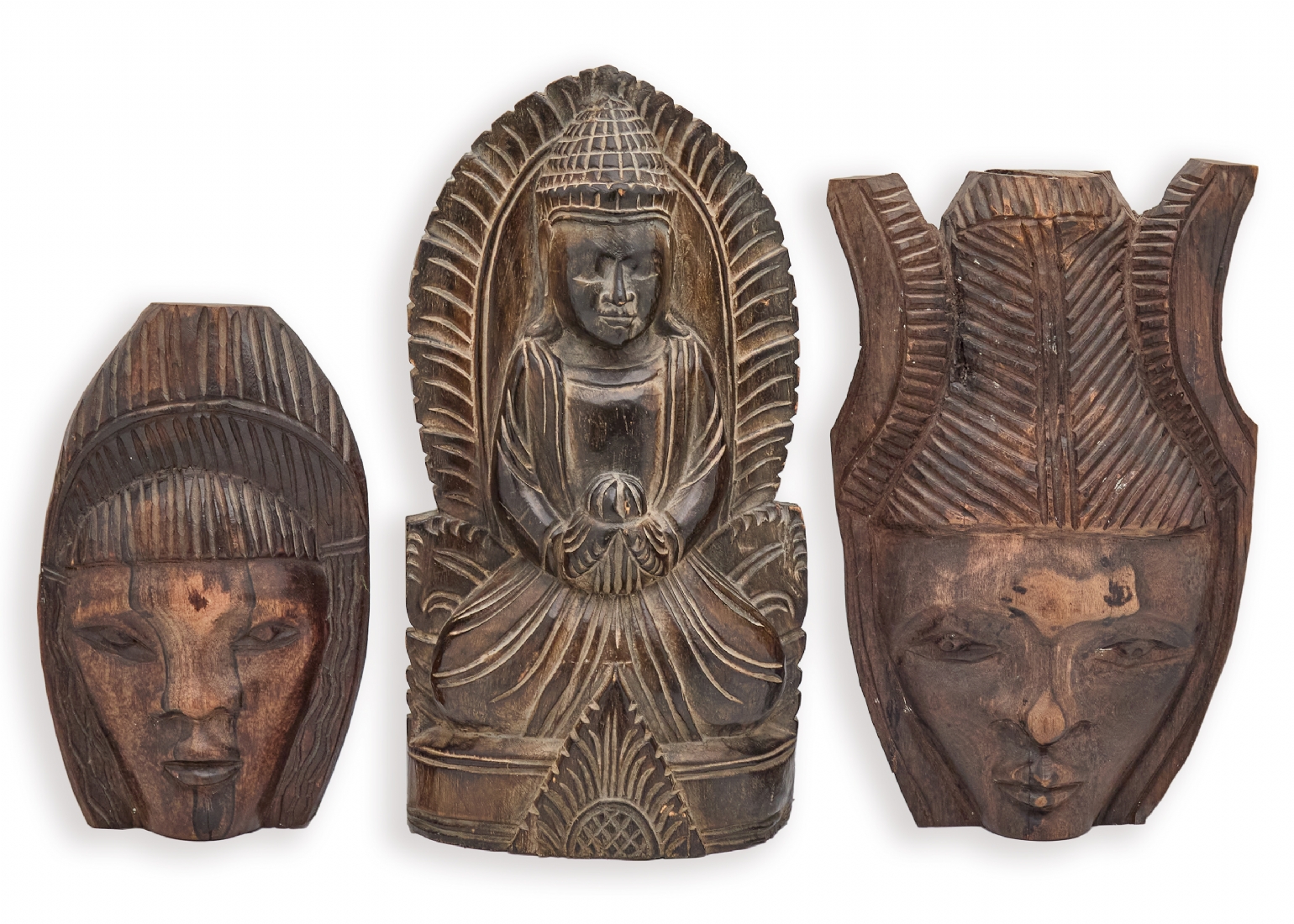 שלושה פריטי עץ מגולפים בעבודת יד, הכוללים שתי מסכות פנים ודמות יושבת