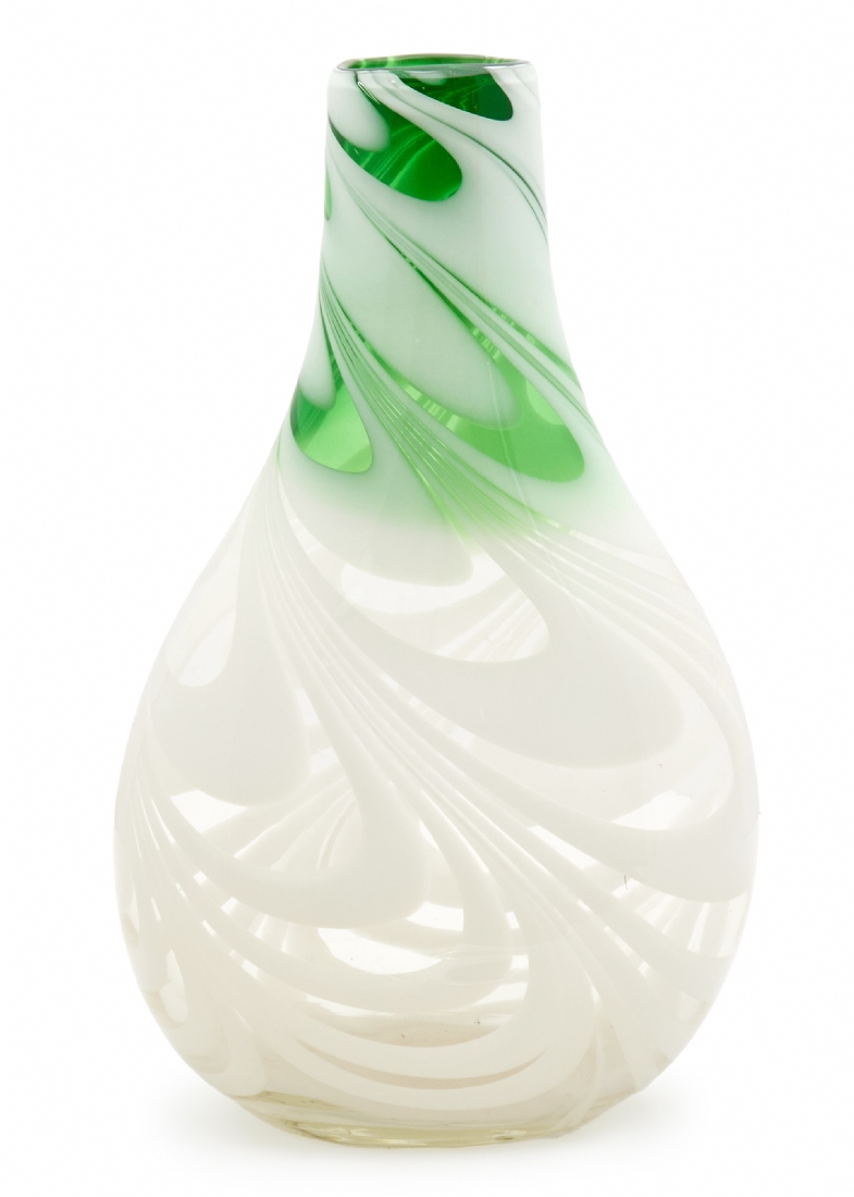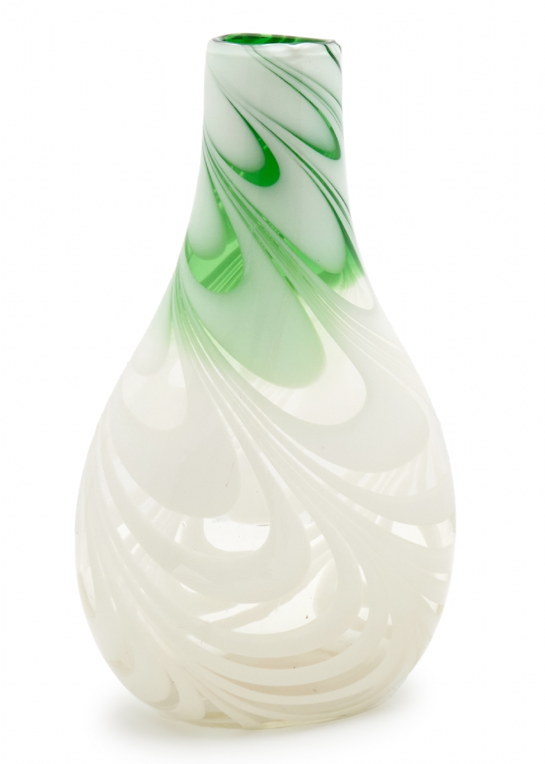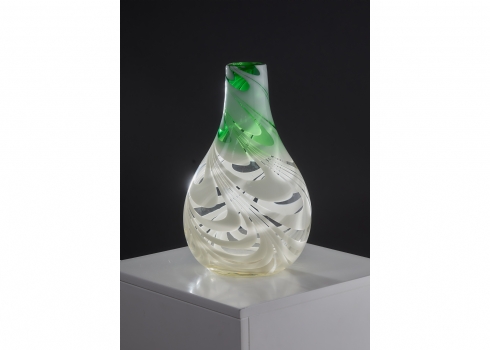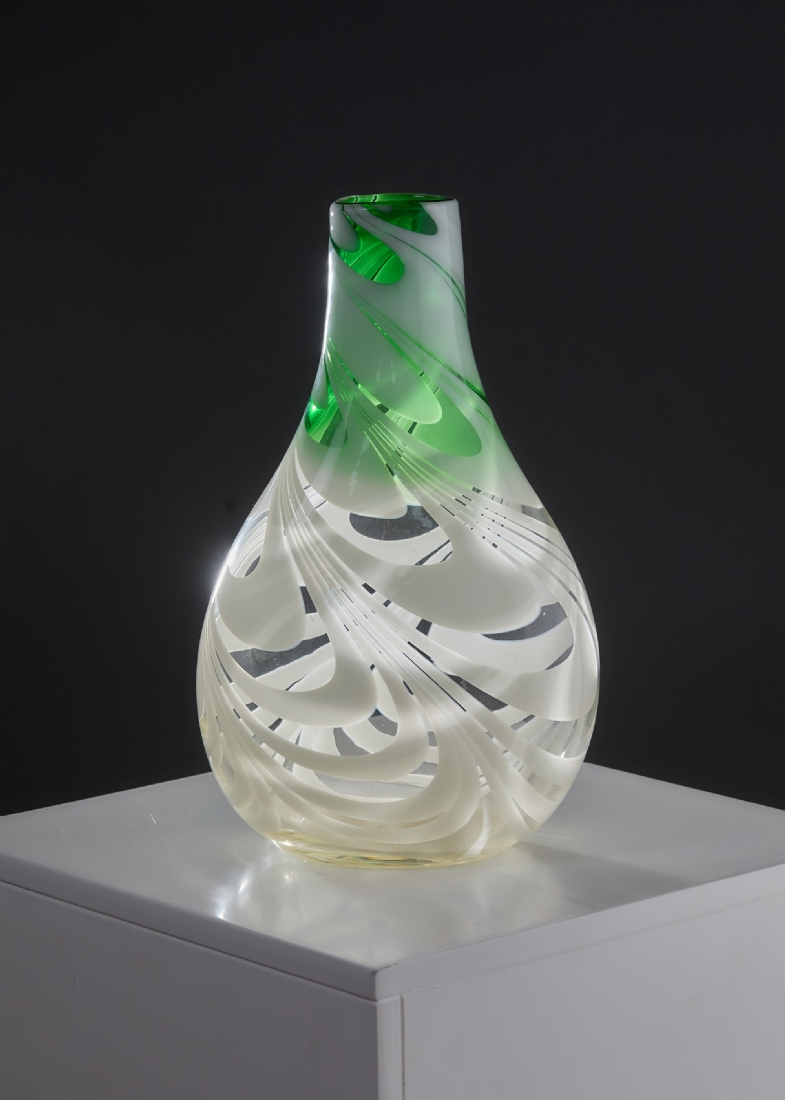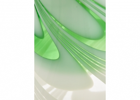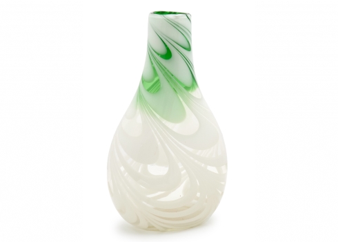 אגרטל זכוכית אמנותית בעבודת יד עם עיטור סחרור בגווני ירוק ולבן