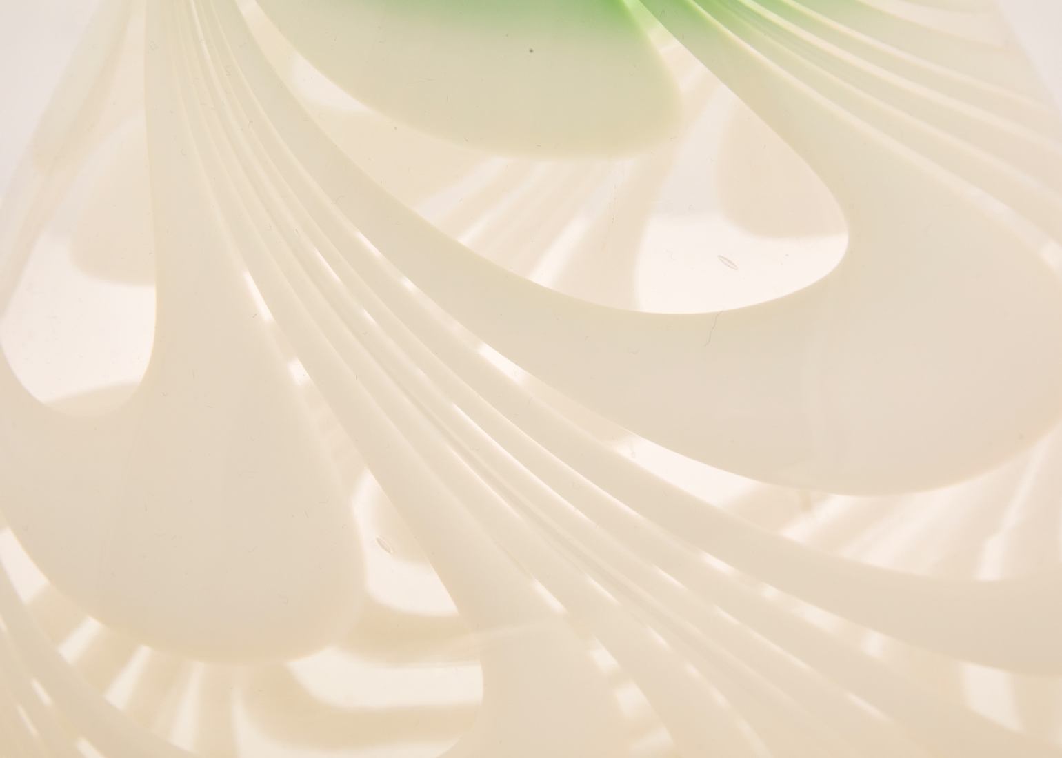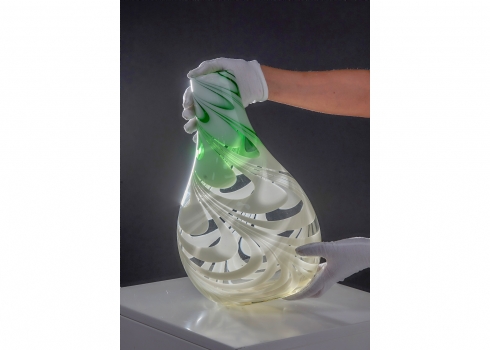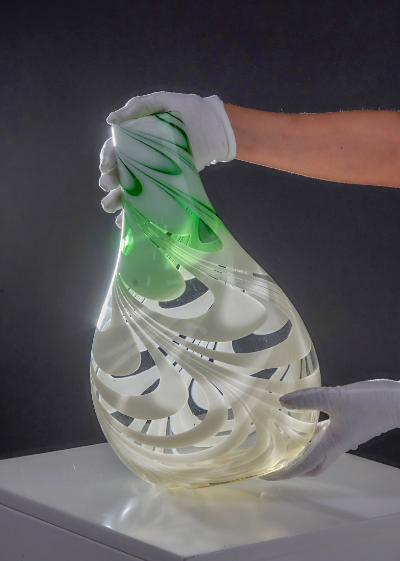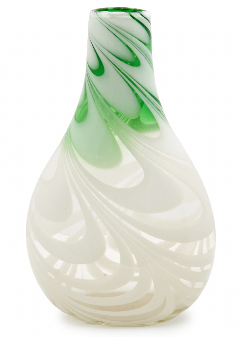 אגרטל זכוכית אמנותית בעבודת יד עם עיטור סחרור בגווני ירוק ולבן