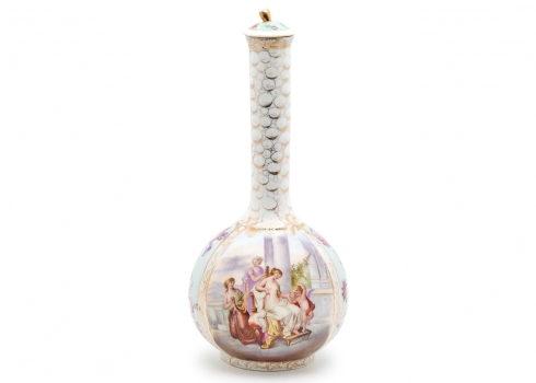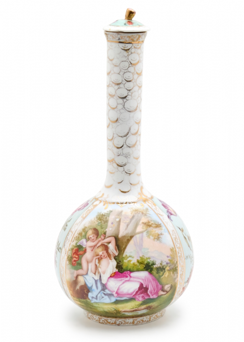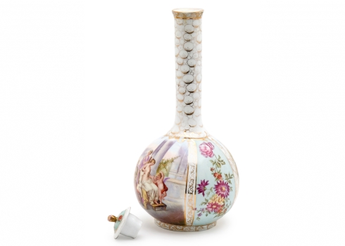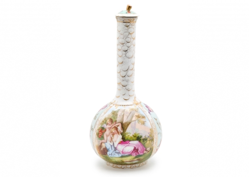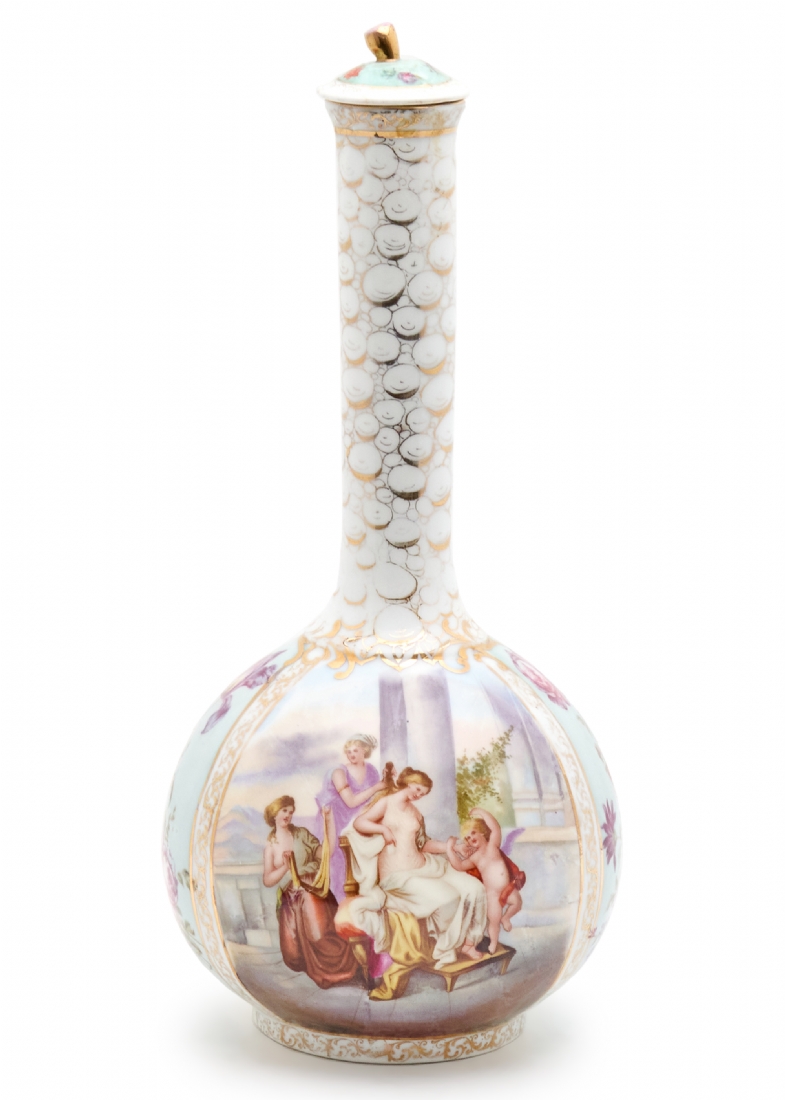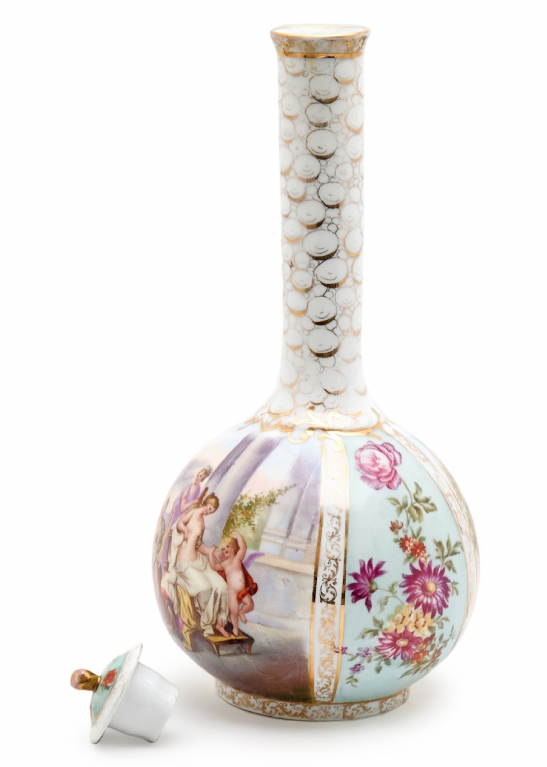 בקבוק פורצלן גרמני עתיק ומכסה תואם, מסוף המאה ה-19, בסגנון הלנה וולפסון
