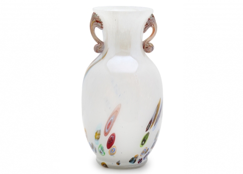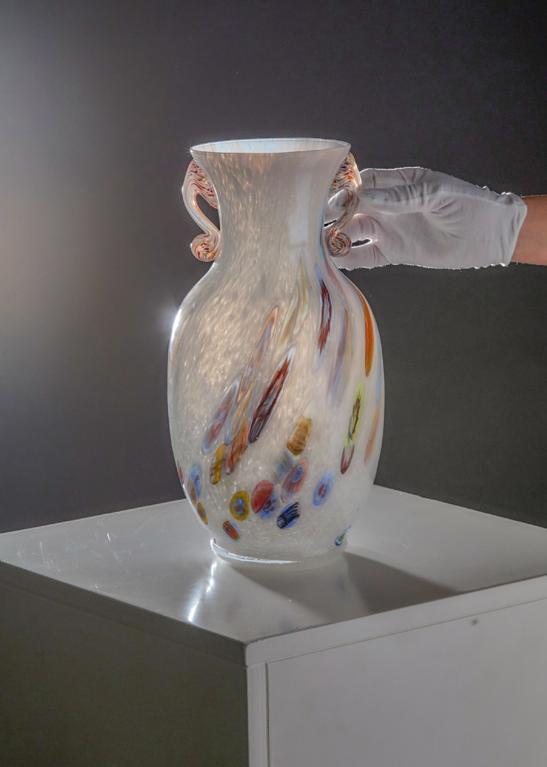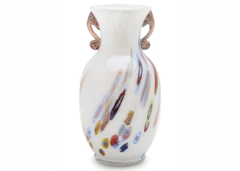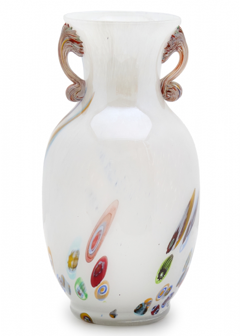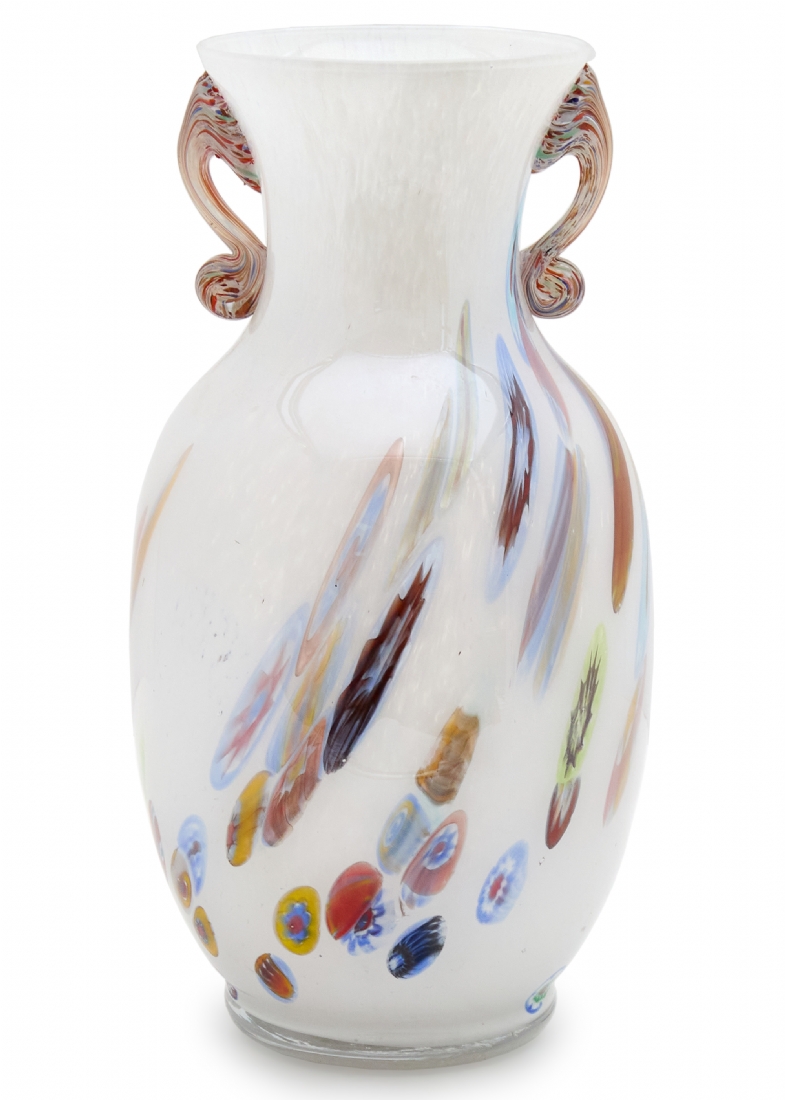 אגרטל זכוכית מורנו, עשוי בעבודת ניפוח יד אמן בדגם קנים (Cane work)