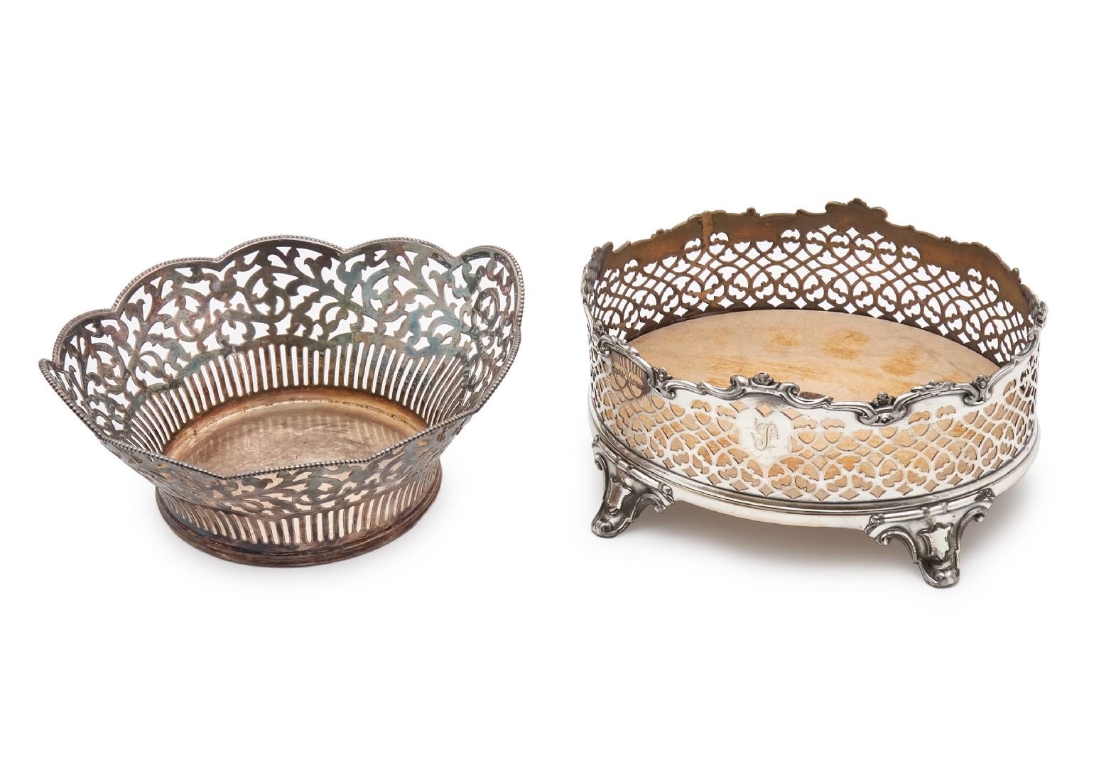 שני כלים עתיקים עשויים פליז או נחושת מצופה כסף לא חתומים, המאה ה-19