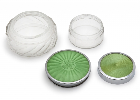 זוג קופסאות מזכוכית עם מכסי אמייל גיושה ירוק בסגנון אר דקו, שנות ה־30