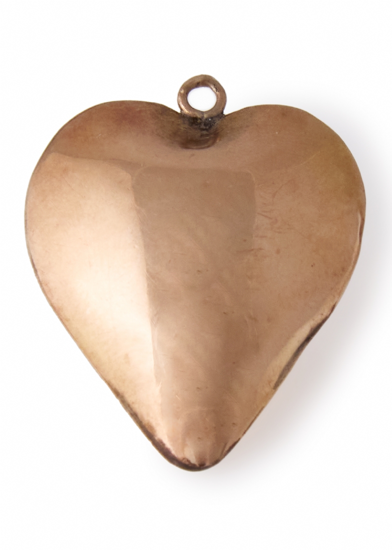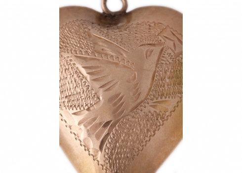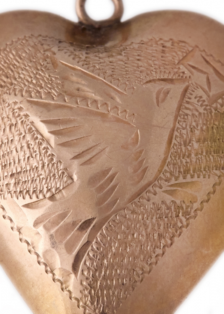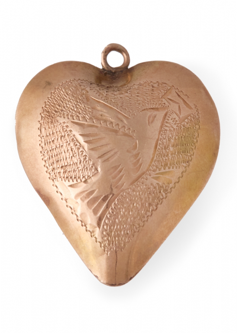 תליון עתיק וגדול בצורת לב נפוח, עשוי זהב 14 קארט מעוטר בחריטת יד עדינה