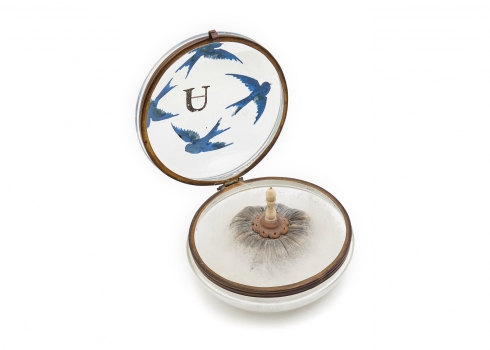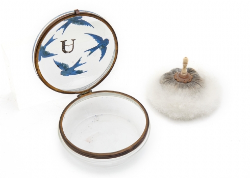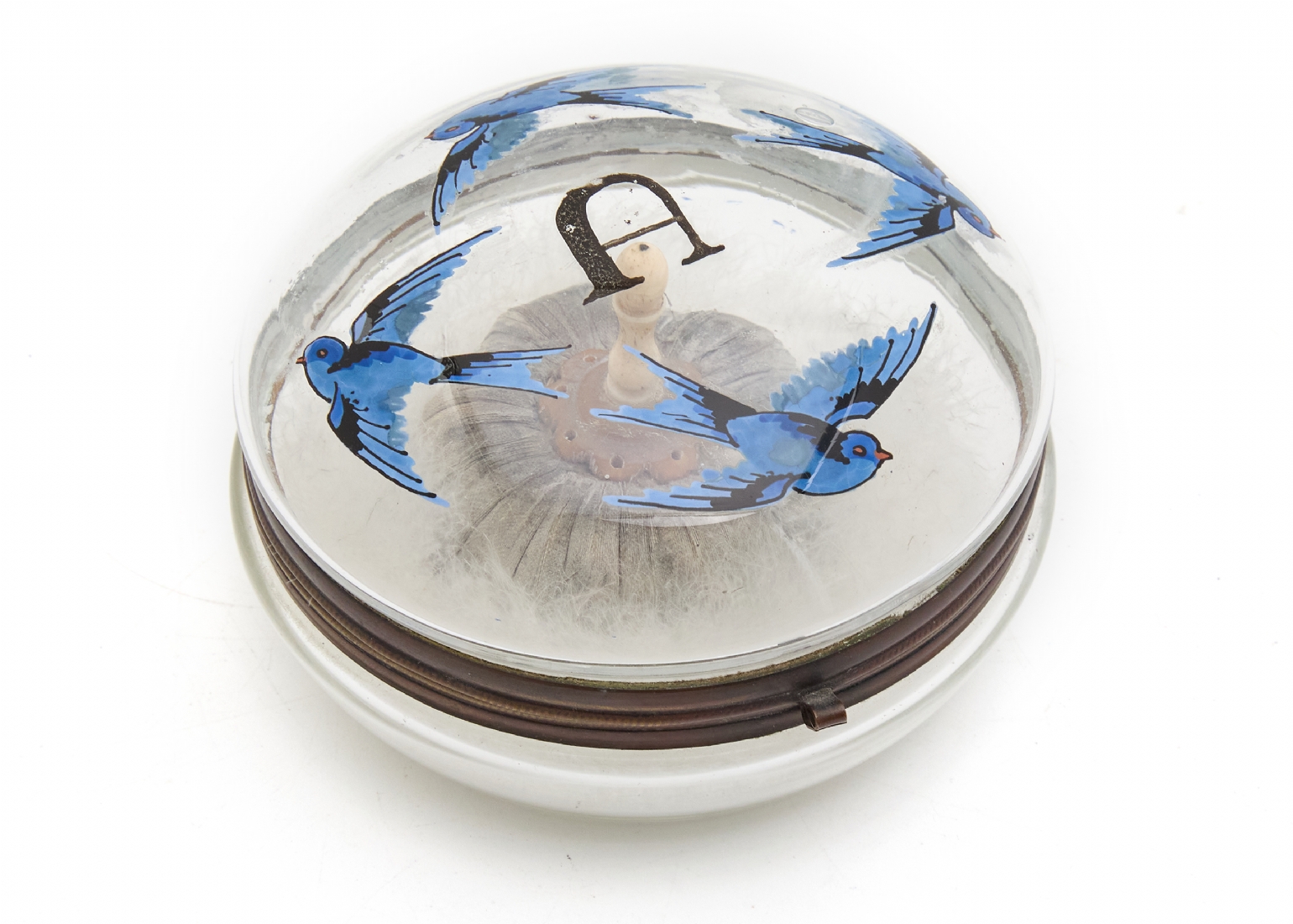 קופסת אבקה מזכוכית מצוירת ביד עם ציפורים כחולות, תחילת המאה ה־20