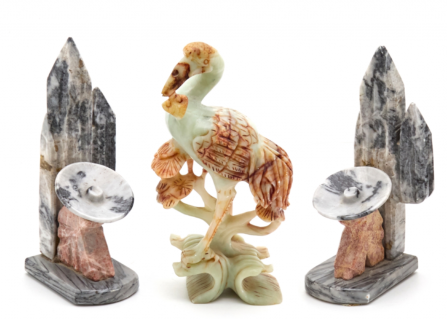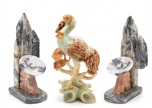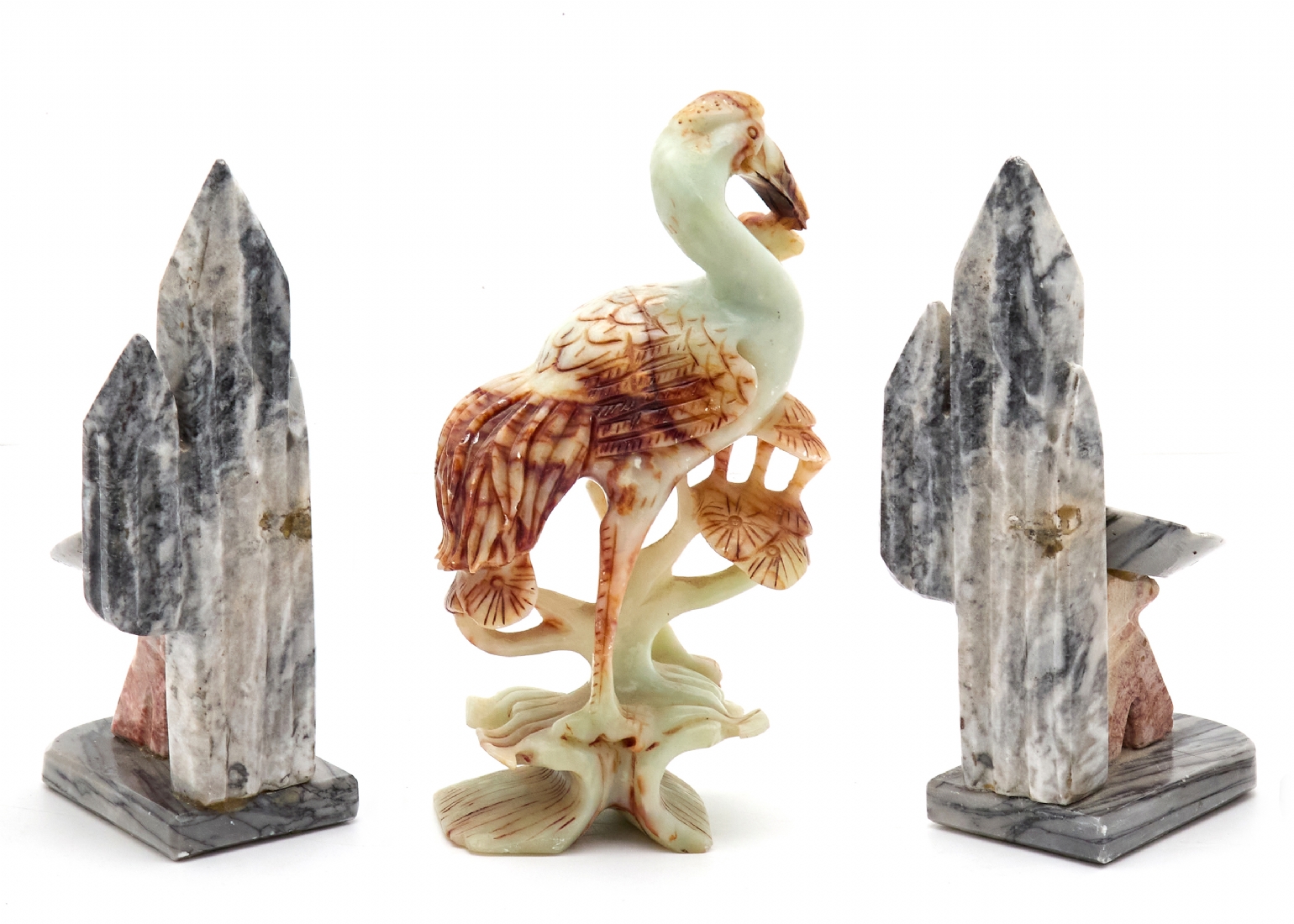 זוג פריטים דקורטיבים הכולל זוג תומכי ספרים ופסל ציפור מגולפים ביד מאבן טבעית
