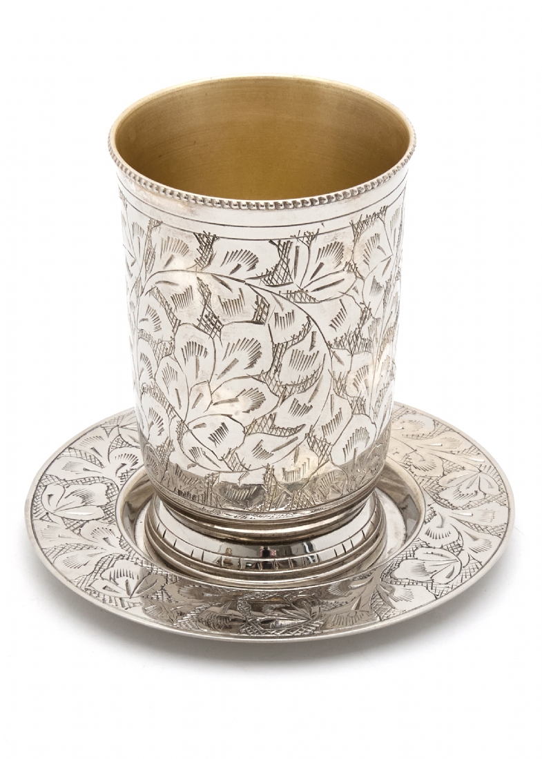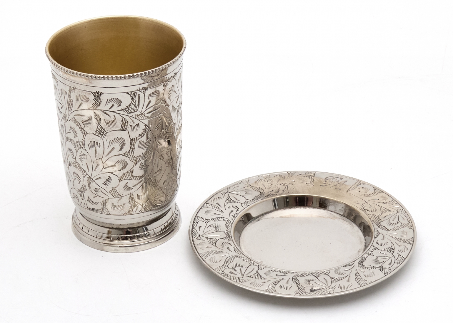 כוס מצופה כסף עם תחתית תואמת מעוצבת בעבודת חריטה
