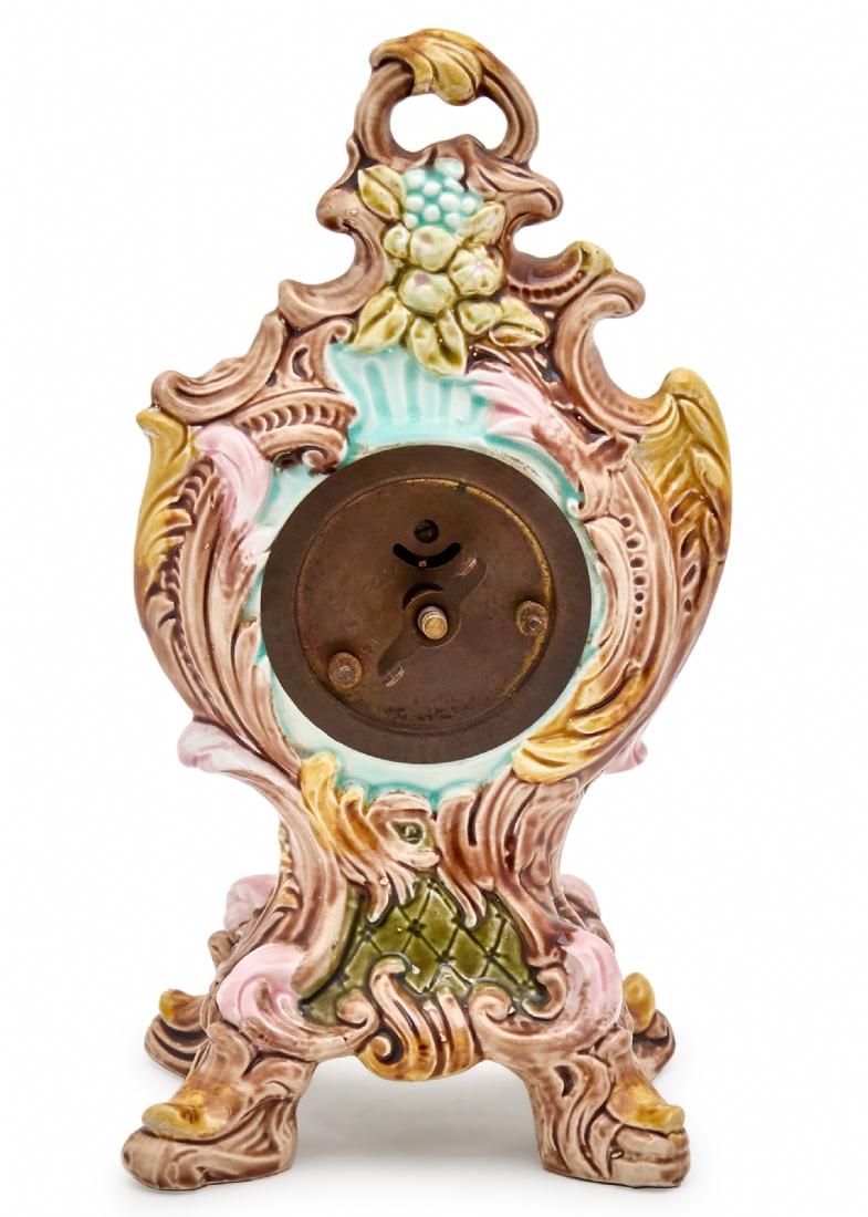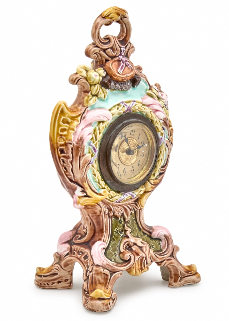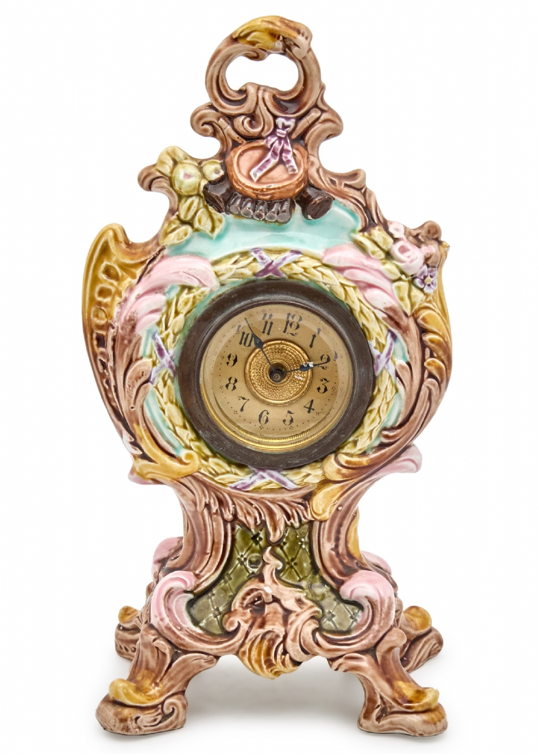 שעון שולחני עתיק, 1900-1920 בקירוב, עשוי מג'וליקה ומעוטר בצביעת יד