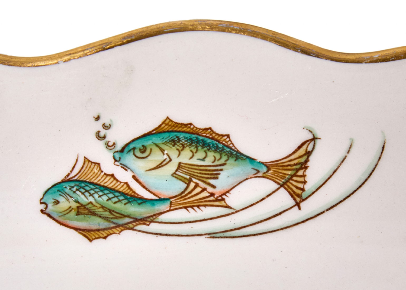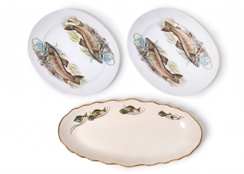 שלוש צלחות הגשה אובליות מפורצלן, עם עיטורי דגים