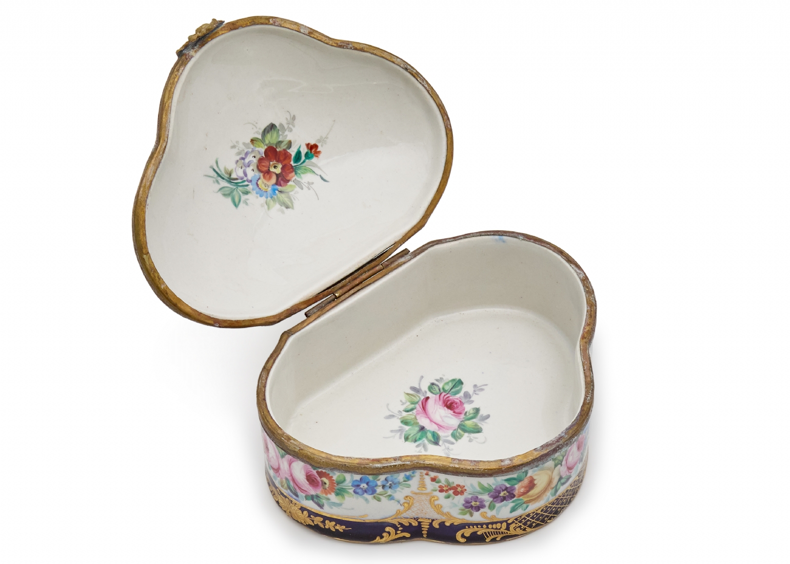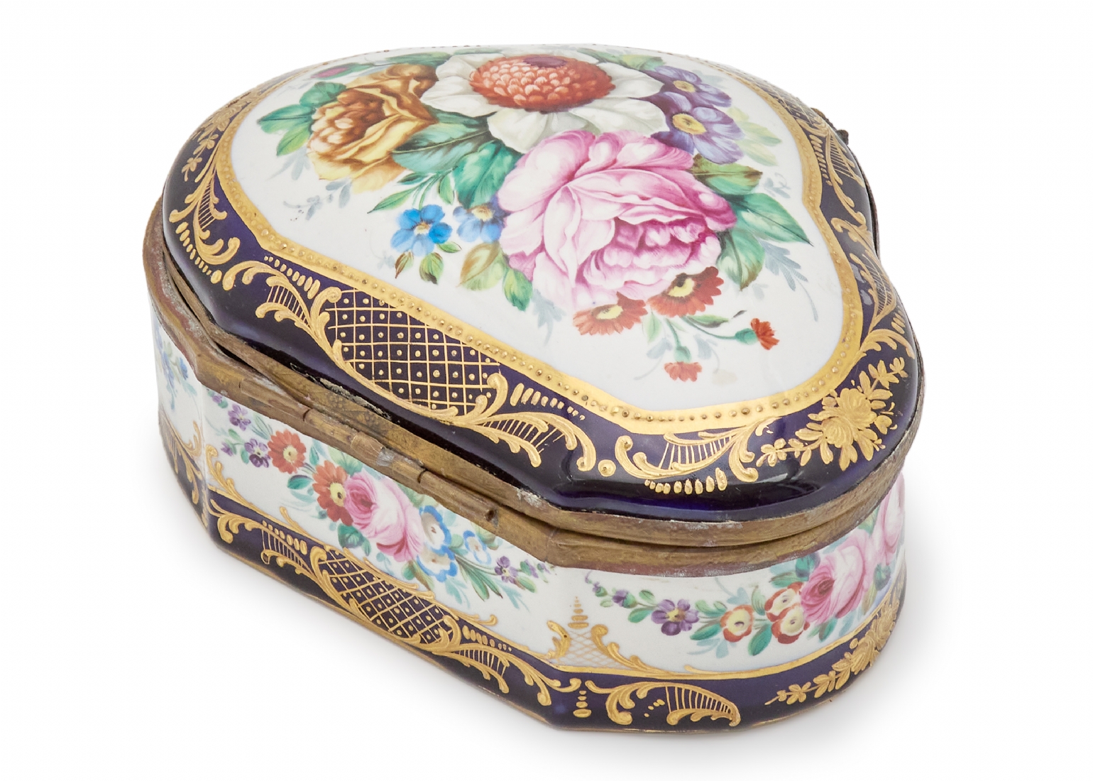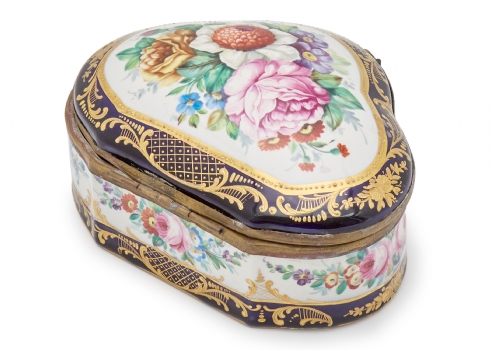 קופסה שולחנית עשויה פורצלן מעוטר ציורי יד באמייל ובזהב בדגם פרחים, חתומה