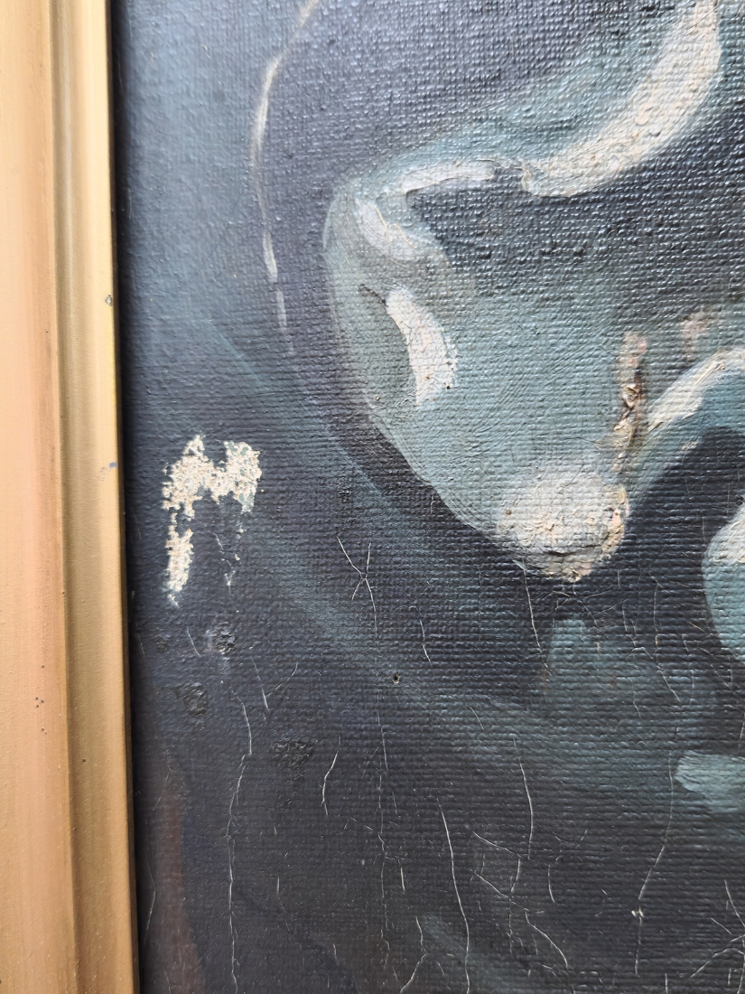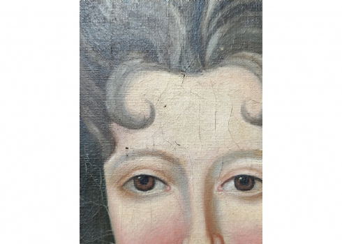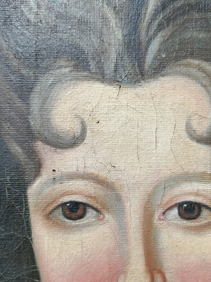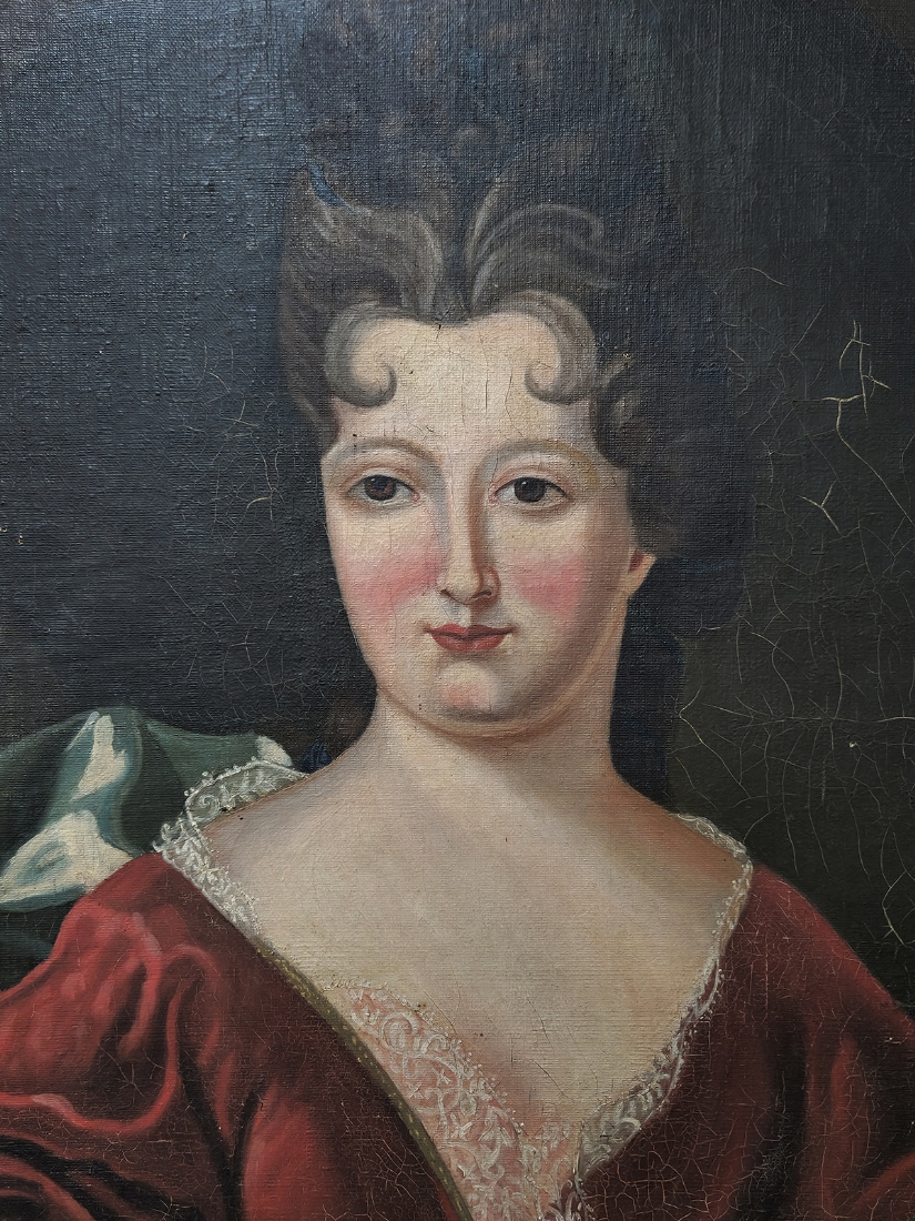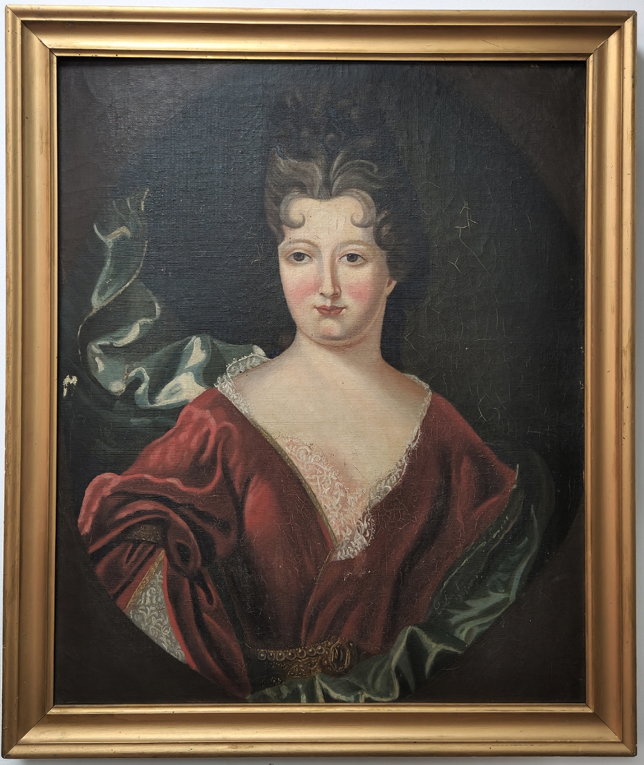 פורטרט עתיק, מסוף המאה ה-19, שמן על בד בדמות אישה לבושה אדום וירוק, לא חתום
