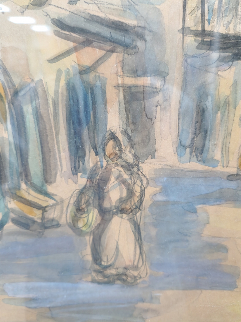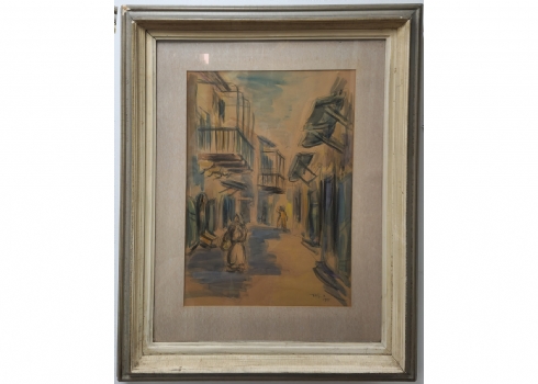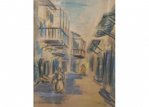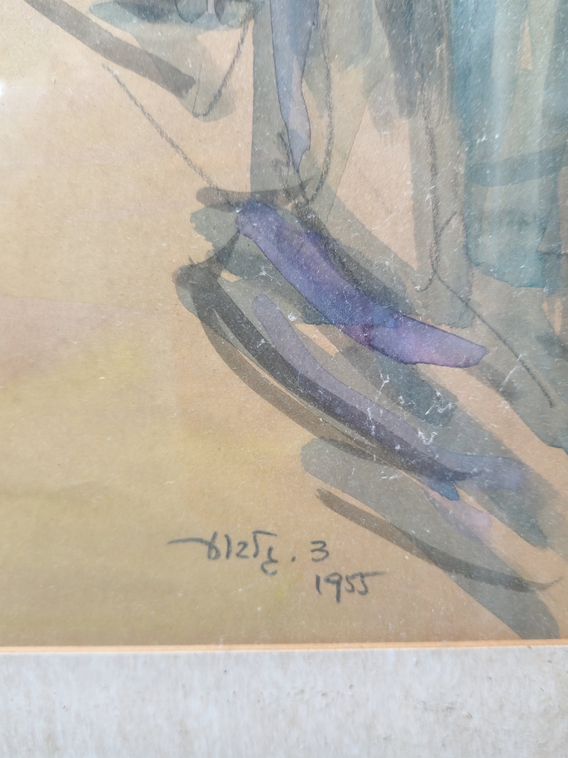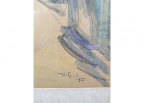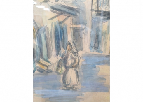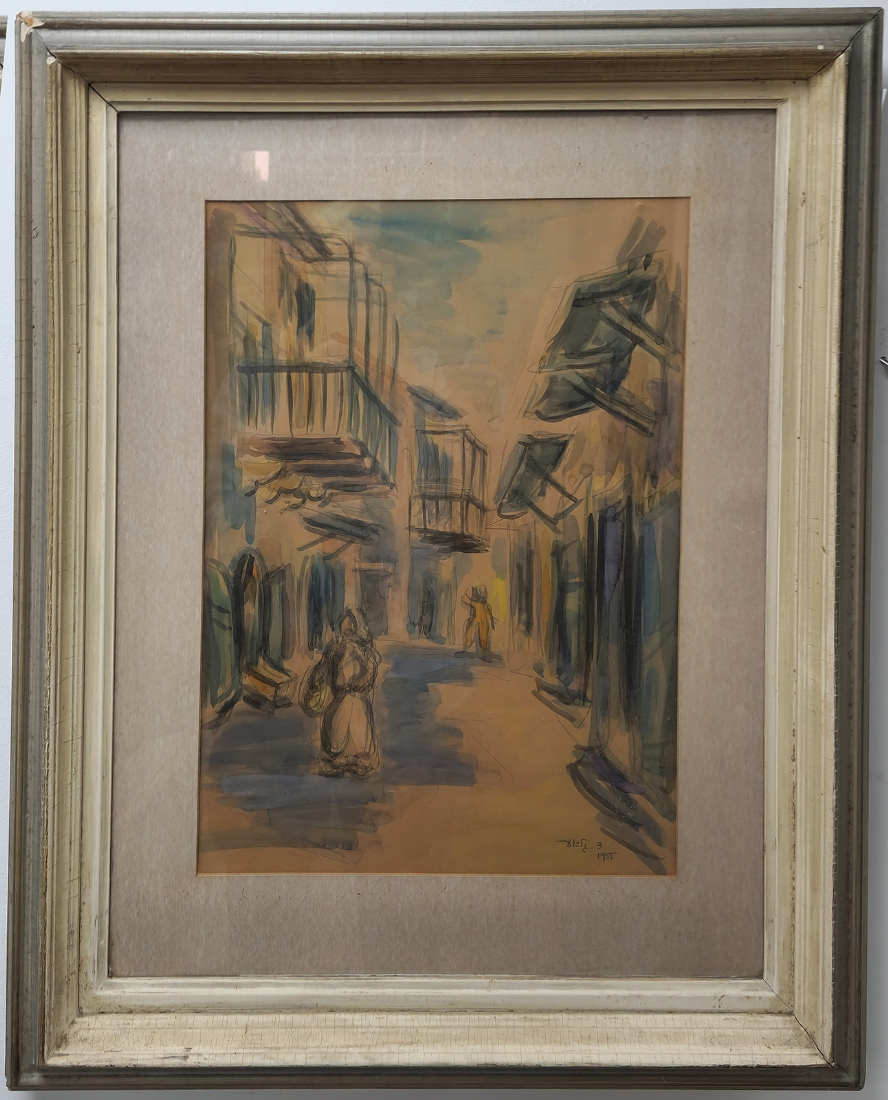 דוד גלבוע (David Gilboa) 'דמויות ביפו', רישום עיפרון ואקוורל על נייר, חתום
