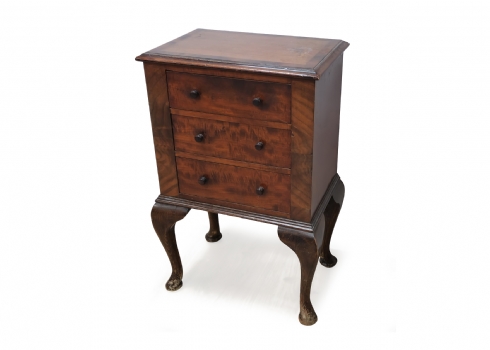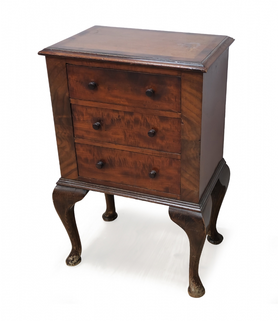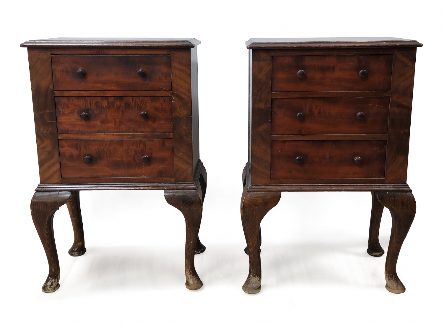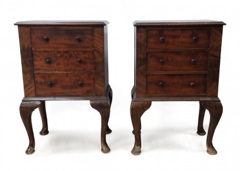 כל אחת עם שלוש מגירות וידיות כפתור תואמותגובה: 59 ס"מרוחב: 38 ס"מעומק: 25 ס"מלאחת כתם שיפשופים ברגליים, פגם לחלק העליון, מצב בהתאם לגיל