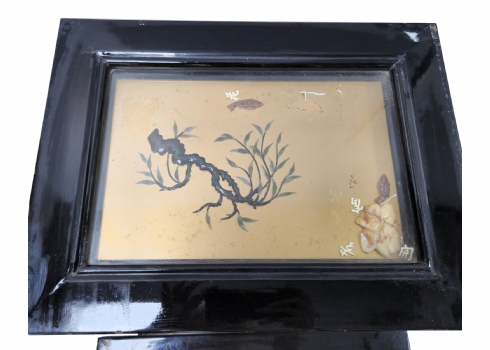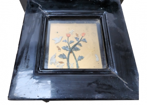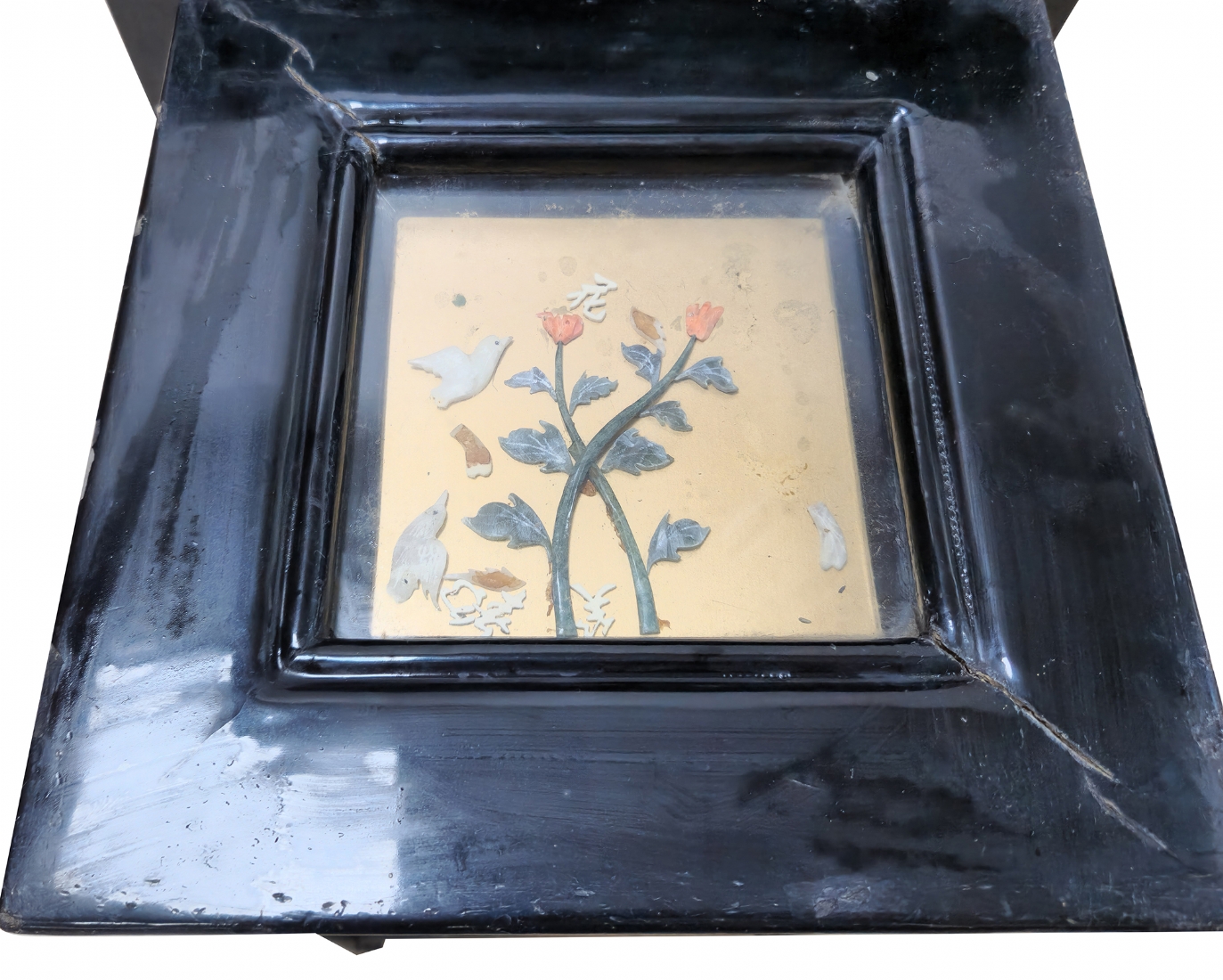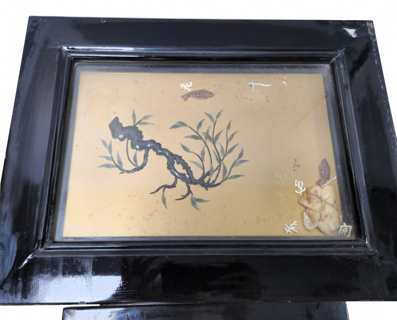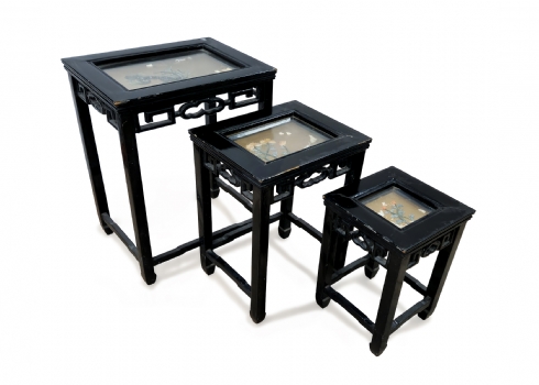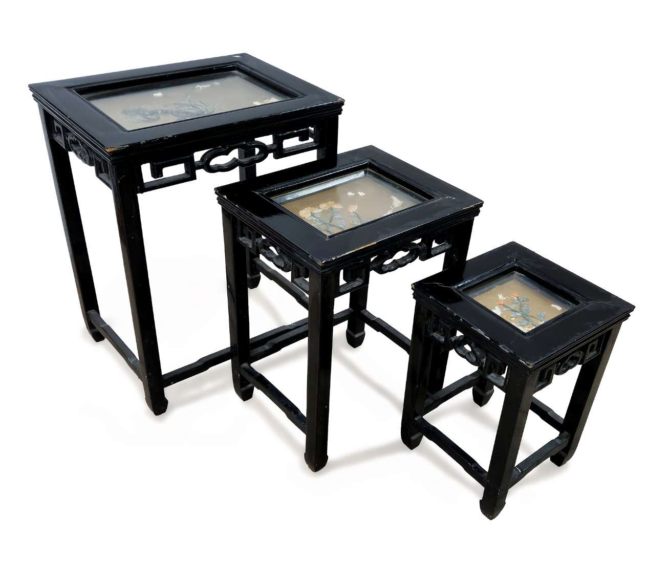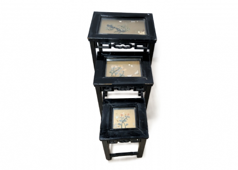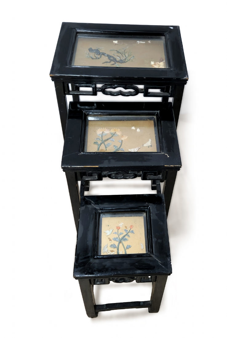 סט של שלושה שולחנות נערמים יפניים בלכה שחורה עם עיטורי אבנים טבעיות משובצות