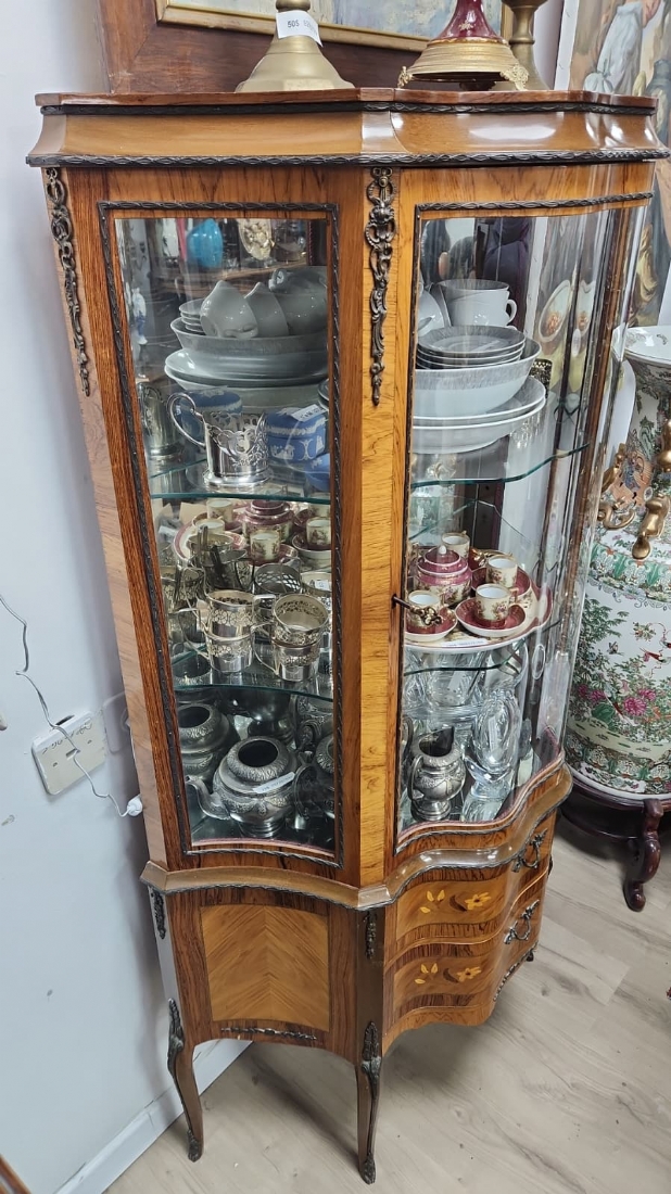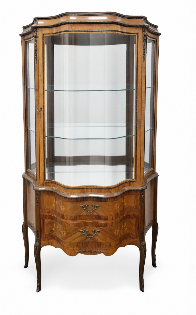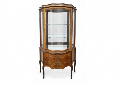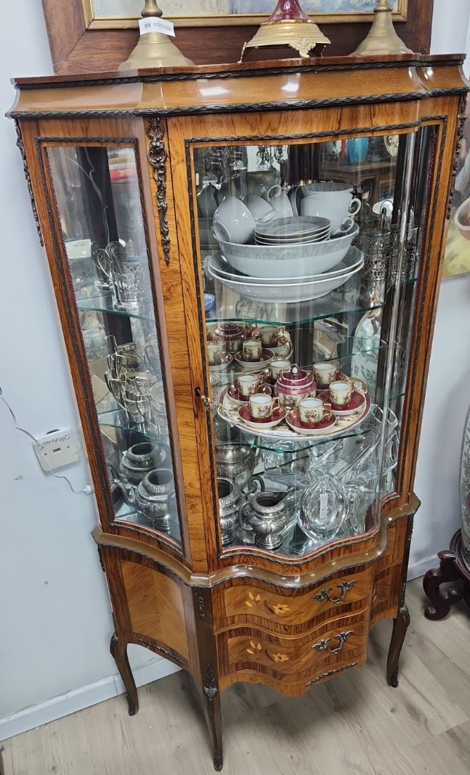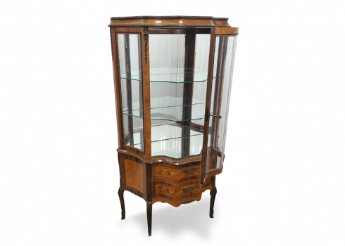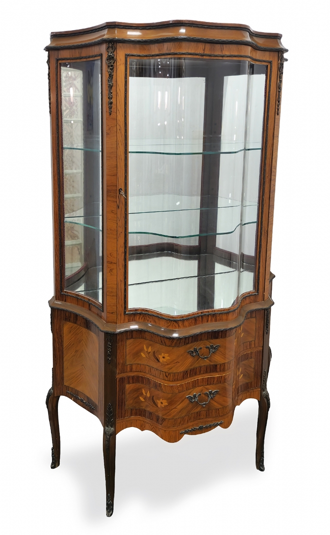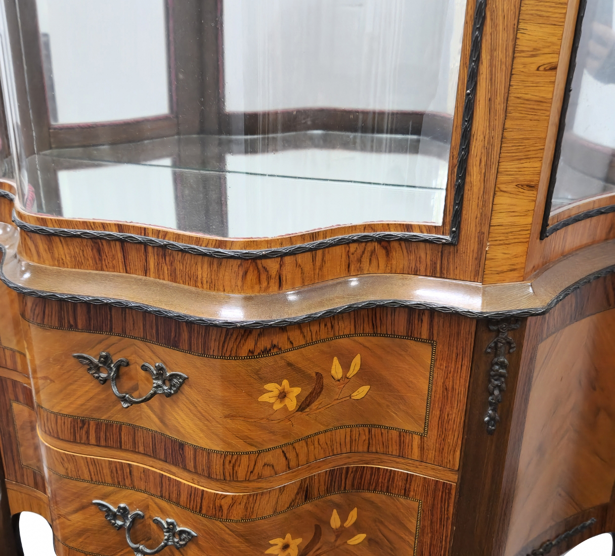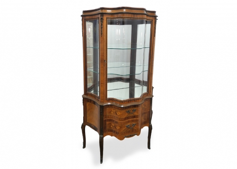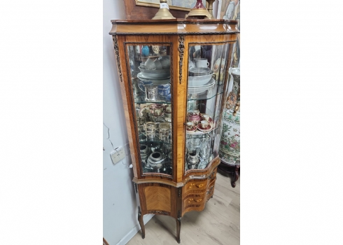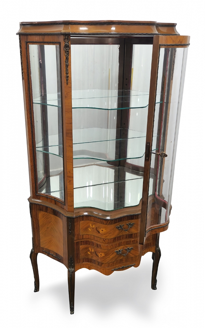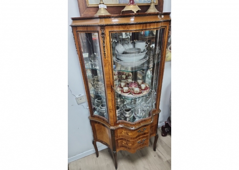ויטרינה גדולה עשויה עץ בשיבוץ מרקטרי בסגנון עתיק עם מדפי זכוכית מגלוונת