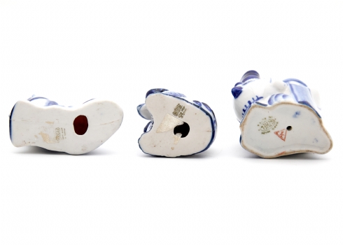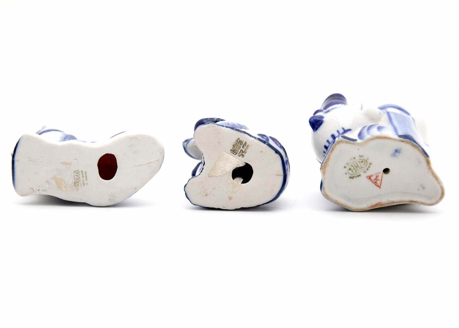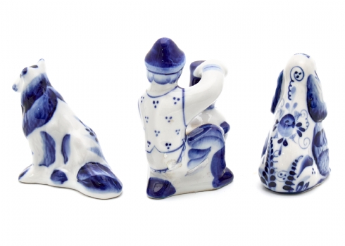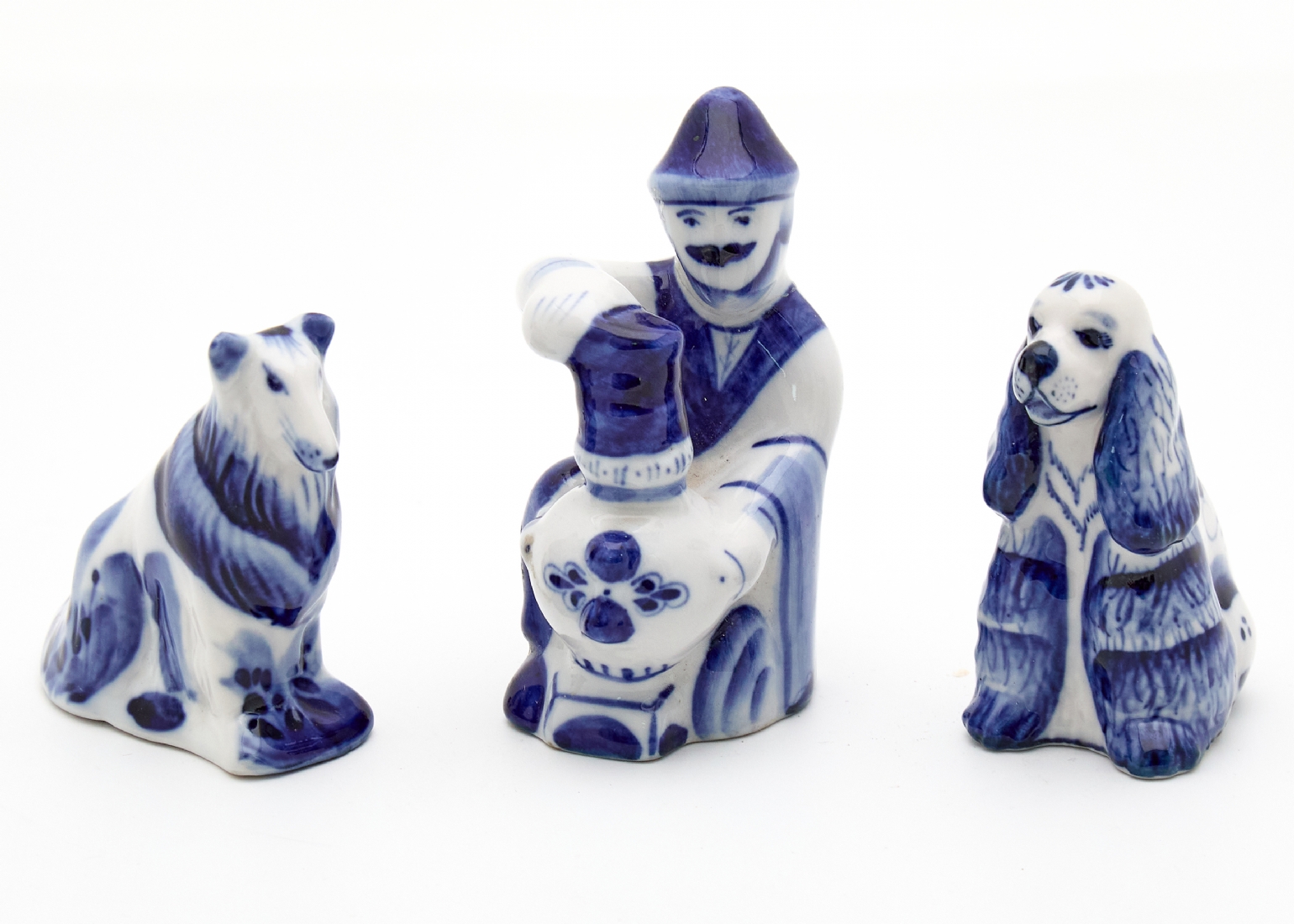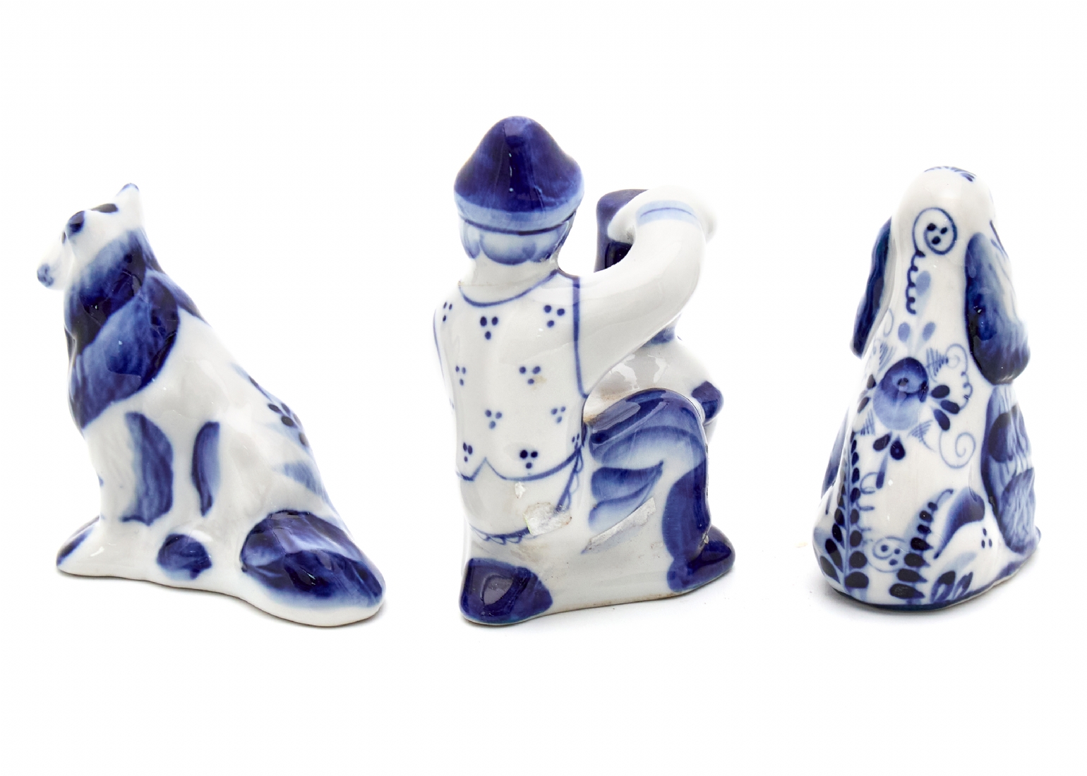 שלוש דמויות גז׳ל 'Gzhel' מקרמיקה מצוירת בעבודת יד בגווני כחול-לבן