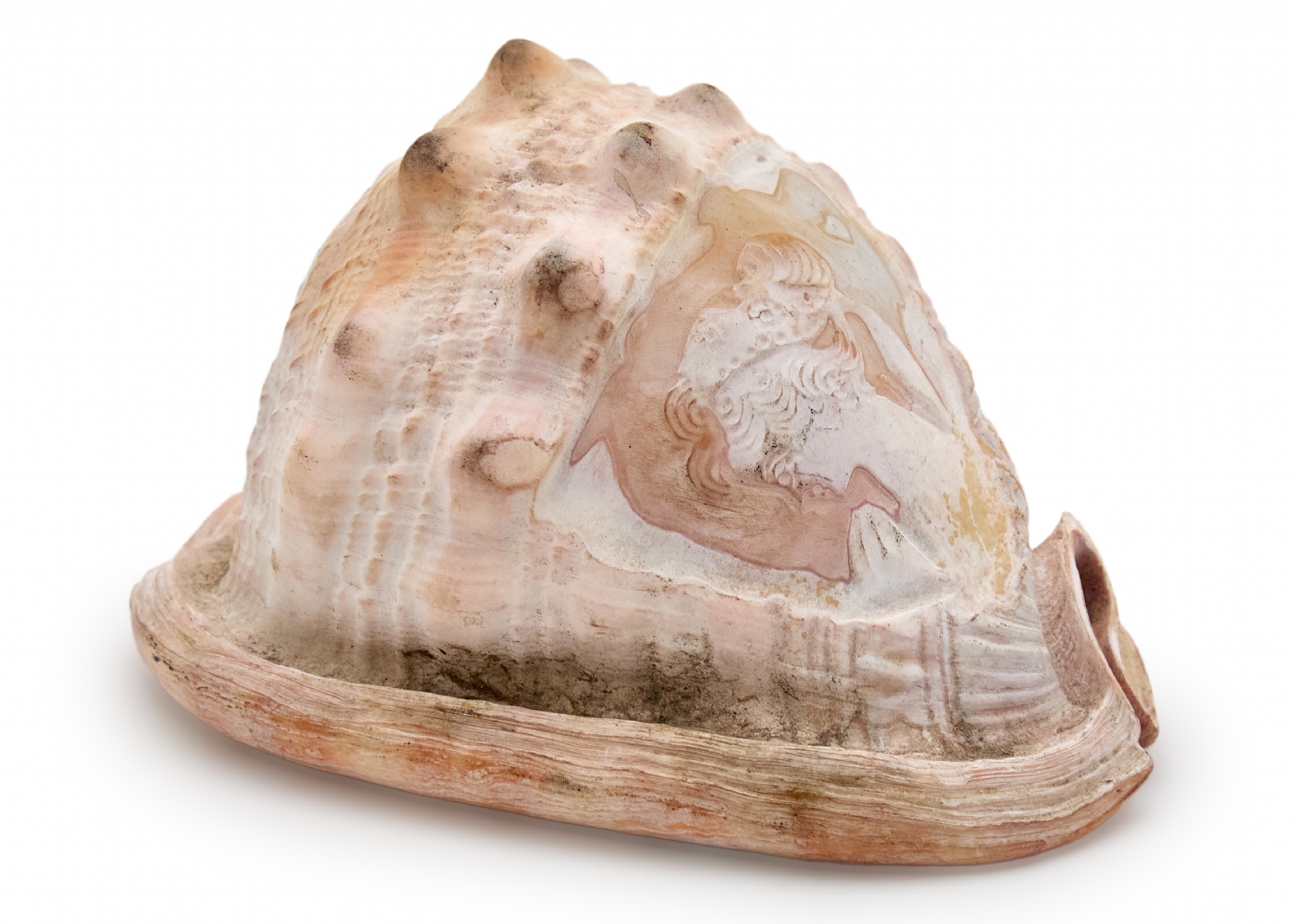 קונכייה טבעית מגולפת (קמאו) עם תבליט דמות נשית