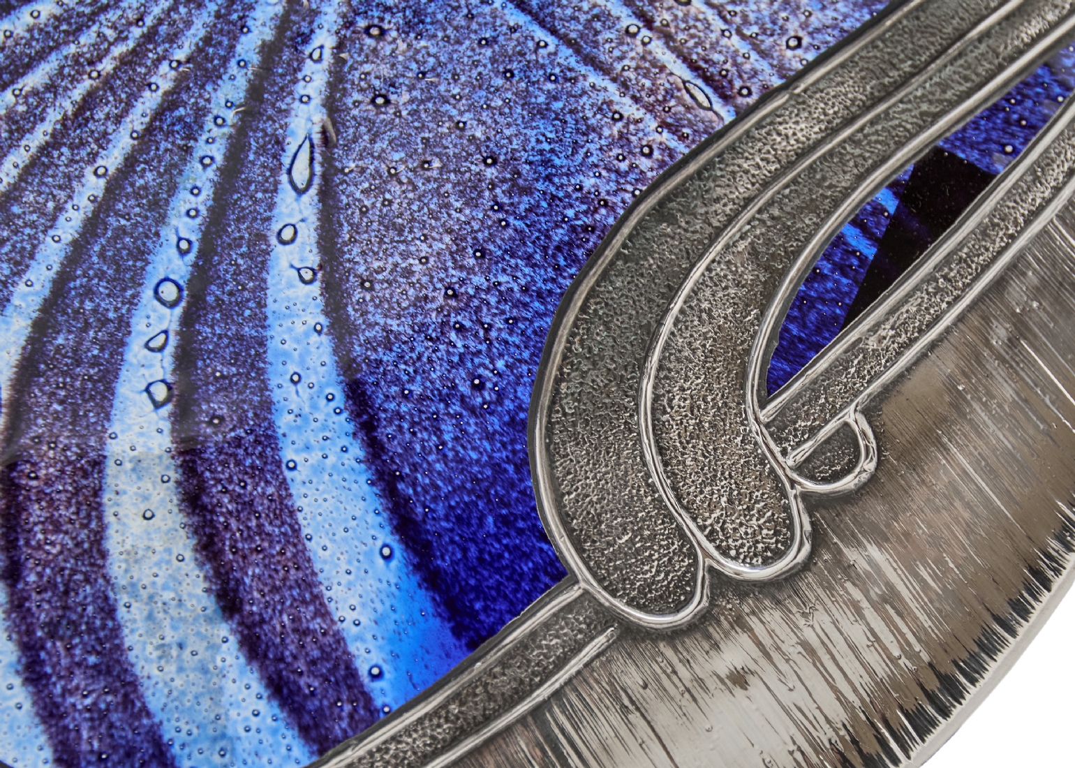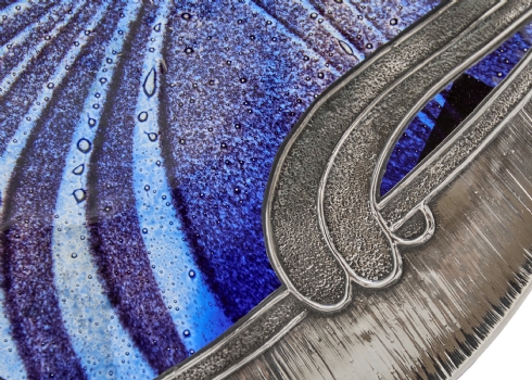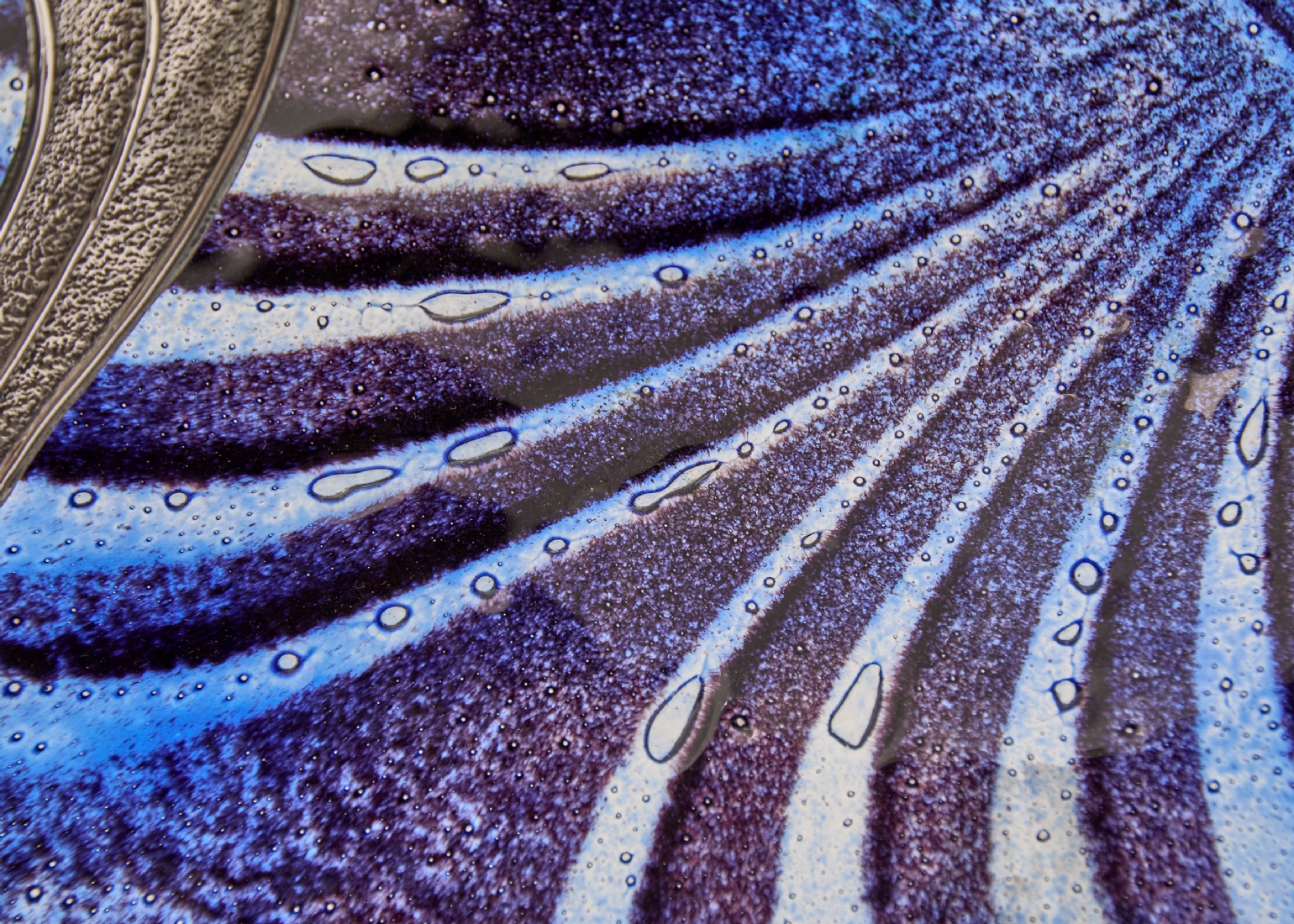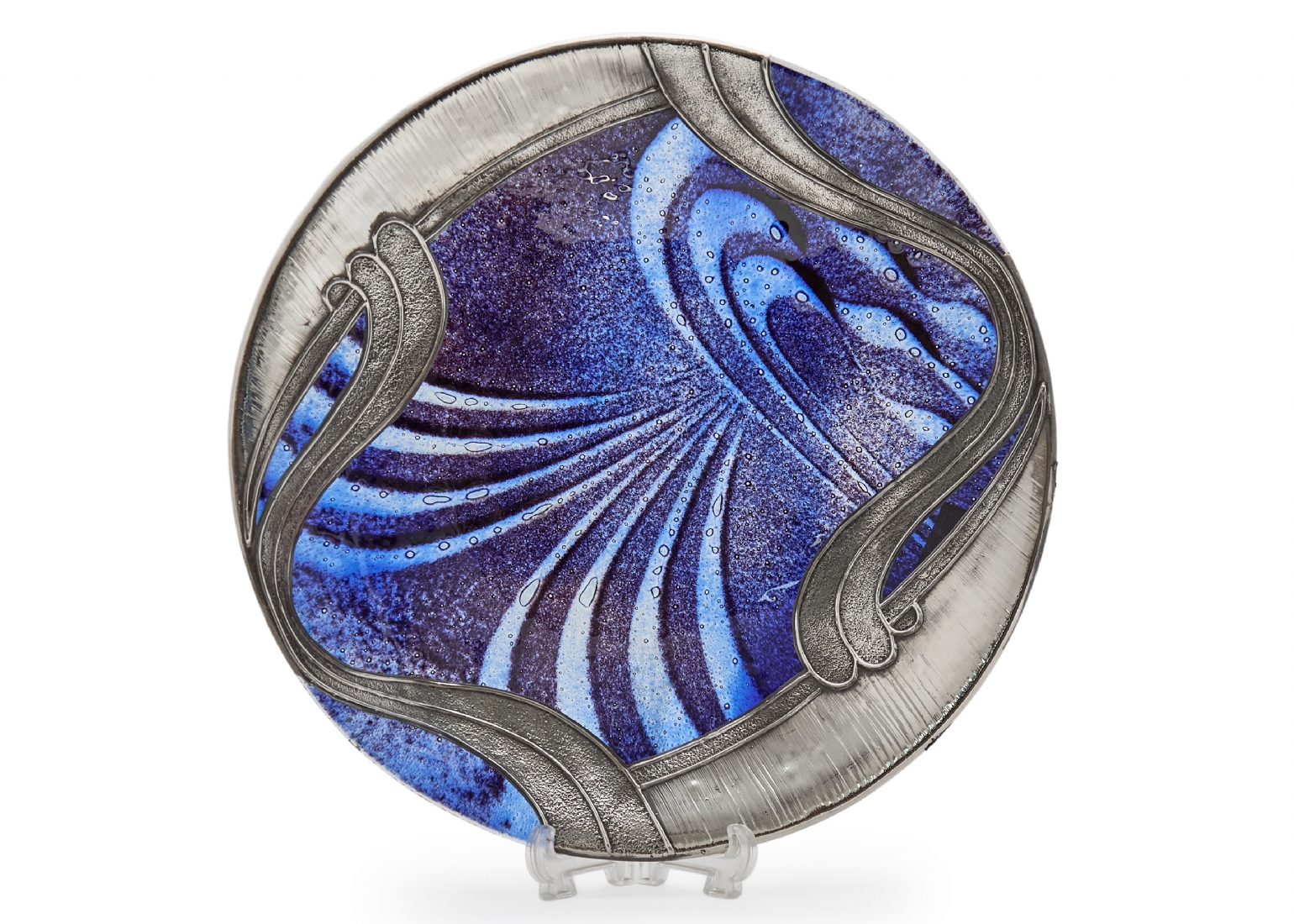 צלחת נוי עשויה זכוכית כחולה עם אלמנטים דקורטיביים מכסף