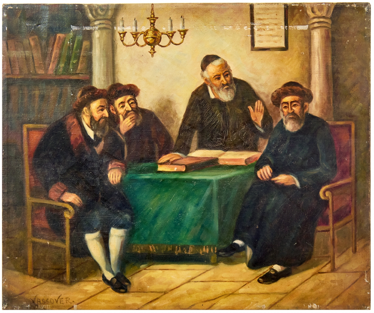 יעקוב ווסובר (Jacob Vassover) - 'ארבעה דתיים סביב שולחן', שמן על בד, חתום