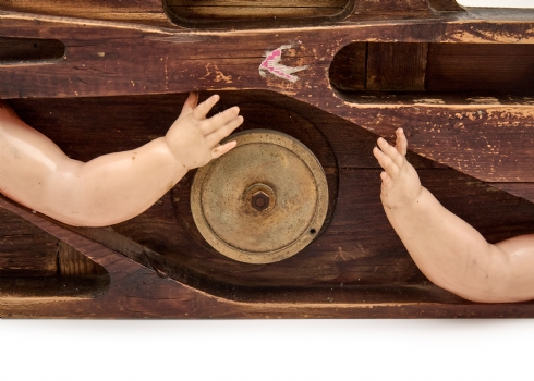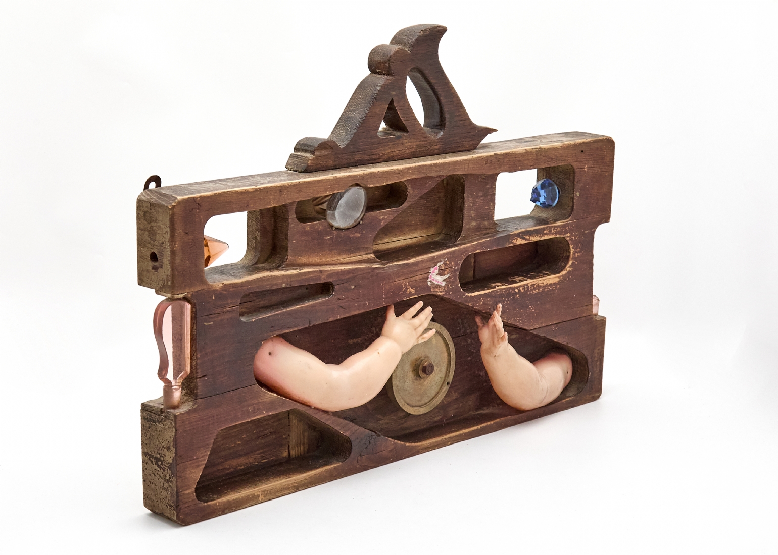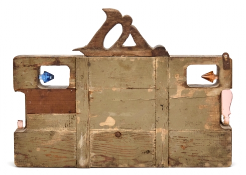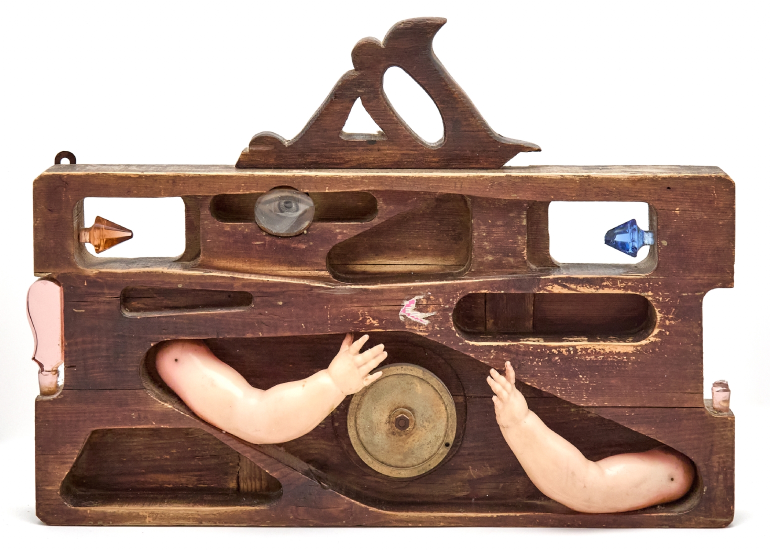 דן בן אמוץ ׳היד מסובבת והעין צופה׳ 1970, פסל עץ וגרוטאות גדול, חתום.
