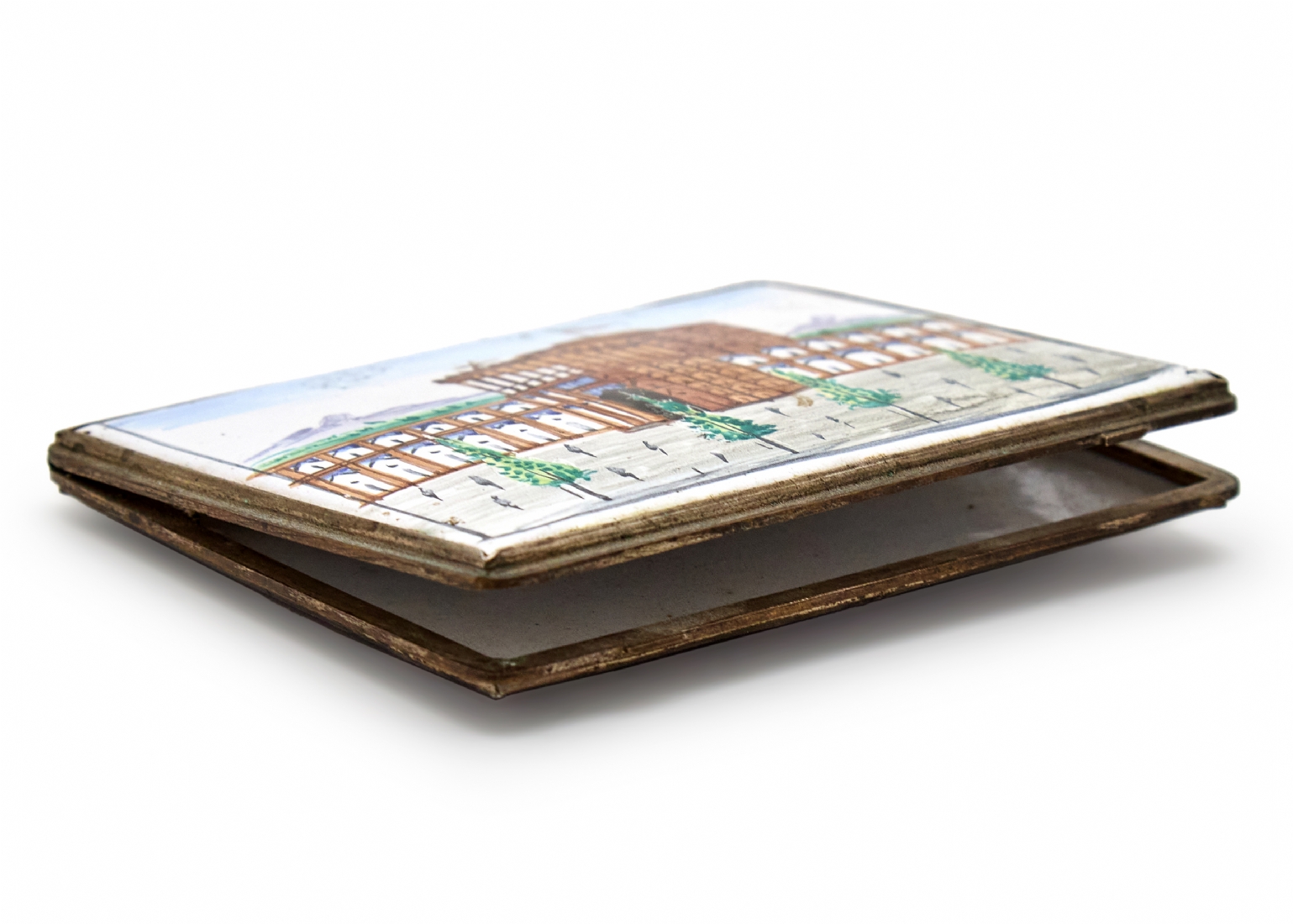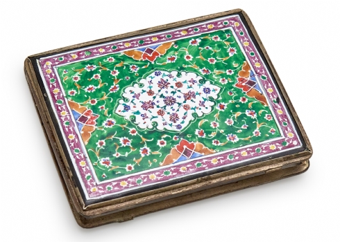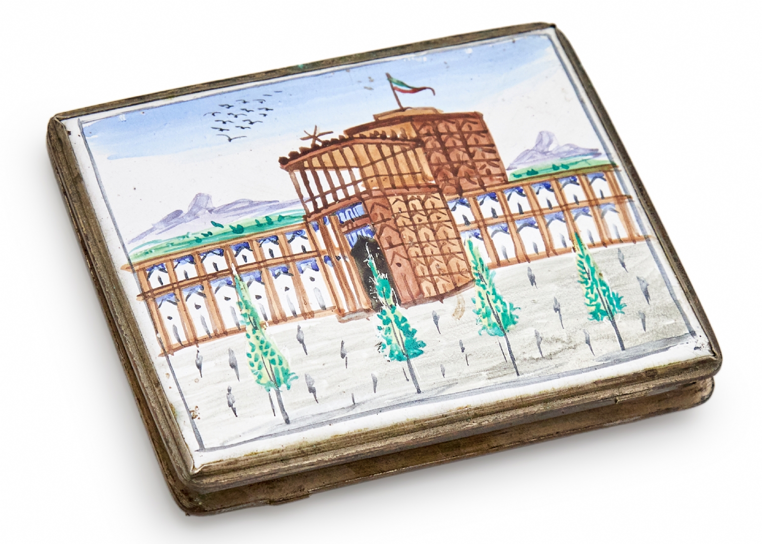 קופסת סיגריות פרסית עתיקה מצופה אמייל עיטור אדריכלי מצויר ביד