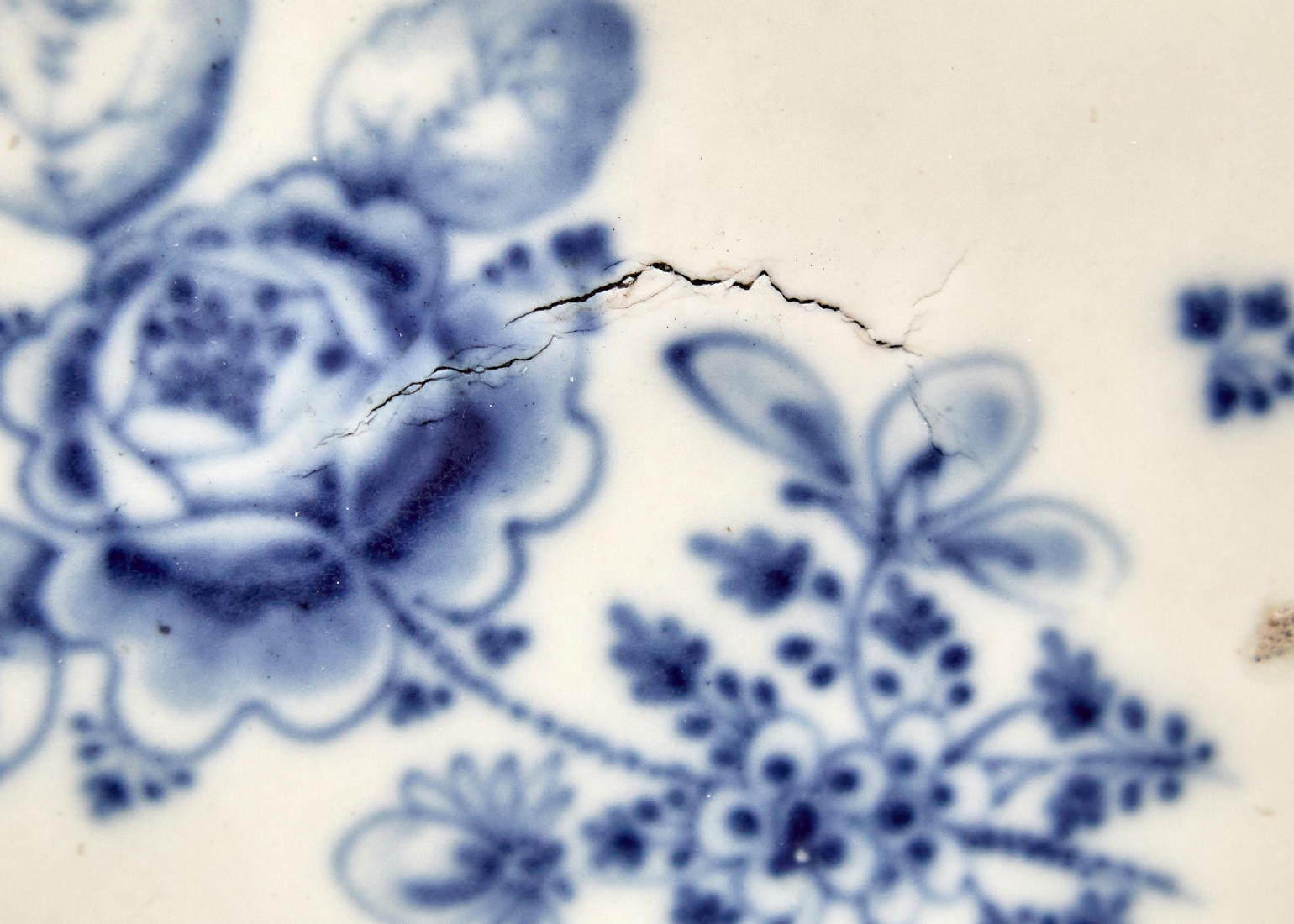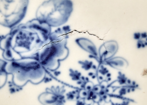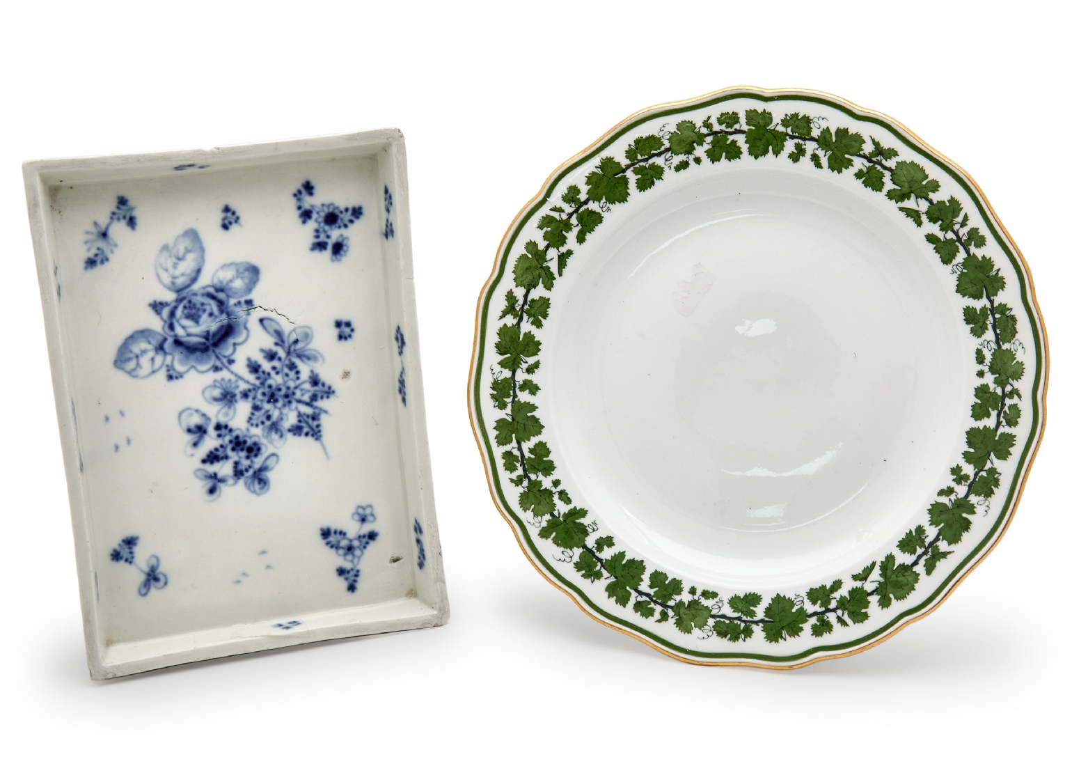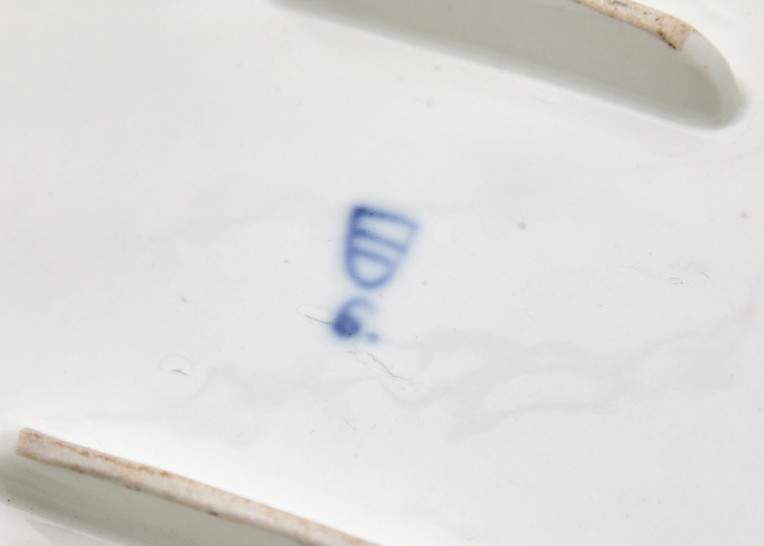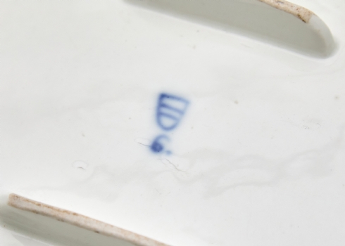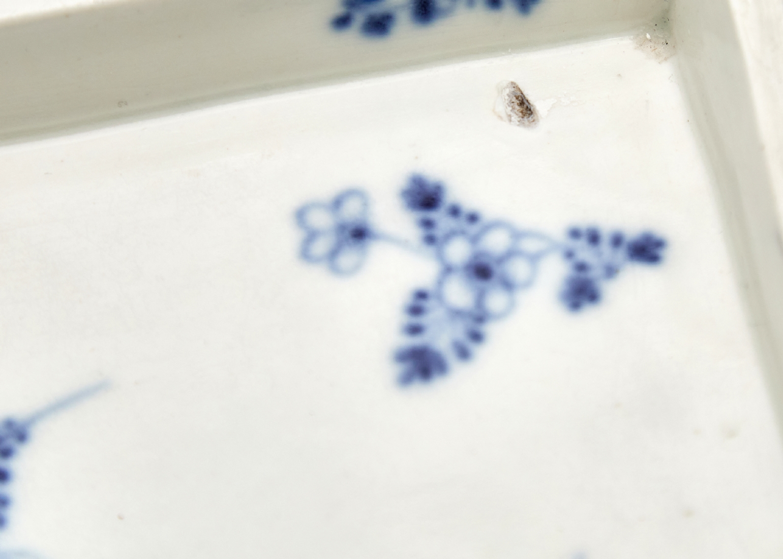 כלי פורצלן מלבני אוסטרי עתיק, המחצית הראשונה של המאה ה-19, מתוצרת וינה (Vienna), מעוטר ציורי יד בכחול קובלט, פגמים ביצור, תיקונים ישנים לשפה ופגם (עקום)