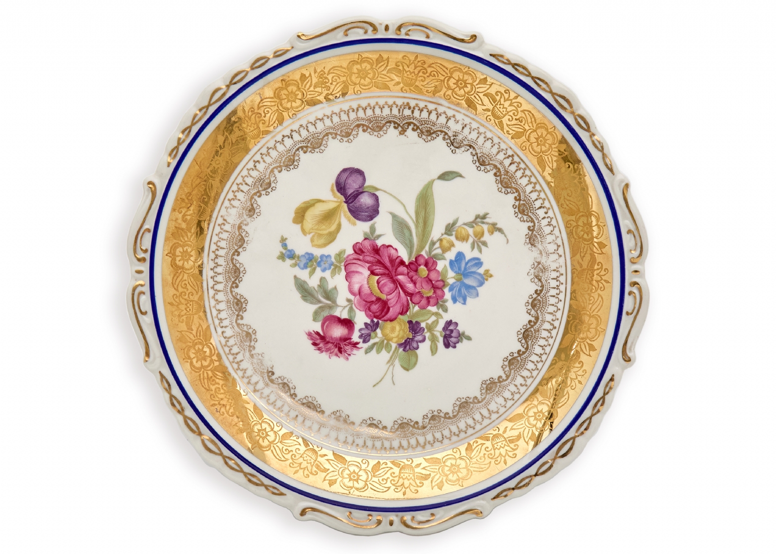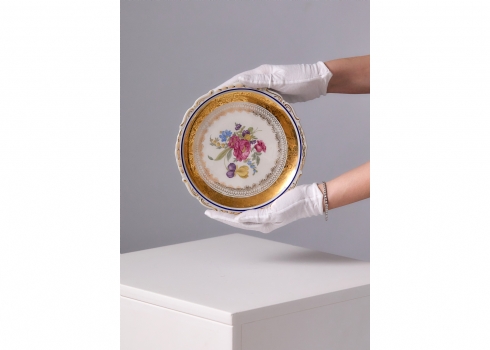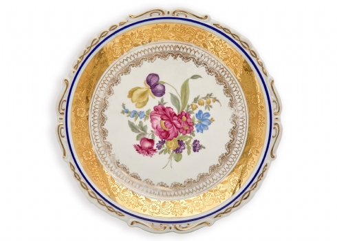 הצלחת מעוטרת זר פרחים צבעוני ועדין במרכז, מוקף מסגרת זהב עשירה ומפורטת